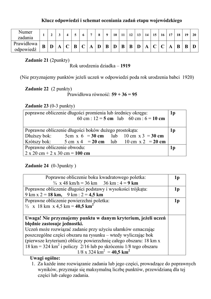 Klucz odpowiedzi i schemat oceniania zadań etapu wojewódzkiego Numer 1 2 3 4 5 6 7 8 9 10 11 12 13 14 15 16 17 18 19 20 zadania Prawidłowa B D A C B C A D B D B B D A C C A B B D odpowiedź Zadanie 21 (2punkty) Rok urodzenia dziadka – 1919 (Nie przyznajemy punktów jeŜeli uczeń w odpowiedzi poda rok urodzenia babci 1920) Zadanie 22 (2 punkty) Prawidłowa równość: 59 + 36 = 95 Zadanie 23 (0-3 punkty) poprawne obliczenie długości promienia lub średnicy okręgu: 60 cm : 12 = 5 cm lub 60 cm : 6 = 10 cm 1p Poprawne obliczenie długości boków duŜego prostokąta: 1p DłuŜszy bok: 5cm x 6 = 30 cm lub 10 cm x 3 = 30 cm Krótszy bok: 5 cm x 4 = 20 cm lub 10 cm x 2 = 20 cm Poprawne obliczenie obwodu: 1p 2 x 20 cm + 2 x 30 cm = 100 cm Zadanie 24 (0-3punkty ) Poprawne obliczenie boku kwadratowego poletka: ¾ x 48 km/h = 36 km 36 km : 4 = 9 km Poprawne obliczenie długości podstawy i wysokości trójkąta: 9 km x 2 = 18 km, 9 km : 2 = 4,5 km Poprawne obliczenie powierzchni poletka: ½ x 18 km x 4,5 km = 40,5 km2 1p 1p 1p Uwaga! Nie przyznajemy punktu w danym kryterium, jeŜeli uczeń błędnie zastosuje jednostki. Uczeń moŜe rozwiązać zadanie przy uŜyciu ułamków oznaczając poszczególne części obszaru na rysunku – wtedy wyliczając bok (pierwsze kryterium) obliczy powierzchnię całego obszaru: 18 km x 18 km = 324 km2 i policzy 2/16 lub po skróceniu 1/8 tego obszaru 1/8 x 324 km2 = 40,5 km2 Uwagi ogólne: 1. Za kaŜde inne rozwiązanie zadania lub jego części, prowadzące do poprawnych wyników, przyznaje się maksymalną liczbę punktów, przewidzianą dla tej części lub całego zadania.