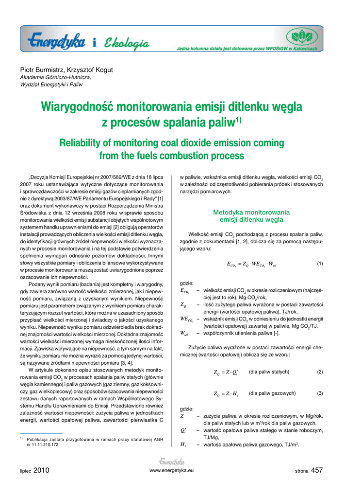 Piotr Burmistrz, Krzysztof Kogut Akademia Górniczo-Hutnicza, Wydział Energetyki i Paliw Wiarygodność monitorowania emisji ditlenku węgla z procesów spalania paliw1) Reliability of monitoring coal dioxide emission coming from the fuels combustion process „Decyzja Komisji Europejskiej nr 2007/589/WE z dnia 18 lipca 2007 roku ustanawiająca wytyczne dotyczące monitorowania i sprawozdawczości w zakresie emisji gazów cieplarnianych zgodnie z dyrektywą 2003/87/WE Parlamentu Europejskiego i Rady” [1] oraz dokument wykonawczy w postaci Rozporządzenia Ministra Środowiska z dnia 12 września 2008 roku w sprawie sposobu monitorowania wielkości emisji substancji objętych wspólnotowym systemem handlu uprawnieniami do emisji [2] obligują operatorów instalacji prowadzących obliczenia wielkości emisji ditlenku węgla, do identyfikacji głównych źródeł niepewności wielkości wyznaczanych w procesie monitorowania i na tej podstawie potwierdzenia spełnienia wymagań odnośnie poziomów dokładności. Innymi słowy wszystkie pomiary i obliczenia bilansowe wykorzystywane w procesie monitorowania muszą zostać uwiarygodnione poprzez oszacowanie ich niepewności. Podany wynik pomiaru (badania) jest kompletny i wiarygodny, gdy zawiera zarówno wartość wielkości zmierzonej, jak i niepewność pomiaru, związaną z uzyskanym wynikiem. Niepewność pomiaru jest parametrem związanym z wynikiem pomiaru charakteryzującym rozrzut wartości, które można w uzasadniony sposób przypisać wielkości mierzonej i świadczy o jakości uzyskanego wyniku. Niepewność wyniku pomiaru odzwierciedla brak dokładnej znajomości wartości wielkości mierzonej. Dokładna znajomość wartości wielkości mierzonej wymaga nieskończonej ilości informacji. Zjawiska wpływające na niepewność, a tym samym na fakt, że wyniku pomiaru nie można wyrazić za pomocą jedynej wartości, są nazywane źródłami niepewności pomiaru [3, 4]. W artykule dokonano opisu stosowanych metodyk monitorowania emisji CO2 w procesach spalania paliw stałych (głównie węgla kamiennego) i paliw gazowych (gaz ziemny, gaz koksowniczy, gaz wielkopiecowy) oraz sposobów szacowania niepewności zestawu danych raportowanych w ramach Wspólnotowego Systemu Handlu Uprawnieniami do Emisji. Przedstawiono również zależność wartości niepewności: zużycia paliwa w jednostkach energii, wartości opałowej paliwa, zawartości pierwiastka C 1) Publikacja została przygotowana w ramach pracy statutowej AGH nr 11.11.210.172 lipiec 2010 w paliwie, wskaźnika emisji ditlenku węgla, wielkości emisji CO2 w zależności od częstotliwości pobierania próbek i stosowanych narzędzi pomiarowych. Metodyka monitorowania emisji ditlenku węgla Wielkość emisji CO2 pochodzącą z procesu spalania paliw, zgodnie z dokumentami [1, 2], oblicza się za pomocą następującego wzoru: (1) gdzie: – wielkość emisji CO2 w okresie rozliczeniowym (najczęściej jest to rok), Mg CO2/rok, – ilość zużytego paliwa wyrażona w postaci zawartości energii (wartości opałowej paliwa), TJ/rok, – wskaźnik emisji CO2 w odniesieniu do jednostki energii (wartości opałowej) zawartej w paliwie, Mg CO2/TJ, – współczynnik utlenienia paliwa [-]. Zużycie paliwa wyrażone w postaci zawartości energii chemicznej (wartości opałowej) oblicza się ze wzoru: (dla paliw stałych) (2) (dla paliw gazowych) (3) gdzie: – zużycie paliwa w okresie rozliczeniowym, w Mg/rok, dla paliw stałych lub w m3/rok dla paliw gazowych, – wartość opałowa paliwa stałego w stanie roboczym, TJ/Mg, – wartość opałowa paliwa gazowego, TJ/m3. www.energetyka.eu strona 457 Zużycie paliwa, w przypadku paliw gazowych, określa się na podstawie pomiaru ilości spalanego gazu za pomocą układów zwężkowych lub za pomocą przepływomierzy turbinowych. Natomiast zużycie węgla kamiennego jest określane metodą bezpośrednią poprzez zastosowanie np. automatycznych wag przenośnikowych. Niektórzy operatorzy instalacji określają zużycie węgla kamiennego metodami bilansowymi, wykorzystując w tym celu następujące równanie bilansowe: (4) gdzie: – wielkość dostaw węgla w okresie rozliczeniowym, która jest określana na podstawie ważenia wagami kolejowymi u dostawcy lub odbiorcy, Mg/rok, – zmiana stanu zapasów węgla na składowisku w ciagu okresu rozliczeniowego, Mg, , – masa węgla na składowisku, odpowiednio na początku i na końcu okresu rozliczeniowego, Mg. Ze względu na sposób składowania węgla, który w warunkach polskich jest magazynowany na składowiskach otwartych, obliczenie masy składowanego węgla odbywa się na podstawie wyników obmiaru geodezyjnego i pomiaru ciężaru objętościowego węgla na składzie. Masa zapasów węgla obliczana jest ze wzoru: (5) gdzie: – objętość składowanego węgla (objętość zwałów, na których jest składowany węgiel), m3, – średni ciężar objętościowy składowanego węgla, Mg/m3. Wskaźnik emisji ditlenku węgla ze spalania paliw wyraża się zazwyczaj w Mg wyemitowanego CO2 w odniesieniu do jednostki wartości opałowej paliwa i jego wielkość oblicza się ze wzoru: lub W przypadku paliw gazowych określenie zawartości pierwiastka C i wartości opałowej odbywa się na podstawie wyznaczenia składu gazu metodami chromatograficznymi. Zawartość pierwiastka C w gazie można obliczyć z następującego wzoru: (7) gdzie: – zawartość i-tego składnika w paliwie gazowym, % vol. – liczba atomów pierwiastka C w i-tym składniku paliwa gazowego. Wartość opałowa paliw gazowych jest obliczana, jako wielkość addytywna, na podstawie wyznaczonego składu gazu i przyjętych z tablic termodynamicznych wartości opałowych poszczególnych składników. Wartości współczynnika emisji ditlenku węgla, jak również wartości opałowe mogą być przyjmowane jako wartości referencyjne publikowane przez IPCC [10, 11]. Wartości referencyjne dla wybranych paliw, na przestrzeni la