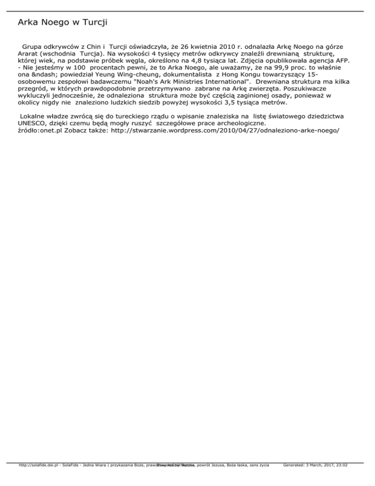 Arka Noego w Turcji Grupa odkrywców z Chin i Turcji oświadczyła, że 26 kwietnia 2010 r. odnalazła Arkę Noego na górze Ararat (wschodnia Turcja). Na wysokości 4 tysięcy metrów odkrywcy znaleźli drewnianą strukturę, której wiek, na podstawie próbek węgla, określono na 4,8 tysiąca lat. Zdjęcia opublikowała agencja AFP. - Nie jesteśmy w 100 procentach pewni, że to Arka Noego, ale uważamy, że na 99,9 proc. to właśnie ona – powiedział Yeung Wing-cheung, dokumentalista z Hong Kongu towarzyszący 15osobowemu zespołowi badawczemu "Noah's Ark Ministries International". Drewniana struktura ma kilka przegród, w których prawdopodobnie przetrzymywano zabrane na Arkę zwierzęta. Poszukiwacze wykluczyli jednocześnie, że odnaleziona struktura może być częścią zaginionej osady, ponieważ w okolicy nigdy nie znaleziono ludzkich siedzib powyżej wysokości 3,5 tysiąca metrów. Lokalne władze zwrócą się do tureckiego rządu o wpisanie znaleziska na listę światowego dziedzictwa UNESCO, dzięki czemu będą mogły ruszyć szczegółowe prace archeologiczne. źródło:onet.pl Zobacz także: http://stwarzanie.wordpress.com/2010/04/27/odnaleziono-arke-noego/ http://solafide.dei.pl - SolaFide - Jedna Wiara | przykazania Boże, prawdziwy Powered kościół by Mambo Jezusa, powrót Jezusa, Boża łaska, sens życia Generated: 3 March, 2017, 23:02