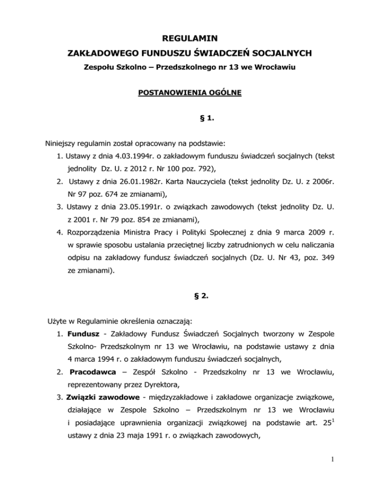 REGULAMIN ZAKŁADOWEGO FUNDUSZU ŚWIADCZEŃ SOCJALNYCH Zespołu Szkolno – Przedszkolnego nr 13 we Wrocławiu POSTANOWIENIA OGÓLNE § 1. Niniejszy regulamin został opracowany na podstawie: 1. Ustawy z dnia 4.03.1994r. o zakładowym funduszu świadczeń socjalnych (tekst jednolity Dz. U. z 2012 r. Nr 100 poz. 792), 2. Ustawy z dnia 26.01.1982r. Karta Nauczyciela (tekst jednolity Dz. U. z 2006r. Nr 97 poz. 674 ze zmianami), 3. Ustawy z dnia 23.05.1991r. o związkach zawodowych (tekst jednolity Dz. U. z 2001 r. Nr 79 poz. 854 ze zmianami), 4. Rozporządzenia Ministra Pracy i Polityki Społecznej z dnia 9 marca 2009 r. w sprawie sposobu ustalania przeciętnej liczby zatrudnionych w celu naliczania odpisu na zakładowy fundusz świadczeń socjalnych (Dz. U. Nr 43, poz. 349 ze zmianami). § 2. Użyte w Regulaminie określenia oznaczają: 1. Fundusz - Zakładowy Fundusz Świadczeń Socjalnych tworzony w Zespole Szkolno- Przedszkolnym nr 13 we Wrocławiu, na podstawie ustawy z dnia 4 marca 1994 r. o zakładowym funduszu świadczeń socjalnych, 2. Pracodawca – Zespół Szkolno - Przedszkolny nr 13 we Wrocławiu, reprezentowany przez Dyrektora, 3. Związki zawodowe - międzyzakładowe i zakładowe organizacje związkowe, działające w Zespole Szkolno – Przedszkolnym nr 13 we Wrocławiu i posiadające uprawnienia organizacji związkowej na podstawie art. 251 ustawy z dnia 23 maja 1991 r. o związkach zawodowych, 1 4. Reprezentatywne organizacje związkowe - międzyzakładowe organizacje związkowe zrzeszające odpowiednia ilość członków, będących pracownikami szkoły, wymagana do uzyskania reprezentatywności zakładowej zgodnie z art. 24125a Kodeksu pracy, 5. Emeryci i renciści, byli pracownicy zakładu - osoby posiadające aktualny status emeryta lub rencisty (z tytułu niezdolności do pracy), którzy przed uzyskaniem świadczenia emerytalnego (rentowego) rozwiązali stosunek pracy ze Szkołą Podstawową nr 67 lub Przedszkolem nr 30 we Wrocławiu, w związku z przejściem na emeryturę lub rentę, 6. Komisja Socjalna - zespół utworzony przez Pracodawcę i związki zawodowe (powołany zarządzeniem pracodawcy) do uzgadniania przyznawanych w oparciu o Regulamin Funduszu, świadczeń osobom uprawnionym. W skład Komisji Socjalnej wchodzą: a) po jednym przedstawicielu, delegowanym przez każdą działającą w szkole organizację związkową, uprawnionym do zajmowania stanowiska w jej imieniu, w sprawach dotyczących przyznawania świadczeń socjalnych osobom uprawnionym, b) po jednym przedstawicielu każdej placówki ZSP nr 13 delegowanym przez Pracodawcę, uprawnionym do zajmowania stanowiska w jego imieniu w sprawach, o których mowa w pkt a. § 3. 1. Działalność socjalna jest prowadzona w oparciu o niniejszy Regulamin. 2. Przyznawanie świadczeń oraz wysokość dopłat z Funduszu uzależnia się od sytuacji życiowej, rodzinnej i materialnej osoby uprawnionej do korzystania z Funduszu. 3. Wszystkie osoby zamierzające skorzystać w danym roku kalendarzowym ze świadczeń z Zakładowego Funduszu Świadczeń Socjalnych powinny złożyć, w nieprzekraczalnym terminie do 5 maja każdego roku przedstawicielowi Dyrektora, o którym mowa w § 2 ust. 6 pkt a. Regulaminu, oświadczenie o dochodach, stanowiące załącznik nr 1 do niniejszego Regulaminu. 2 4. Do dnia 5 maja danego roku świadczenia są przyznawane w oparciu o oświadczenie z roku poprzedniego, chyba że uprawniony złoży wcześniej nowe oświadczenie. 5. Komisja Socjalna rozpatrująca wnioski o przyznanie świadczenia z Funduszu, w razie powzięcia wątpliwości co do wiarygodności danych przedstawionych w oświadczeniu o dochodach (załącznik Nr 1) lub we wniosku (zał. Nr 4), może zażądać od składającego takie oświadczenie lub wniosek dokumentów potwierdzających te dane (np. PIT-11; zaświadczenie o dochodach pracownika z innego zakładu pracy, dochodach współmałżonka, zaświadczenia o uczęszczaniu dziecka do szkoły, decyzji Powiatowego Urzędu Pracy o wysokości pobieranego zasiłku dla bezrobotnych lub przyznaniu statusu bezrobotnego bez prawa do zasiłku, decyzji o przyznaniu emerytury lub renty lub zasiłku – świadczenia przedemerytalnego wraz z ostatnią decyzją waloryzacyjną itp.), decyzji o przyznanym świadczeniu kompensacyjnym. § 4. 1. Przyznawanie uprawnionym świadczeń z Funduszu w oparciu o Regulamin odbywa się na wniosek: samego uprawnionego, przełożonego lub organizacji związkowej i jest uzgadniane ze związkami zawodowymi, w ramach działającej Komisji Socjalnej, a następnie zatwierdzane do wypłaty przez pracodawcę, co oznacza, że uzgodnienie to wyczerpuje ustawowy obowiązek wynikający z art. 27 ust. 2 ustawy o związkach zawodowych. 2. Wnioski o świadczenie z Funduszu, wg wzoru stanowiącego załącznik nr 2, 3 i 4 do Regulaminu, składane są przez osoby uprawnione przedstawicielowi Dyrektora w Komisji Socjalnej, w dowolnym terminie roku kalendarzowego (w zależności od potrzeb osoby ubiegającej się o pomoc) z wyjątkiem wniosków o dofinansowanie wypoczynku, które powinny być złożone do 20 maja każdego roku i wniosków o pomoc finansową z okazji Świat Bożego Narodzenia, które powinny być złożone do 30 listopada każdego roku. 3. Prawidłowo złożony wniosek powinien być zaopiniowany przez Dyrektora Szkoły i rozpatrzony przez Komisję Socjalną w terminie do 14 dni od jego złożenia, a wypłata świadczenia w terminie do 14 dni od decyzji Pracodawcy o przyznaniu świadczenia. 3 4. Komisję Socjalną powołuje zarządzeniem Pracodawca zgodnie z zasadami określonymi w § 2 ust. 6 Regulaminu. 5. Komisja Socjalna działa według zasad przyjętych przez jej członków. II. ZASADY TWORZENIA FUNDUSZU I ADMINISTROWANIE JEGO ŚRODKAMI 1. Środki funduszu będą przekazywane na konto Funduszu w dwóch ratach: do 31.05–75% funduszu przysługującego na dany rok; do 30.09 - pozostałe 25%. 2. Środki funduszu niewykorzystane w danym roku przechodzą n
