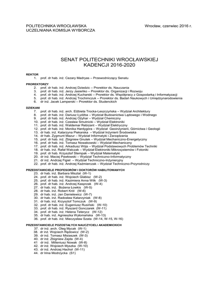 POLITECHNIKA WROCŁAWSKA UCZELNIANA KOMISJA WYBORCZA Wrocław, czerwiec 2016 r. SENAT POLITECHNIKI WROCŁAWSKIEJ KADENCJI 2016-2020 REKTOR 1. prof. dr hab. inż. Cezary Madryas – Przewodniczący Senatu PROREKTORZY 2. 3. 4. 5. 6. prof. dr hab. inż. Andrzej Dziedzic – Prorektor ds. Nauczania prof. dr hab. inż. Jerzy Jasieńko – Prorektor ds. Organizacji i Rozwoju prof. dr hab. inż. Andrzej Kucharski – Prorektor ds. Współpracy z Gospodarką i Informatyzacji prof. dr hab. inż. Andrzej Trochimczuk – Prorektor ds. Badań Naukowych i Umiędzynarodowienia dr inż. Jacek Lamperski – Prorektor ds. Studenckich DZIEKANI 7. 8. 9. 10. 11. 12. 13. 14. 15. 16. 17. 18. 19. 20. 21. 22. prof. dr hab. inż. arch. Elżbieta Trocka-Leszczyńska – Wydział Architektury prof. dr hab. inż. Dariusz Łydżba – Wydział Budownictwa Lądowego i Wodnego prof. dr hab. inż. Andrzej Ożyhar – Wydział Chemiczny prof. dr hab. inż. Czesław Smutnicki – Wydział Elektroniki prof. dr hab. inż. Waldemar Rebizant – Wydział Elektryczny prof. dr hab. inż. Monika Hardygóra – Wydział Geoinżynierii, Górnictwa i Geologii dr hab. inż. Katarzyna Piekarska – Wydział Inżynierii Środowiska dr hab. Zygmunt Mazur – Wydział Informatyki i Zarządzania prof. dr hab. inż. Zbigniew Gnutek – Wydział Mechaniczno-Energetyczny prof. dr hab. inż. Tomasz Nowakowski – Wydział Mechaniczny prof. dr hab. inż. Arkadiusz Wójs – Wydział Podstawowych Problemów Techniki dr hab. inż. Rafał Walczak – Wydział Elektroniki Mikrosystemów i Fotoniki prof. dr hab. Krzysztof Stempak – Wydział Matematyki dr inż. Maciej Pawłowski – Wydział Techniczno-Informatyczny dr inż. Andrzej Figiel – Wydział Techniczno-Inżynieryjny prof. dr hab. inż. Andrzej Kaźmierczak – Wydział Techniczno-Przyrodniczy PRZEDSTAWICIELE PROFESORÓW I DOKTORÓW HABILITOWANYCH 23. 24. 25. 26. 27. 28. 29. 30. 31. 32. 33. 34. 35. 36. dr hab. inż. Barbara Misztal (W-1) prof. dr hab. inż. Wojciech Glabisz (W-2) prof. dr hab. inż. Kazimiera Anna Wilk (W-3) prof. dr hab. inż. Andrzej Kasprzak (W-4) dr hab. inż. Bożena Łowkis (W-5) dr hab. inż. Robert Król (W-6) dr hab. inż. Jan Danielewicz (W-7) dr hab. inż. Radosław Katarzyniak (W-8) dr hab. inż. Krzysztof Tomczuk (W-9) prof. dr hab. inż. Eugeniusz Rusiński (W-10) prof. dr hab. inż. Ryszard Gonczarek (W-11) prof. dr hab. inż. Helena Teterycz (W-12) dr hab. inż. Agnieszka Wyłomańska (W-13) prof. dr hab. inż. Mieczysław Szata (W-14, W-15, W-16) PRZEDSTAWICIELE POZOSTAŁYCH NAUCZYCIELI AKADEMICKICH 37. 38. 39. 40. 41 42. 43. 44. dr inż. arch. Oleg Mycak (W-1) dr inż. Wojciech Rędowicz (W-2) dr inż. Tomasz Misiaszek (W-3) dr inż. Zbigniew Zajda (W-4) dr inż. Milleniusz Nowak (W-8) dr inż. Wojciech Myszka (W-10) dr inż. Andrzej Hachoł (W-11) dr Irina Modrzycka (S1) PRZEDSTAWICIELE PRACOWNIKÓW NIEBĘDĄCYCH NAUCZYCIELAMI AKADEMICKIMI 45. 46. 47. 48. mgr Małgorzata Bucki (ACA/DOK) mgr inż. Anna Kozłowska (ACA/DG) mgr inż. Grzegorz Kozłowski (W-8) mgr inż. Michał Skalny (PRS/DDS) PRZEDSTAWICIELE STUDENTÓW I DOKTORANTÓW 49. 50. 51. 52. 53. 54. 55. 56. 57. 58. 59. 60. mgr inż. Tomasz Dobosz – doktorant (W-10) inż. arch. Magdalena Grzegorzewska (W-1) Kamil Rogalski (W-2) Paulina Kowaliszyn (W-3) inż. Agnieszka Wątrucka (W-4) Karolina Podlasiak (W-6) Agnieszka Rogala (W-7) Karolina Zborowska, lic. (W-8) Albert Kulawiak (W-9) Ferdynand Sadowski (W-10) Łukasz Wieloch (W-13) Łukasz Wojdyła (W-16)