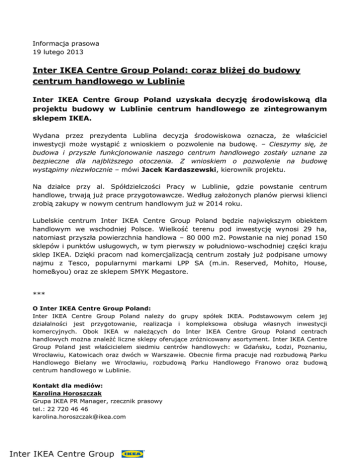 Informacja prasowa 19 lutego 2013 Inter IKEA Centre Group Poland: coraz bliżej do budowy centrum handlowego w Lublinie Inter IKEA Centre Group Poland uzyskała decyzję środowiskową dla projektu budowy w Lublinie centrum handlowego ze zintegrowanym sklepem IKEA. Wydana przez prezydenta Lublina decyzja środowiskowa oznacza, że właściciel inwestycji może wystąpić z wnioskiem o pozwolenie na budowę. – Cieszymy się, że budowa i przyszłe funkcjonowanie naszego centrum handlowego zostały uznane za bezpieczne dla najbliższego otoczenia. Z wnioskiem o pozwolenie na budowę wystąpimy niezwłocznie – mówi Jacek Kardaszewski, kierownik projektu. Na działce przy al. Spółdzielczości Pracy w Lublinie, gdzie powstanie centrum handlowe, trwają już prace przygotowawcze. Według założonych planów pierwsi klienci zrobią zakupy w nowym centrum handlowym już w 2014 roku. Lubelskie centrum Inter IKEA Centre Group Poland będzie największym obiektem handlowym we wschodniej Polsce. Wielkość terenu pod inwestycję wynosi 29 ha, natomiast przyszła powierzchnia handlowa – 80 000 m2. Powstanie na niej ponad 150 sklepów i punktów usługowych, w tym pierwszy w południowo-wschodniej części kraju sklep IKEA. Dzięki pracom nad komercjalizacją centrum zostały już podpisane umowy najmu z Tesco, popularnymi markami LPP SA (m.in. Reserved, Mohito, House, home&you) oraz ze sklepem SMYK Megastore. *** O Inter IKEA Centre Group Poland: Inter IKEA Centre Group Poland należy do grupy spółek IKEA. Podstawowym celem jej działalności jest przygotowanie, realizacja i kompleksowa obsługa własnych inwestycji komercyjnych. Obok IKEA w należących do Inter IKEA Centre Group Poland centrach handlowych można znaleźć liczne sklepy oferujące zróżnicowany asortyment. Inter IKEA Centre Group Poland jest właścicielem siedmiu centrów handlowych: w Gdańsku, Łodzi, Poznaniu, Wrocławiu, Katowicach oraz dwóch w Warszawie. Obecnie firma pracuje nad rozbudową Parku Handlowego Bielany we Wrocławiu, rozbudową Parku Handlowego Franowo oraz budową centrum handlowego w Lublinie. Kontakt dla mediów: Karolina Horoszczak Grupa IKEA PR Manager, rzecznik prasowy tel.: 22 720 46 46 [email protected]