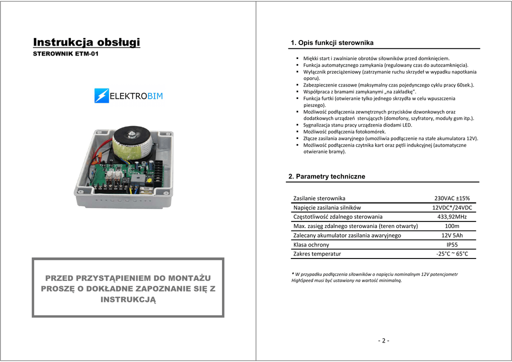 Instrukcja obsługi STEROWNIK ETM-01 1. Opis funkcji sterownika Miękki start i zwalnianie obrotów siłowników przed domknięciem. Funkcja automatycznego zamykania (regulowany czas do autozamknięcia). Wyłącznik przeciążeniowy (zatrzymanie ruchu skrzydeł w wypadku napotkania oporu). Zabezpieczenie czasowe (maksymalny czas pojedynczego cyklu pracy 60sek.). Współpraca z bramami zamykanymi „na zakładkę”. Funkcja furtki (otwieranie tylko jednego skrzydła w celu wpuszczenia pieszego). Możliwość podłączenia zewnętrznych przycisków dzwonkowych oraz dodatkowych urządzeń sterujących (domofony, szyfratory, moduły gsm itp.). Sygnalizacja stanu pracy urządzenia diodami LED. Możliwość podłączenia fotokomórek. Złącze zasilania awaryjnego (umożliwia podłączenie na stałe akumulatora 12V). Możliwość podłączenia czytnika kart oraz pętli indukcyjnej (automatyczne otwieranie bramy). 2. Parametry techniczne Zasilanie sterownika Napięcie zasilania silników Częstotliwość zdalnego sterowania Max. zasięg zdalnego sterowania (teren otwarty) Zalecany akumulator zasilania awaryjnego Klasa ochrony Zakres temperatur PRZED PRZYSTĄPIENIEM DO MONTAŻU PROSZĘ O DOKŁADNE ZAPOZNANIE SIĘ Z INSTRUKCJĄ 230VAC ±15% 12VDC*/24VDC 433,92MHz 100m 12V 5Ah IP55 -25°C ~ 65°C * W przypadku podłączenia siłowników o napięciu nominalnym 12V potencjometr HighSpeed musi być ustawiony na wartość minimalną. -2- 3. Opis złącz i wyprowadzeń 2SIDE 1SIDE COM Złącze służące do podłączenia zewnętrznego sterowania tj. przycisk dzwonkowy, domofon itp. 4. Regulacja parametrów pracy HISPEED_TIME (potencjometr) Krótkie zwarcie pomiędzy złączem 2SIDE i COM wyzwala pracę obydwu siłowników. Urządzenie rozpoczyna cykl pracy łagodnym startem (0,7sek), następnie przechodzi w tryb pracy na wysokich obrotach (czas ustalany potencjometrem) po czym obroty silników są zmniejszane o ok. połowę. Praca cykliczna: otwórz-stop-zamknij-stop-otwórz Złącze służące do podłączenia zewnętrznego sterowania tj. przycisk dzwonkowy, domofon itp. Czas pracy na wysokich obrotach powinien być ustawiony tak aby siłowniki zdążyły zwolnić przed końcem cyklu pracy (pełnym otwarciem lub zamknięciem bramy). Krótkie zwarcie pomiędzy złączem 1SIDE i COM wyzwala pracę siłownika podłączonego do MOTO1 (funkcja furtki). Uwaga: Do sterownika można podłączać siłowniki o napięciu nominalnym 12V potencjometr w tym przypadku musi być bezwzględnie ustawiony na wartość minimalną. Regulacja opóźnienia skrzydeł (0~30sek.) – umożliwia opóźnienie pracy skrzydeł względem siebie. Praca cykliczna: otwórz-stop-zamknij-stop-otwórz Wspólna masa (dla przyłącz 1SIDE i 2SIDE) Zasilanie siłownika zamontowanego na skrzydle z zakładką (jeśli brama ją posiada). MOTO2 Zasilanie siłownika zamontowanego na skrzydle bez zakładki. Otwieranie (DELAY) siłownika opóźniane jest o czas ustawiony potencjometrem DELAY. Uwaga: Złącza MOTO1 i MOTO2(DELAY) są przeznaczone do pracy z obciążeniem w postaci silnika prądu stałego. Układ przeciążeniowy nie zabezpiecza centrali przed uszkodzeniem w przypadku bezpośredniego zwarcia na przewodach podłączonych do złącza MOTO1 lub MOTO2. DELAY (potencjometr) MOTO1 Wyprowadzenie na akumulator 12V zasilania awaryjnego. Sterownik samoczynnie doładowuje akumulator. Podłączając akumulator należy zwrócić uwagę na biegunowość. LOCK12 Zasilanie dla elektrozamka 12V. SWIPE_CARD Złącze sygnałowe dla czytnika kart i pętli indukcyjnej. AUTO_CLOSE (potencjometr) MOTOR1 (potencjometr) UPS INFRATRED COM VCC Ustala czas pracy na wysokich obrotach (0~33sek.). MOTOR2 (potencjometr) Krótkie zwarcie pomiędzy SWIPE_CARD i COM powoduje otwieranie bramy, po czym brama zostaje automatycznie zamknięta. Złącze sygnałowe fotokomórek. Krótkie zwarcie pomiędzy INFRATRED i COM informuje sterownik o napotkaniu przeszkody. Jeśli sygnał napotkania przeszkody pojawi się w trakcie zamykania - skrzydła zostaną zatrzymane, a następnie wywołana zostanie procedura otwierania. Wspólna masa dla przyłącz SWIPE_CARD, INFRARED i VCC Dodatni biegun zasilania dla fotokomórek i dodatkowych odbiorników napięcia (napięcie ~12VDC, max. obciążenie 200mA) ALARM_LAMP Wyprowadzenie styków zwiernych przekaźnika załączającego lampę sygnalizacyjną. Lampa powinna być wyposażona w przerywacz. -3- LEARN (przycisk) Funkcja wykorzystywana w przypadku bram z tzw. zakładką, dla bram bez zakładki potencjometr powinien być ustawiony na minimum. Regulacja czasu po którym brama zostanie automatycznie zamknięta. W przypadku potencjometru ustawionego na minimum funkcja autozamykania jest wyłączona. Regulacja wyłącznika przeciążeniowego dla złącza zasilającego siłownik MOTO1. Od ustawienia potencjometru zależy z jaką siłą siłownik będzie dociągał skrzydło do odbojnika. Regulację należy przeprowadzić od niskich ustawień i stopniowo je zwiększać, aż do uzyskania żądanej siły. Regulacja wyłącznika przeciążeniowego dla złącza zasilającego siłownik MOTO2. Od ustawienia potencjometru zależy z jaką siłą siłownik będzie dociągał skrzydło do odbojnika. Regulację należy przeprowadzić od niskich ustawień i stopniowo je zwiększać, aż do uzyskania żądanej siły. Służy do wgrywania i kasowanie pilotów z pamięci centrali: wgrywanie nowego pilota: nacisnąć i przytrzymać przez ok. 1sek przycisk LEARN w centrali, dioda STNB_LED zgaśnie, w tym momencie należy nacisnąć jeden z przycisków w pilocie zdalnego sterowania. Dioda STNB_LED błyśnie mignie 2 razy (pilot został zapamiętany przez centralę). kasowanie pilotów z pamięci centrali: nacisnąć i przytrzymać przez ok. 5sek przycisk LEARN. W tym czasie dioda STNB_LED zgaśnie i zaświeci się ponownie (wszystkie piloty zostały usunięte z centrali). -4- 5. Sygnalizacja stanu pracy urządzenia STNB_LED 6. Podłączenie akcesoriów dod