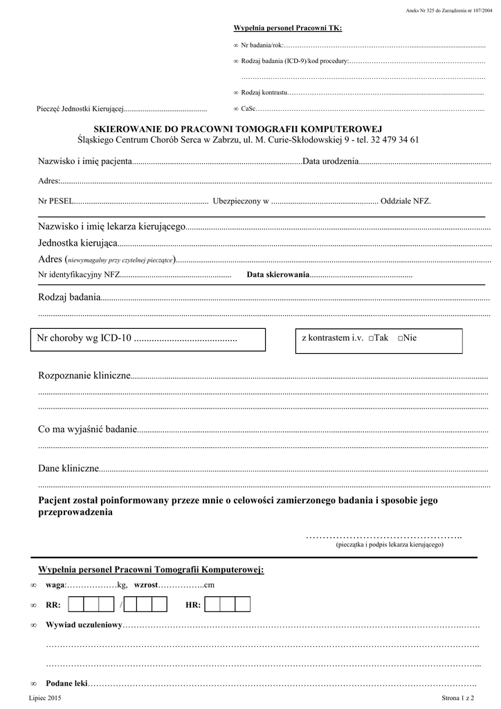 Aneks Nr 325 do Zarządzenia nr 107/2004 Wypełnia personel Pracowni TK: • Nr badania/rok:…………………………………………………............................................ • Rodzaj badania (ICD-9)/kod procedury:……………………………………………………. ………………………………………………………………………………………………. • Rodzaj kontrastu………………………………………......................................................... Pieczęć Jednostki Kierującej............................................ • CaSc……………………………………………………………………………………….... SKIEROWANIE DO PRACOWNI TOMOGRAFII KOMPUTEROWEJ Śląskiego Centrum Chorób Serca w Zabrzu, ul. M. Curie-Skłodowskiej 9 - tel. 32 479 34 61 Nazwisko i imię pacjenta.................................................................................Data urodzenia............................................................... Adres:............................................................................................................................................................................................................. Nr PESEL................................................................ Ubezpieczony w ................................................... Oddziale NFZ. Nazwisko i imię lekarza kierującego................................................................................................................................................. Jednostka kierująca.................................................................................................................................................................................. Adres (niewymagalny przy czytelnej pieczątce)...................................................................................................................................................... Nr identyfikacyjny NFZ..................................................... Data skierowania................................................. Rodzaj badania......................................................................................................................................................................................... ....................................................................................................................................................................................................................... Nr choroby wg ICD-10 ......................................... z kontrastem i.v. □Tak □Nie Rozpoznanie kliniczne.......................................................................................................................................................................... ...................................................................................................................................................................................................................... ...................................................................................................................................................................................................................... Co ma wyjaśnić badanie....................................................................................................................................................................... ...................................................................................................................................................................................................................... Dane kliniczne......................................................................................................................................................................................... ....................................................................................................................................................................................................................... Pacjent został poinformowany przeze mnie o celowości zamierzonego badania i sposobie jego przeprowadzenia ……………………………………….. (pieczątka i podpis lekarza kierującego) Wypełnia personel Pracowni Tomografii Komputerowej: • waga:………………kg, wzrost……………..cm • RR: • Wywiad uczuleniowy………………………………………………………………………………………………………….……. / / HR: ……………………………………………………………………………………………………………………………………….. ………………………………………………………………………………………………………………………………………... • Podane leki…………………………………………………………………………………………………………………………. Lipiec 2015 Strona 1 z 2 Aneks Nr 325 do Zarządzenia nr 107/2004 Planowana data i godzina badania: ................................................................................................................................ Dodatkowe informacje: ...................................................................................................................................................... ………………………………………………………………………………………………………………………………. ………………………………………………………………………………………………………………………………. ……………………………………………………………………………………… INFORMACJA DLA OSOBY BADANEJ Badanie polega na prześwietleniu promieniami rentgenowskimi struktury badanej okolicy np. głowy, kręgosłupa, jamy brzusznej, czy kończyn dolny