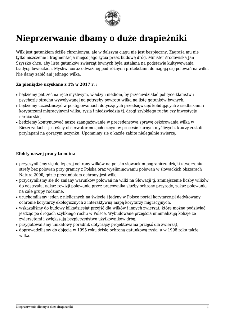 Nieprzerwanie dbamy o duże drapieżniki Wilk jest gatunkiem ściśle chronionym, ale w dalszym ciągu nie jest bezpieczny. Zagraża mu nie tylko niszczenie i fragmentacja miejsc jego życia przez budowę dróg. Minister środowiska Jan Szyszko chce, aby lista gatunków zwierząt łownych była ustalana na podstawie kultywowania tradycji łowieckich. Myśliwi coraz odważniej pod różnymi pretekstami domagają się polowań na wilki. Nie damy zabić ani jednego wilka. Za pieniądze uzyskane z 1% w 2017 r. : ● ● ● będziemy patrzeć na ręce myśliwym, władzy i mediom, by przeciwdziałać polityce kłamstw i psychozie strachu wywoływanej na potrzeby powrotu wilka na listę gatunków łownych, będziemy uczestniczyć w postępowaniach dotyczących przedsięwzięć kolidujących z siedliskami i korytarzami migracyjnymi wilka, rysia i niedźwiedzia tj. drogi szybkiego ruchu czy inwestycje narciarskie, będziemy kontynuować nasze zaangażowanie w precedensową sprawę oskórowania wilka w Bieszczadach - jesteśmy obserwatorem społecznym w procesie karnym myśliwych, którzy zostali przyłapani na gorącym uczynku. Upomnimy się o każde zabite nielegalnie zwierzę. Efekty naszej pracy to m.in.: ● ● ● ● ● ● przyczyniliśmy się do lepszej ochrony wilków na polsko-słowackim pograniczu dzięki utworzeniu strefy bez polowań przy granicy z Polską oraz wyeliminowaniu polowań w słowackich obszarach Natura 2000, gdzie przedmiotem ochrony jest wilk, przyczyniliśmy się do zmiany warunków polowań na wilki na Słowacji tj. zmniejszenie liczby wilków do odstrzału, nakaz rewizji polowania przez pracownika służby ochrony przyrody, zakaz polowania na całe grupy rodzinne, uruchomiliśmy jeden z nielicznych na świecie i jedyny w Polsce portal korytarze.pl dedykowany ochronie korytarzy ekologicznych z interaktywną mapą korytarzy migracyjnych, wskazaliśmy do budowy kilkadziesiąt przejść dla wilków i innych zwierząt, które można podziwiać jeżdżąc po drogach szybkiego ruchu w Polsce. Wybudowane przejścia minimalizują kolizje ze zwierzętami i zwiększają bezpieczeństwo użytkowników dróg, przygotowaliśmy unikatowy poradnik dotyczący projektowania przejść dla zwierząt, doprowadziliśmy do objęcia w 1995 roku ścisłą ochroną gatunkową rysia, a w 1998 roku także wilka. Nieprzerwanie dbamy o duże drapieżniki 1