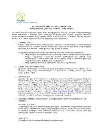 ZAPROSZENIE DO SKŁADANIA OFERT NA Usługi integracji społecznej- szkolenia i wizyty studyjne W ramach środków uzyskanych przez Rząd Rzeczpospolitej Polskiej z kredytu Międzynarodowego Banku Odbudowy i Rozwoju (Bank Światowy) na Poakcesyjny Program Wsparcia Obszarów Wiejskich (PPWOW) Gmina Firlej uzyskała dotację w wysokości 299 314,60 PLN, część tej dotacji w kwocie 29 931,46 PLN przeznacza na realizację niŜej określonych usług. 1. ZAMAWIAJĄCY Gmina Firlej, (zwana dalej Zamawiającym) zaprasza zainteresowanych kwalifikowanych usługodawców do składania ofert na świadczenie wszystkich lub wybranych usług integracji społecznej mieszkańcom Gminy spośród usług opisanych poniŜej. Usługodawcy mogą składać oferty, gdy spełniony jest jeden z poniŜszych warunków: o usługa nie jest powtórzeniem dotychczasowego zakresu działań realizowanych przez danego usługodawcę z udziałem środków publicznych (nie dotyczy usług realizowanych w ramach PPWOW), lub teŜ dotyczy usług świadczonych przez tego usługodawcę na rzecz dodatkowych beneficjentów; o usługa będzie realizowana w partnerstwie z innymi usługodawcami. 2. SPOTKANIE INFORMACYJNE Spotkanie informacyjne dla zainteresowanych, potencjalnych usługodawców odbędzie się w Urzędzie Gminy Firlej ( sala konferencyjna ) ul. Rynek 1, 21-136 Firlej, dnia 20 lutego 2009 roku o godzinie 14.00. 3. PROCEDURA Zgodnie z §3 pkt. 2 Porozumienia o współpracy przy realizacji Poakcesyjnego Programu Wsparcia Obszarów Wiejskich zawartego pomiędzy Zarządem Województwa, w związku z art. 4 ust. 1 lit. a Ustawy z dnia 29 stycznia 2004 r. Prawo zamówień publicznych (Dz. U. z 2007 Nr 233 poz. 1655) wybór usługodawców odbywać się będzie w oparciu o procedurę CPP ((ang.) Community Participation in Procurement – Udział społeczności w zamówieniach) Banku Światowego opisaną w Podręczniku Realizacji Programu Integracji Społecznej dostępnym pod następującym adresem: http://www.ppwow.gov.pl. Podręcznik zawiera równieŜ informacje nt. kosztów kwalifikowanych, podmiotów uprawnionych do świadczenia usług jak równieŜ formularze wykorzystywane w realizacji programu. 4. OPIS PRZEDMIOTU ZAMÓWIENIA (SZCZEGÓŁOWY OPIS POSZCZEGÓLNYCH CZĘŚCI) OFERTY CZĘŚCIOWE Zamawiający dopuszcza składanie ofert częściowych. Oferent moŜe złoŜyć ofertę na jedną lub więcej części. JeŜeli Oferent pragnie złoŜyć ofertę na więcej niŜ jedną część, jest zobowiązany do złoŜenia odrębnych ofert techniczno-finansowych na kaŜdą cześć. Wybór ofert jest dokonywany odrębnie w stosunku do kaŜdej części. WARIANTY Zamawiający nie dopuszcza składania ofert wariantowych. Część I - Wsparcie szkoleniowe Organizacja szkoleń, kursów dla mieszkańców Gminy Firlej z następujących zakresów: • Podstawy funkcjonowania organizacji pozarządowych, wolontariat, • Księgowość organizacji pozarządowych, • Pozyskiwanie środków finansowych na działania prospołeczne, pisanie wniosków i zarządzanie projektami, Wymagania Zamawiającego: 1. objecie szkoleniem min. 10 osób w kaŜdym module 2. grupy szkoleniowe do 20 osób 3. zapewnienie materiałów szkoleniowych dla uczestników szkoleń 4. zapewnienie certyfikatów ukończenia szkoleń 5. zapewnienie drobnych poczęstunków w trakcie szkoleń Termin wykonania zamówienia: od kwiecień 2009 do listopad 2009 Na realizację tych usług przeznacza się maksymalnie kwotę: 14 000,00 zł Usługodawca zobowiązany jest do przedstawienia w ofercie informacji nt. sposobu monitorowania realizacji usług, przewidywanych działań informacyjnych, jak równieŜ informacji dotyczących zapewnienia trwałości podejmowanych działań. Podstawą dla płatności na rzecz usługodawcy będzie rzeczywiście zrealizowana liczba jednostek zdefiniowanych jako: wykonanie usługi – 1 godzina szkolenia. Część II – Organizacja wizyt studyjnych Zorganizowanie co najmniej 4 wizyt studyjnych o tematyce: • zapoznanie z dobrymi praktykami w zakresie działalności organizacji pozarządowych • zapoznanie z działalnością grup wolontariuszy • wspieranie prospołecznych inicjatyw młodzieŜy • aktywizacja mieszkańców, pobudzenie mieszkańców do działania , rozwijanie przedsiębiorczości Wymagania zamawiającego: 1. objecie wizytami studyjnymi min. 15 osób w kaŜdym module 2. zapewnienie zakwaterowania, wyŜywienia i transportu 3. zapewnienie atrakcyjnego, zgodnego z celami wizyty programu Termin wykonania zamówienia: od maj 2009 do październik 2009 Na realizację tych usług przeznacza się maksymalnie kwotę: 15 931,46 zł Usługodawca zobowiązany jest do przedstawienia w ofercie informacji nt. sposobu monitorowania realizacji usług, przewidywanych działań informacyjnych, jak równieŜ informacji dotyczących zapewnienia trwałości podejmowanych działań. Podstawą dla płatności na rzecz usługodawcy będzie rzeczywiście zrealizowana liczba jednostek zdefiniowanych jako: wykonanie usługi – 1 wyjazd studyjny. 5. UPRAWNIENI USŁUGODAWCY Podmiotami uprawnionymi do ubiegania się o zamówienie w ramach niniejszej procedury są: 1. Organizacje pozarządowe (NGOs) 2. Organizacje kościelne 3. Prywatni usługodawcy: Firmy, osoby fizyczne, spółdzielnie socjalne, 4. Samorządy zawodowe, organizacje samorządu gospodarczego, izby rolnicze 5. Jednostki organizacyjne samorządu terytorialnego, stowarzyszenia jst i im podległe jednostki organizacyjne, 6. KRYTERIA OCENY TECHNICZNEJ Cześć I - Wsparcie szkoleniowe a. zgodność z warunkami realizacji i zakresem zamawianych usług b. dysponowanie odpowiednią bazą lokalową (min. 40 m2) z zapleczem sanitarnym na terenie Gminy Firlej, c. dysponowanie wykwalifikowaną kadrą stosownie do specyfiki oferowanych szkoleń Zamawiający oceni spełnienie powyŜszych minimalnych kryteriów technicznych w oparciu o następujące dokumenty/oświadczenia: • • • Program realizacji usługi Oświadczeni