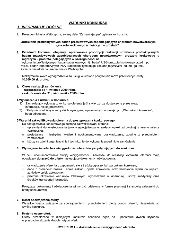 WARUNKI KONKURSU I. INFORMACJE OGÓLNE 1. Prezydent Miasta Wałbrzycha, zwany dalej “Zamawiającym” ogłasza konkurs na: „Udzielanie profilaktycznych badań przesiewowych zapobiegających chorobom nowotworowym gruczołu krokowego u mężczyzn – prostata”. 2. Przedmiot konkursu obejmuje: opracowanie propozycji realizacji udzielania profilaktycznych badań przesiewowych zapobiegających chorobom nowotworowym gruczołu krokowego u mężczyzn – prostata, polegających w szczególności na: wykonaniu profilaktycznych badań przesiewowych tj.: badań USG gruczołu krokowego przed i po mikcji, badań laboratoryjnych PSA. Badaniami tymi objęci zostaną mężczyźni od 50 -go roku życia zamieszkali na terenie miasta Wałbrzycha. Maksymalna kwota wynagrodzenia za usługi określone powyżej nie może przekroczyć kwoty 10.000,00 zł. brutto. 3. Okres realizacji zamówienia: - rozpoczęcie od 1 kwietnia 2009 roku, - zakończenie do 31 października 2009 roku. 4.Wykluczenia z udziału w konkursie. 1) Zamawiający wykluczy z konkursu oferenta jeśli stwierdzi, że dostarczone przez niego informacje, nie są prawdziwe, 2) Oferty nie spełniające wszystkich wymogów, wymienionych w niniejszych „Warunkach konkursu”, będą odrzucone. 5.Warunki zakwalifikowania oferenta do postępowania konkursowego. Do postępowania konkursowego zostaną zakwalifikowani oferenci: • uprawnieni do występowania jako wyspecjalizowane zakłady opieki zdrowotnej z terenu miasta Wałbrzycha, • posiadający niezbędną wiedzę i udokumentowane doświadczenie, zgodne z przedmiotem zamówienia; • którzy są zdolni organizacyjnie i technicznie do wykonania przedmiotu zamówienia. 6. Wymagane świadectwa wiarygodności oferentów przystępujących do konkursu. W celu udokumentowania swojej wiarygodności i zdolności do realizacji kontraktu, oferenci mają obowiązek dołączyć do oferty następujące dokumenty i oświadczenia: • • • oświadczenie oferenta o zapoznaniu się z treścią ogłoszenia i warunkami konkursu, dane o oferencie: nazwa i adres zakładu opieki zdrowotnej oraz kserokopia wpisu do rejestru zakładów opieki zdrowotnej, pisemne określenie warunków lokalowych, wyposażenia w aparaturę i sprzęt medyczny oraz środków transportu i łączności. Powyższe dokumenty i oświadczenia winny być udzielone w formie pisemnej i stanowią załączniki do oferty konkursowej. 7. Koszt sporządzenia oferty. Wszelkie koszty związane ze sporządzeniem i przedłożeniem oferty ponosi oferent, niezależnie od wyniku konkursu. 8. Kryteria oceny ofert. Oferty przedłożone w niniejszym konkursie oceniane będą na w przypadku złożenia dwóch i więcej ofert: podstawie dwóch kryteriów KRYTERIUM I - doświadczenie i wiarygodność oferenta skala punktowa 0 - 10, waga 50% KRYTERIUM II - proponowane wynagrodzenie, skala punktowa 0 –10, waga 50% II. SPORZĄDZANIE OFERT 9. Dokumenty składające się na ofertę. Oferta powinna zawierać następujące dokumenty: a) wypełniony formularz oferty konkursowej, b) wskazanie liczby i kwalifikacji zawodowych osób udzielających określonych świadczeń zdrowotnych, c) wykaz osób uprawnionych do podpisania oferty, umowy i podejmowania zobowiązań w imieniu oferenta, d) wypełniony formularz cenowy, e) zaparafowany wzór umowy, f) dowody świadczące o wiarygodności oferenta, zgodnie z wymogami zawartymi w punkcie 6 niniejszych “Warunków konkursu”, 10. Oferta musi obejmować całość zamówienia. 11. Okres ważności ofert. Oferta wybrana w wyniku postępowania konkursowego zachowuje swoją ważność przez okres 21 dni od dnia rozstrzygnięcia konkursu do dnia podpisania umowy. III. SKŁADANIE OFERT 12. Sposób przygotowania ofert a) oferenci przedstawią oferty zgodnie z wymaganiami dokumentów konkursowych. Warianty nie będą brane pod uwagę. b) oferta będzie napisana na komputerze oraz będzie podpisana przez oferenta. Wszystkie strony oferty, a także dokonane poprawki lub korekty błędów, będą zaparafowane przez oferenta, c) oferty należy składać w nieprzejrzystych i zamkniętych kopertach. Należy stosować zewnętrzna i wewnętrzną kopertę, przy czym: Koperta zewnętrzna powinna być zaadresowana do Zamawiającego oraz oznakowana następująco: - Oferta konkursowa „Udzielanie profilaktycznych badań przesiewowych zapobiegających chorobom nowotworowym gruczołu krokowego u mężczyzn – prostata”. - “Nie otwierać przed otwarciem ofert” Koperta wewnętrzna powinna być oznakowana jak wyżej oraz posiadać nazwę i adres oferenta. 13. Termin składania ofert. oferty należy składać na adres Zamawiającego: Urząd Miejski w Wałbrzychu Wydział Edukacji i Spraw Społecznych – Dział Kultury,Sportu, Turystyki i Spraw Społecznych 58-300 Wałbrzych, ul. Matejki 3, w sekretariacie najpóźniej 10 marca 2009 roku do godz. 12.00. Oferty mogą być dostarczone przez doręczyciela, za pokwitowaniem podpisanym przez Zamawiającego. a) oferty złożone po terminie zostaną zwrócone bez otwierania, IV. OTWARCIE I OCENA OFERT. 14. Otwarcie i ocena ofert: 1. Rozpoczęcie konkursu nastąpi w dniu 10 marca 2009 roku od godziny 12.30 w siedzibie Wydziału Edukacji i Spraw Społecznych UM w Wałbrzychu, ul. Matejki 3, I piętro, pok. nr 13. 2. Rozstrzygnięcie konkursu nastąpi do dnia 10 marca 2009 roku. 3. Komisja Konkursowa przyjmując do rozstrzygnięcia konkursu ofert, dokonuje kolejno następujących czynności: 1) stwierdza prawidłowość ogłoszenia konkursu oraz liczbę otrzymanych ofert, 2) otwiera koperty z ofertami . 3) ustala, które z ofert spełniają warunki określone w pkt. 9, 4) odrzuca oferty nie odpowiadające warunkom określonym lub zgłoszonym po wyznaczonym terminie, 5) ogłasza oferentom, które z ofert spełniają warunki określone w pkt. 9, a które zostały odrzucone, 6) przyjmuje do protokołu wyjaśnienia i oświadczenia zgłoszone przez oferentów, 7) wybiera najkorzystniejszą ofertę albo nie