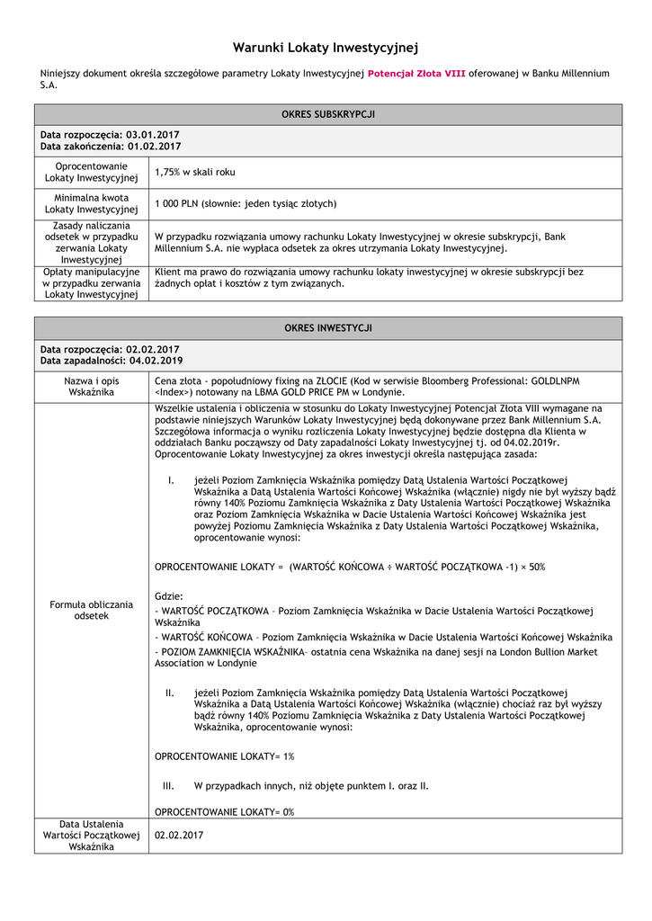 Warunki Lokaty Inwestycyjnej Niniejszy dokument określa szczegółowe parametry Lokaty Inwestycyjnej Potencjał Złota VIII oferowanej w Banku Millennium S.A. OKRES SUBSKRYPCJI Data rozpoczęcia: 03.01.2017 Data zakończenia: 01.02.2017 Oprocentowanie Lokaty Inwestycyjnej 1,75% w skali roku Minimalna kwota Lokaty Inwestycyjnej 1 000 PLN (słownie: jeden tysiąc złotych) Zasady naliczania odsetek w przypadku zerwania Lokaty Inwestycyjnej Opłaty manipulacyjne w przypadku zerwania Lokaty Inwestycyjnej W przypadku rozwiązania umowy rachunku Lokaty Inwestycyjnej w okresie subskrypcji, Bank Millennium S.A. nie wypłaca odsetek za okres utrzymania Lokaty Inwestycyjnej. Klient ma prawo do rozwiązania umowy rachunku lokaty inwestycyjnej w okresie subskrypcji bez żadnych opłat i kosztów z tym związanych. OKRES INWESTYCJI Data rozpoczęcia: 02.02.2017 Data zapadalności: 04.02.2019 Nazwa i opis Wskaźnika Cena złota - popołudniowy fixing na ZŁOCIE (Kod w serwisie Bloomberg Professional: GOLDLNPM <Index>) notowany na LBMA GOLD PRICE PM w Londynie. Wszelkie ustalenia i obliczenia w stosunku do Lokaty Inwestycyjnej Potencjał Złota VIII wymagane na podstawie niniejszych Warunków Lokaty Inwestycyjnej będą dokonywane przez Bank Millennium S.A. Szczegółowa informacja o wyniku rozliczenia Lokaty Inwestycyjnej będzie dostępna dla Klienta w oddziałach Banku począwszy od Daty zapadalności Lokaty Inwestycyjnej tj. od 04.02.2019r. Oprocentowanie Lokaty Inwestycyjnej za okres inwestycji określa następująca zasada: I. jeżeli Poziom Zamknięcia Wskaźnika pomiędzy Datą Ustalenia Wartości Początkowej Wskaźnika a Datą Ustalenia Wartości Końcowej Wskaźnika (włącznie) nigdy nie był wyższy bądź równy 140% Poziomu Zamknięcia Wskaźnika z Daty Ustalenia Wartości Początkowej Wskaźnika oraz Poziom Zamknięcia Wskaźnika w Dacie Ustalenia Wartości Końcowej Wskaźnika jest powyżej Poziomu Zamknięcia Wskaźnika z Daty Ustalenia Wartości Początkowej Wskaźnika, oprocentowanie wynosi: OPROCENTOWANIE LOKATY = (WARTOŚĆ KOŃCOWA ÷ WARTOŚĆ POCZĄTKOWA -1) × 50% Formuła obliczania odsetek Gdzie: - WARTOŚĆ POCZĄTKOWA – Poziom Zamknięcia Wskaźnika w Dacie Ustalenia Wartości Początkowej Wskaźnika - WARTOŚĆ KOŃCOWA – Poziom Zamknięcia Wskaźnika w Dacie Ustalenia Wartości Końcowej Wskaźnika - POZIOM ZAMKNIĘCIA WSKAŹNIKA– ostatnia cena Wskaźnika na danej sesji na London Bullion Market Association w Londynie II. jeżeli Poziom Zamknięcia Wskaźnika pomiędzy Datą Ustalenia Wartości Początkowej Wskaźnika a Datą Ustalenia Wartości Końcowej Wskaźnika (włącznie) chociaż raz był wyższy bądź równy 140% Poziomu Zamknięcia Wskaźnika z Daty Ustalenia Wartości Początkowej Wskaźnika, oprocentowanie wynosi: OPROCENTOWANIE LOKATY= 1% III. W przypadkach innych, niż objęte punktem I. oraz II. OPROCENTOWANIE LOKATY= 0% Data Ustalenia Wartości Początkowej Wskaźnika 02.02.2017 Data Ustalenia Wartości Końcowej Wskaźnika Oprocentowanie gwarantowane Zasady naliczania odsetek w przypadku zerwania Lokaty Inwestycyjnej 30.01.2019 Brak oprocentowania gwarantowanego W przypadku rozwiązania umowy rachunku Lokaty Inwestycyjnej w okresie inwestycji, Bank Millennium S.A. nie wypłaca odsetek za okres inwestycji oraz pobiera opłatę manipulacyjną zgodnie z tabelą wskazaną poniżej. W przypadku rozwiązania umowy rachunku lokaty inwestycyjnej w okresie inwestycji, Bank Millennium S.A. nie wypłaca odsetek oraz pobiera opłatę manipulacyjną ze wskazanego w Dyspozycji Rachunku Bankowego Klienta zgodnie z poniższą tabelą: Zerwanie Lokaty Inwestycyjnej w okresie: Opłaty manipulacyjne w przypadku zerwania Lokaty Inwestycyjnej Wysokość opłaty manipulacyjnej Od 02.02.2017 do 15.05.2017 włącznie 3,00% kwoty lokaty Od 16.05.2017 do 14.08.2017 włącznie 2,75% kwoty lokaty Od 15.08.2017 do 13.11.2017 włącznie 2,50% kwoty lokaty Od 14.11.2017 do 08.02.2018 włącznie 2,25% kwoty lokaty Od 09.02.2018 do 10.05.2018 włącznie 2,00% kwoty lokaty Od 11.05.2018 do 08.08.2018 włącznie 1,75% kwoty lokaty Od 09.08.2018 do 06.11.2018 włącznie 1,00% kwoty lokaty Od 07.11.2018 do 03.02.2019 0,50% kwoty lokaty POZOSTAŁE WARUNKI W OKRESIE SUBSKRYPCJI ORAZ OKRESIE INWESTYCJI Ochrona kapitału W wysokości 100% obowiązuje przez cały okres trwania Lokaty Inwestycyjnej, ale w przypadku rozwiązania umowy rachunku Lokaty Inwestycyjnej w okresie inwestycji powoduje to obowiązek uiszczenia opłaty manipulacyjnej z chwilą zerwania Lokaty Inwestycyjnej, w wysokości określonej powyżej w części Opłaty manipulacyjne w przypadku zerwania Lokaty Inwestycyjnej. W przypadku, gdy zmiana poziomu Wskaźnika będzie większa niż 3% (licząc zmianę pomiędzy Datą rozpoczęcia okresu subskrypcji a Datą rozpoczęcia okresu inwestycji), istnieje możliwość wycofania się przez Bank Millennium S.A. z realizacji dyspozycji otwarcia Lokaty Inwestycyjnej, bez konieczności podejmowania Czynności Alternatywnych wskazanych poniżej. Dla celów niniejszego punktu: "Towar" oznacza towar, do którego odnosi się Wskaźnik określony w niniejszych Warunkach Lokaty Inwestycyjnej. Zakłócenia Rynku W przypadku, gdy w Dacie Ustalenia Wartości Początkowej Wskaźnika lub w Dacie Ustalenia Wartości Końcowej Wskaźnika w stosunku do Towaru wchodzącego w skład Wskaźnika zajdzie przynajmniej jedno z następujących zakłóceń rynku, wówczas Bank Millennium S.A. będzie miał prawo do podjęcia Czynności Alternatywnych wskazanych w punkcie poniżej: 1) Zawieszenie Rynku - zawieszenie lub wstrzymanie obrotu Towarem na giełdzie, na której taki Towar jest notowany, niezależnie od faktu czy takie zawieszenie jest spowodowane ruchami cenowymi przekraczającymi granice dozwolone przez taką giełdę lub inny rynek, na którym taki Towar jest notowany, 2) Zamknięcie Dnia Roboczego giełdy - zamknięcie dnia roboczego giełdy lub innego rynku, na którym taki Towar jest notowan