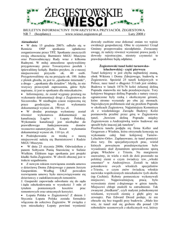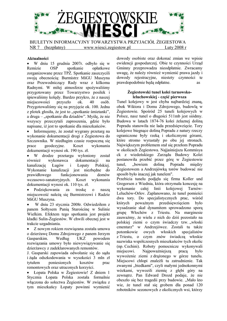 BIULETYN INFORMACYJNY TOWARZYSTWA PRZYJACIÓŁ ŻEGIESTOWA NR 7 (bezpłatny) www.wiesci.zegiestow.pl Luty 2008 r Aktualności • W dniu 15 grudnia 2007r. odbyło się w Remizie OSP spotkanie opłatkowe zorganizowane przez TPŻ. Spotkanie zaszczycili swoją obecnością: Burmistrz MiGU Muszyna oraz Przewodniczący Rady wraz z kilkoma Radnymi. W miłej atmosferze spożywaliśmy przygotowany przez Towarzystwo posiłek i śpiewaliśmy kolędy. Bardzo przykro, że z naszej miejscowości przyszło ok. 40 osób. Przygotowaliśmy się na przyjęcie ok. 100. Jedna z plotek głosiła, że jest to „spotkanie śmietanki”, a druga – „spotkanie dla dziadów”. Myślę, że nie wszyscy przeczytali zaproszenia, gdzie było napisane, iż jest to spotkanie dla mieszkańców. • Informujemy, że został wygrany przetarg na wykonanie dokumentacji drogi z Żegiestowa do Szczawnika. W niedługim czasie rozpoczną się prace geodezyjne. Koszt wykonania dokumentacji wynosi ok. 190 tys. zł. • W drodze przetargu wyłoniony został również wykonawca dokumentacji na kanalizację Ługów i Łopaty Polskiej. Wykonanie kanalizacji jest niezbędne do prawidłowego funkcjonowania domów wczasowo-sanatoryjnych. Koszt wykonania dokumentacji wynosi ok. 110 tys. zł. • Podziękowania za troskę o naszą miejscowość należą się Burmistrzowi i Radzie MiGU Muszyna. • W dniu 23 stycznia 2008r. Odwiedziłem z panem Sołtysem Panią Starościnę w Sulinie Wielkim. Efektem tego spotkania jest projekt kładki Sulin-Żegiestów. W chwili obecnej jest w trakcie uzgadniania. • Z nowym rokiem rozwiązana została umowa o dzierżawę Domu Zdrojowego z panem Jerzym Gasparskim. Według UKŻ powodem rozwiązania umowy było niewywiązywanie się dzierżawcy z zadeklarowanych remontów. J. Gasparski zapowiada odwołanie się do sądu i żąda odszkodowania w wysokości 3 mln zł tytułem poniesionych kosztów prac remontowych oraz utraconych korzyści. • Łopata Polska w Żegiestowie! Z dniem 1 Stycznia Łopata Polska została formalnie włączona do sołectwa Żegiestów. W związku z tym mieszkańcy Łopaty powinni wymienić dowody osobiste oraz dokonać zmian we wpisie ewidencji gospodarczej. Obie te czynności Urząd Gminny przeprowadza nieodpłatnie. Zwracamy uwagę, że należy również wymienić prawa jazdy i dowody rejestracyjne, niestety czynności te prawdopodobnie będą odpłatne. as Żegiestowski tunel kolei tarnowskoleluchowskiej - część pierwsza Tunel kolejowy w jest chyba najbardziej znaną, obok Wiktora i Domu Zdrojowego, budowlą w Żegiestowie. Spośród 25 tuneli kolejowych w Polsce, nasz tunel o długości 511mb jest siódmy. Budowa w latach 1874-76 kolei żelaznej doliną Popradu stanowiła nie lada przedsięwzięcie. Tory kolejowe biegnące doliną Popradu z natury rzeczy ograniczone były rzeką i okolicznymi górami, które stromo wyrastały po obu jej stronach. Największym problemem stał się przełom Popradu w okolicach Żegiestowa. Najjaśniejsza Kommisya ck z wiedeńskiego Zarządu Budowy Kolei postanowiła przebić przez górę w Żegiestowie tunel, „bowiem doliną Popradu między Żegiestowem a Andrzejówką torów budować nie sposób było inaczej jak tunelem". Przebicia tunelu podjęła się firma Koller und Gregorsen z Wiednia, która otrzymała koncesję na wykonanie całej linii kolejowej TarnówLeluchów-Orlov. Zaplanowano, że tunel pomieści dwa tory. Do specjalistycznych prac, wśród których poważnym przedsięwzięciem było wysadzanie skał dynamitem sprowadzono sporą grupę Włochów z Triestu. Na marginesie zauważmy, że wielu z nich do dziś pozostało na polskiej ziemi o czym świadczy tzw. „włoski cmentarz" w Andrzejówce. Zostali tu także potomkowie owych włoskich specjalistów z Triestu, o czym znów świadczą włoskie nazwiska współczesnych mieszkańców tych okolic (np. Cechini). Roboty pomocnicze wykonywali miejscowi. Najpoważniejszą pracą było wywożenie ziemi z drążonego w górze tunelu. Miejscowi chłopi znaleźli tu zatrudnienie. Tak zwanymi „biedkami", czyli małymi jednokonnymi wózkami, wywozili ziemię z głębi góry na zewnątrz. Pan Edward Drozd podaje, że nie obeszło się bez tragedii przy budowie. „Mało kto wie, że tunel stał się grobem dla ponad 120 robotników sezonowych z okolicznych wsi, którzy go budowali". Plan zakładał przebicie tunelu po linii prostej. W czasie robót, kiedy były już mocno zaawansowane, od tzw. strony krakowskiej zerwał się strop skalny grzebiąc 23 biedki oraz ponad 120 robotników. Cały tydzień trwały próby dotarcia do zasypanych, ale ratownikom udało się wydrążyć w skale tylko niewielką niszę, która zachowała się zresztą do dziś. Gdy wszelkie próby ratownicze okazały się bezowocne, postanowiono pozostawić to miejsce jako zbiorową mogiłę, a tunel poprowadzić łukiem obok. Tak też się stało. Wskutek katastrofy niemożliwe okazało się poprowadzenie dwóch torowisk i zdecydowano się na jeden tor. Ciekawe jest, że dostępne opracowania nie wspominają o epidemii grypy, która ponoć zdziesiątkowała pracowników budowy. Natomiast legendy przekazywane ustnie niewiele mówią o wspomnianej katastrofie budowlanej. 25 listopada 1874 r. nastąpiło uroczyste otwarcie tunelu, na które zaproszono wielu, bardzo znamienitych gości. Uroczystość otwarcia tunelu robiła kolosalne wrażenie, może nie tyle sama część oficjalna, co przejście pieszo przez tunel. Muszyński proboszcz ks. Marchoń tak wypowiadał się na łamach „Liber memorabiliom": „...kiedy wraz z innemi gośćmi przechodziłem tunel 25 listopada 1874 r. był on już w niektórych miejscach wykończony i oświetlony światłem gazowym, lecz nie brakło też i pochodni. Dym i swąd tak dokuczał, że z trudem można było dobrnąć do wyjścia w Żegiestowie. Zarówno ja i każdy z gości najbardziej życzyliśmy sobie, by zobaczyć jeszcze światło dzienne. Niemiłego wrażenia nie potr