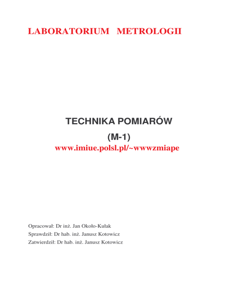 LABORATORIUM METROLOGII TECHNIKA POMIARÓW (M-1) www.imiue.polsl.pl/~wwwzmiape Opracował: Dr in . Jan Około-Kułak Sprawdził: Dr hab. in . Janusz Kotowicz Zatwierdził: Dr hab. in . Janusz Kotowicz 1. Cel wiczenia. Celem wiczenia jest poznanie techniki wykonywania pomiarów oraz opracowywania wyników tak, aby były one zgodne z przepisami obowi zuj cymi w Unii Europejskiej. Dokumenty ujednolicaj ce metody obliczania niepewno ci pomiaru w laboratoriach akredytowanych zostały opublikowane przez E.A. (Europejska Współpraca w dziedzinie Akredytacji). Dokumenty te zostały przetłumaczone i wydane przez Zakład Metrologii Ogólnej Głównego Urz du Miar i zatwierdzone przez Prezesa Głównego Urz du Miar. 2. Wprowadzenie. 2.1 Technika pomiarów. Czynno ci wykonywane przed i w czasie pomiarów badawczych powinny by opisane w sprawozdaniu z pomiarów a je eli laboratorium ma akredytacj i certyfikat tak e w ksi dze jako ci laboratorium (w postaci opisu metody oraz procedury pomiarowej). [3]. Ogólne terminy metrologiczne zwi zane z technik pomiarów: Pomiar: Zbiór operacji maj cych na celu wyznaczenie warto ci wielko ci Warto ci wielko ci: Wyra enie ilo ciowe wielko ci równe iloczynowi liczby i jednostki miary. Metoda pomiarowa: Logiczny ci g wykonywanych podczas pomiaru operacji opisanych w sposób ogólny Procedura pomiarowa: Zbiór operacji opisanych w sposób szczegółowy i realizowanych podczas pomiaru zgodnie z dan metod Wielko mierzona: Wielko okre lon stanowi c przedmiot pomiaru Wielko wpływaj ca: Wielko nie b d ca wielko ci mierzon , która ma jednak wpływ na wynik pomiaru Wynik pomiaru: Warto pomiaru przypisana wielko ci mierzonej, uzyskana drog Wynik surowy: Wynik pomiaru przed korekcj bł du systematycznego Wynik poprawiony: Wynik pomiaru po korekcji bł du systematycznego Dokładno pomiaru: Stopie zgodno ci wyniku pomiaru z warto ci prawdziw wielko ci mierzonej Powtarzalno (wyników pomiaru): Stopie zgodno ci wyników kolejnych pomiarów tej samej wielko ci mierzonej, wykonywanych w tych samych warunkach pomiarowych Odtwarzalno (wyników pomiarów): Stopie zgodno ci wyników kolejnych pomiarów tej samej wielko ci mierzonej wykonywanej w zmiennych warunkach 2.2. Niepewno pomiaru. Niepewno pomiaru musi by okre lona i obliczona zgodnie z przewodnikiem ,,Wyra anie niepewno ci pomiaru” wydanym przez Główny Urz d Miar w 1999 roku [1]. Je eli pomiary s dokonywane w celu wydania wiadectwa wzorcowania aparatury lub przyrz du przez akredytowane laboratorium niepewno musi by okre lona zgodnie z dokumentem EA-4/02 (Europejskiej Współpracy w dziedzinie Akredytacji) wydanej po polsku przez G.U.M. w 2001 roku [4]. Ogólne terminy metrologiczne zwi zane z niepewno ci pomiarów: Niepewno (pomiaru): Parametr zwi zany z wynikiem pomiaru, charakteryzuj cy rozrzut warto ci, które mo na w uzasadniony sposób przypisa warto ci mierzonej Niepewno standardowa: Niepewno odchylenia standardowego wyniku pomiaru wyra ona w formie Zło ona niepewno standardowa: Niepewno standardowa wyniku pomiaru okre lona, gdy wynik ten otrzymywane jest z pewnej liczby innych wielko ci, równa pierwiastkowi kwadratowemu z sumy wyrazów, b d cych wariancjami lub kowariancjami tych innych wielko ci z wagami zale nymi od tego jak wynik pomiaru zmienia si ze zmianami tych wielko ci Niepewno rozszerzona: Wielko okre laj ca przedział wokół wyniku pomiaru od którego to przedziału oczekuje si , e obejmie du cz rozkładu warto ci, które w uzasadniony sposób mo na przypisa wielko ci mierzonej Współczynnik rozszerzenia, pokrycia, obj cia: Współczynnik zastosowany jako mno nik zło onej niepewno ci standardowej w celu otrzymania niepewno ci rozszerzonej najcz ciej: K <2÷3> Obliczanie niepewno ci - metoda typu A: Metoda obliczania drog analizy statystycznej serii obserwacji Obliczanie niepewno ci - metoda typu B: Metoda obliczania niepewno ci innymi sposobami ni analiza serii obserwacji Bł d pomiaru: Ró nica mi dzy wynikiem pomiaru a warto ci prawdziw wielko ci mierzonej Bł d wzgl dny: Stosunek bł du pomiaru do warto ci prawdziwej wielko ci mierzonej (lub umownie prawdziwej) Bł d przypadkowy: Ró nica mi dzy wynikiem pomiaru a redni z niesko czonej liczby wyników pomiarów tej samej wielko ci mierzonej wykonanej w warunkach powtarzalno ci Bł d systematyczny: Ró nica mi dzy redni z niesko czonej liczby pomiarów tej samej wielko ci mierzonej, wykonanych w warunkach powtarzalno ci a warto ci prawdziw wielko ci mierzonej Poprawka: Warto dodana algebraicznie do surowego wyniku pomiaru w celu skompensowania bł du systematycznego Współczynnik poprawkowy: Współczynnik liczbowy, przez, który nale y pomno y surowy wynik pomiaru, aby skompensowa bł d systematyczny ródła niepewno ci pomiaru: a) Niepełna definicja wielko ci mierzonej b) Niedoskonała realizacja definicji wielko ci mierzonej c) Niereprezentatywne próbkowanie d) Niepełna znajomo oddziaływania otoczenia na pomiar e) Niedoskonały pomiar warunków otoczenia f) Subiektywne bł dy w odczytywaniu wskaza analogowych g) Sko czona rozdzielczo albo próg pobudliwo ci przyrz du h) Niedokładne warto ci przypisane wzorom i) Niedokładne warto ci stałych i innych parametrów otrzymywanych ze ródeł zewn trznych u ywanych w procedurach przetwarzania danych j) Przybli enia i zało enia upraszczaj ce tkwi ce w metodzie i procedurze pomiarowej k)Zmiany w powtarzanych obserwacjach wielko ci mierzonej w pozornie identycznych warunkach 3. Przykłady podawania zło onej niepewno ci standardowej „uc” ms - masa odwa nika wzorcowego (100 g) uc - warto zło onej niepewno ci standardowej 1) ms = 100,02147 g (ze zło on niepewno ci standardow ) uc = 0,35 mg 2) ms = 100,02147(35) g - gdzie liczba w nawiasach jest warto ci (zło onej niepewno ci standardowej) uc odniesion do ostatnich cyfr podawanego wyniku 3) ms = 100,02147(0,00035) g - gdzie liczba w nawiasach jest warto ci (zło onej niepewno ci standardowej) uc wyra onej w tej samej jednostce co wynik 4