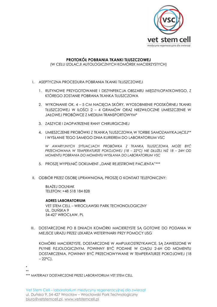 PROTOKÓŁ POBRANIA TKANKI TŁUSZCZOWEJ (W CELU IZOLACJI AUTOLOGICZNYCH KOMÓREK MACIERZYSTYCH) I. ASEPTYCZNA PROCEDURA POBRANIA TKANKI TŁUSZCZOWEJ 1. RUTYNOWE PRZYGOTOWANIE I DEZYNFEKCJA OBSZARU MIĘDZYŁOPATKOWEGO, Z KTÓREGO ZOSTANIE POBRANA TKANKA TŁUSZCZOWA 2. WYKONANIE OK. 4 – 5 CM NACIĘCIA SKÓRY, WYOSOBNIENIE PODSKÓRNEJ TKANKI TŁUSZCZOWEJ W ILOŚCI 2 – 4 GRAMÓW ORAZ NIEZWŁOCZNE UMIESZCZENIE W JAŁOWEJ PROBÓWCE Z MEDIUM TRANSPORTOWYM* 3. ZASZYCIE I ZAOPATRZENIE RANY CHIRURGICZNEJ 4. UMIESZCZENIE PROBÓWKI Z TKANKĄ TŁUSZCZOWĄ W TORBIE SAMOZAMYKAJĄCEJ** I WYSŁANIE TEGO SAMEGO DNIA KURIEREM DO LABORATORIUM VSC W AWARYJNYCH SYTUACJACH PROBÓWKA Z TKANKĄ TŁUSZCZOWĄ MOŻE BYĆ PRZECHOWANA W TEMPERATURZE POKOJOWEJ (18 – 22°C) NIE DŁUŻEJ NIŻ 18 – 24H OD MOMENTU POBRANIA DO MOMENTU WYSŁANIA DO LABORATORIUM VSC 5. PROSZĘ WYPEŁNIĆ DOKUMENT „DANE REJESTROWE PACJENTA”*** II. ODBIÓR PRZEZ OSOBĘ UPRAWNIONĄ. PROSZĘ O KONTAKT TELEFONICZNY: BŁAŻEJ DOLNIAK TELEFON: +48 518 184 828 ADRES LABORATORIUM VET STEM CELL – WROCŁAWSKI PARK TECHONOLOGICZNY UL. DUŃSKA 9 54-427 WROCŁAW, PL III. DOSTARCZONE PO 8 DNIACH KOMÓRKI MACIERZYSTE SĄ GOTOWE DO PODANIA W MIEJSCE URAZU PRZEZ LEKARZA WETERYNARII PRZY POMOCY USG KOMÓRKI MACIERZYSTE, DOSTARCZONE W AMPUŁKOSTRZYKAWCE, SĄ ZAWIESZONE W PŁYNIE FIZJOLOGICZNYM. POWINNY BYĆ PODANE W CIĄGU 2-6H OD MOMENTU DOSTARCZENIA. POWINNY BYĆ PRZECHOWYWANE W TEMPERATURZE POKOJOWEJ (18 – 22°C). * ** *** MATERIAŁY DOSTARCZONE PRZEZ LABORATORIUM VET STEM CELL Vet Stem Cell – laboratorium medycyny regeneracyjnej dla zwierząt ul. Duńska 9, 54-427 Wrocław – Wrocławski Park Technologiczny [email protected], www.vetstemcell.pl