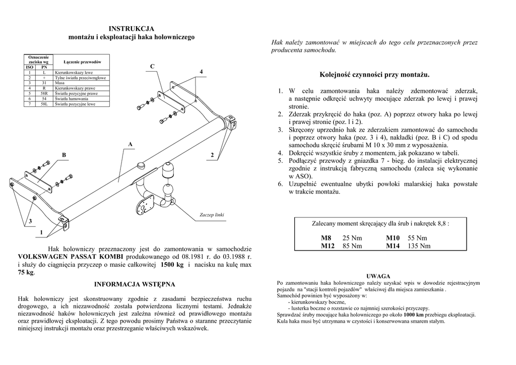 INSTRUKCJA montaŜu i eksploatacji haka holowniczego Oznaczenie zacisku wg ISO PN 1 L 2 + 3 31 4 R 5 58R 6 54 7 58L Łączenie przewodów Hak naleŜy zamontować w miejscach do tego celu przeznaczonych przez producenta samochodu. C 4 Kierunkowskazy lewe Tylne światła przeciwmgłowe Masa Kierunkowskazy prawe Światła pozycyjne prawe Światła hamowania Światła pozycyjne lewe Kolejność czynności przy montaŜu. A B 2 1. W celu zamontowania haka naleŜy zdemontować zderzak, a następnie odkręcić uchwyty mocujące zderzak po lewej i prawej stronie. 2. Zderzak przykręcić do haka (poz. A) poprzez otwory haka po lewej i prawej stronie (poz. l i 2). 3. Skręcony uprzednio hak ze zderzakiem zamontować do samochodu i poprzez otwory haka (poz. 3 i 4), nakładki (poz. B i C) od spodu samochodu skręcić śrubami M 10 x 30 mm z wyposaŜenia. 4. Dokręcić wszystkie śruby z momentem, jak pokazano w tabeli. 5. Podłączyć przewody z gniazdka 7 - bieg. do instalacji elektrycznej zgodnie z instrukcją fabryczną samochodu (zaleca się wykonanie w ASO). 6. Uzupełnić ewentualne ubytki powłoki malarskiej haka powstałe w trakcie montaŜu. Zaczep linki 3 Zalecany moment skręcający dla śrub i nakrętek 8,8 : 1 Hak holowniczy przeznaczony jest do zamontowania w samochodzie VOLKSWAGEN PASSAT KOMBI produkowanego od 08.1981 r. do 03.1988 r. i słuŜy do ciągnięcia przyczep o masie całkowitej 1500 kg i nacisku na kulę max 75 kg. INFORMACJA WSTĘPNA Hak holowniczy jest skonstruowany zgodnie z zasadami bezpieczeństwa ruchu drogowego, a ich niezawodność została potwierdzona licznymi testami. JednakŜe niezawodność haków holowniczych jest zaleŜna równieŜ od prawidłowego montaŜu oraz prawidłowej eksploatacji. Z tego powodu prosimy Państwa o staranne przeczytanie niniejszej instrukcji montaŜu oraz przestrzeganie właściwych wskazówek. M8 M12 25 Nm 85 Nm M10 M14 55 Nm 135 Nm UWAGA Po zamontowaniu haka holowniczego naleŜy uzyskać wpis w dowodzie rejestracyjnym pojazdu na "stacji kontroli pojazdów" właściwej dla miejsca zamieszkania . Samochód powinien być wyposaŜony w: - kierunkowskazy boczne, - lusterka boczne o rozstawie co najmniej szerokości przyczepy. Sprawdzać śruby mocujące haka holowniczego po około 1000 km przebiegu eksploatacji. Kula haka musi być utrzymana w czystości i konserwowana smarem stałym. KARTA GWARANCYJNA Producent udziela gwarancji niniejszą kartą gwarancyjną na okres 24 miesięcy licząc od dnia zakupu haka holowniczego do samochodu: VOLKSWAGEN PASSAT KOMBI PPUH AUTO-HAK S.J. Produkcja Haków Holowniczych Henryk & Zbigniew Nejman 76-200 SŁUPSK ul. Słoneczna 16K tel/fax (059) 8-414-414; 8-414-413 e-mail: [email protected] www. autohak.com.pl HAK HOLOWNICZY DO SAMOCHODU TYPU: produkowanego od 08.1981 r. do 03.1988 r. VOLKSWAGEN PASSAT Data produkcji .............................. Data zakupu................................... KOMBI produkowanego od 08.1981 r. do 03.1988 r. Gwarancja odnosi się do wad ukrytych wynikających z niezgodności z aktualnie zobowiązującymi normami a zwłaszcza ze złej konstrukcji, zastosowania wadliwych materiałów itp. Gwarancja nie obejmuje natomiast uszkodzeń zawinionych przez nabywcę, a zwłaszcza na skutek nieprzestrzegania zasad konserwacji i uŜytkowania powstałych w czasie przewozów dokonanych przez nabywcę. Reklamacje naleŜy zgłaszać w punkcie sprzedaŜy, składając jednocześnie kartę gwarancyjną. Usunięcie "wady" następuje po stwierdzeniu przez punkt sprzedaŜy wspólnie z producentem słuszności złoŜonej reklamacji. Reklamacja powinna być załatwiona w ciągu czternastu dni od dnia uznania reklamacji. Karta gwarancyjna jest niewaŜna, jeŜeli nie jest wypełniona i podpisana. Nr kat. K 09 Data zgłoszenia reklamacji: ................................................................... CERTYFIKAT Nr B/1/199/2000