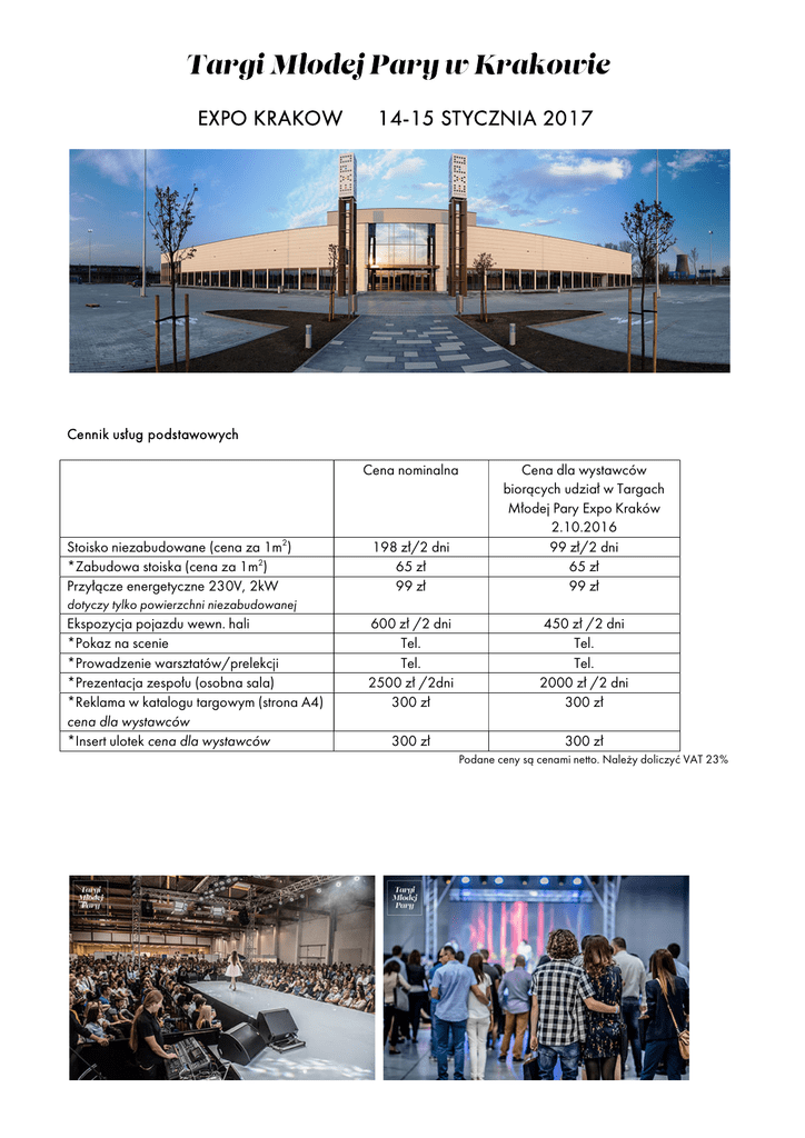 EXPO KRAKOW 14-15 STYCZNIA 2017 Cennik usług podstawowych Cena nominalna Stoisko niezabudowane (cena za 1m2) *Zabudowa stoiska (cena za 1m2) Przyłącze energetyczne 230V, 2kW 198 zł/2 dni 65 zł 99 zł Cena dla wystawców biorących udział w Targach Młodej Pary Expo Kraków 2.10.2016 99 zł/2 dni 65 zł 99 zł 600 zł /2 dni Tel. Tel. 2500 zł /2dni 300 zł 450 zł /2 dni Tel. Tel. 2000 zł /2 dni 300 zł dotyczy tylko powierzchni niezabudowanej Ekspozycja pojazdu wewn. hali *Pokaz na scenie *Prowadzenie warsztatów/prelekcji *Prezentacja zespołu (osobna sala) *Reklama w katalogu targowym (strona A4) cena dla wystawców *Insert ulotek cena dla wystawców 300 zł 300 zł Podane ceny są cenami netto. Należy doliczyć VAT 23% STOISKO ZABUDOWANE W standardzie powierzchnia zabudowana oktanorm wyposażona w białe ścianki zewnętrzne stoiska, wykładzinę targową na stoisku, przyłącz energetyczny, oświetlenie, kosz na śmieci STOISKO NIEZABUDOWANE Pusta powierzchnia wybierana przez wystawców, którzy chcą zaaranżować stoisko wg własnej koncepcji, lub budują stoisko indywidualnie Zarówna w przypadku powierzchni zabudowanej jak i niezabudowanej istnieje możliwość domówienia dodatków (krzesła, lady, stoły, gabloty etc.) EKSPOZYCJA POJAZDÓW WEWNĄTRZ HALI Ekspozycja wszystkich pojazdów odbywa się wewnątrz hali Expo Kraków. POKAZ NA SCENIE Do Państwa dyspozycji udostępniamy profesjonalną scenę z nagłośnieniem i oświetleniem. Na scenie odbywać się mogą pokazy mody ślubnej oraz prezentacje różnych usług (barmani, atrakcje, taniec, zespół muzyczny) PROWADZENIE WARSZTATÓW/PRELEKCJI Do Państwa dyspozycji udostępniamy sale konferencyjne z wyposażeniem multimedialnym. Prosimy o kontakt telefoniczny w celu indywidualnej wyceny. PREZENTACJA ZESPOŁU Na osobnej sali akustycznej tylko 6 zespołów ma możliwość prezentacji swojej oferty w 10 minutowych blokach (6-7 występów w ciągu 1 dnia) Reklama w katalogu Przy wejściu na targi zwiedzający otrzymują katalog targowy w formacie A4 (plan stoisk, spis wystawców, artykuły tematyczne oraz reklamy zainteresowanych firm). Nakład: 2500 szt. Insert ulotek Wraz z katalogiem zwiedzający otrzymują torebkę targową z ulotkami firm zainteresowanych usługą. Proponowany nakład ulotek 2500 szt. Rezerwacja stoiska Kontakt Jeśli jesteście Państwo zainteresowani udziałem w Targach Młodej Pary Expo Kraków w dniach 14-15 stycznia 2017 prosimy o wypełnienie formularza zgłoszeniowego na naszej stronie: http://targimlodejpary.pl/zarezerwuj-stoisko Obsługa wystawców (Kraków) Elżbieta Pruska +48 530 008 621 [email protected]