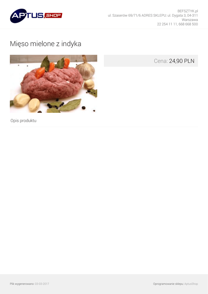 BEFSZTYK.pl ul. Szaserów 69/71/6 ADRES SKLEPU: ul. Dygata 3, 04-311 Warszawa 22 254 11 11, 668 668 500 Mięso mielone z indyka Cena: 24,90 PLN Opis produktu Plik wygenerowano: 03-03-2017 Powered by TCPDF (www.tcpdf.org) Oprogramowanie sklepu: AptusShop