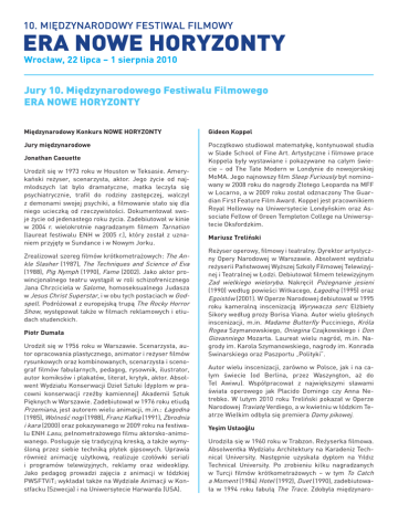 Jury 10. Międzynarodowego Festiwalu Filmowego ERA NOWE HORYZONTY Międzynarodowy Konkurs NOWE HORYZONTY Gideon Koppel Jury międzynarodowe Początkowo studiował matematykę, kontynuował studia w Slade School of Fine Art. Artystyczne i filmowe prace Koppela były wystawiane i pokazywane na całym świecie – od The Tate Modern w Londynie do nowojorskiej MoMA. Jego najnowszy film Sleep Furiously był nominowany w 2008 roku do nagrody Złotego Leoparda na MFF w Locarno, a w 2009 roku został odznaczony The Guardian First Feature Film Award. Koppel jest pracownikiem Royal Holloway na Uniwersytecie Londyńskim oraz Associate Fellow of Green Templeton College na Uniwersytecie Oksfordzkim. Jonathan Caouette Urodził się w 1973 roku w Houston w Teksasie. Amerykański reżyser, scenarzysta, aktor. Jego życie od najmłodszych lat było dramatyczne, matka leczyła się psychiatrycznie, trafił do rodziny zastępczej, walczył z demonami swojej psychiki, a filmowanie stało się dla niego ucieczką od rzeczywistości. Dokumentował swoje życie od jedenastego roku życia. Zadebiutował w kinie w 2004 r. wielokrotnie nagradzanym filmem Tarnation (laureat festiwalu ENH w 2005 r.), który został z uznaniem przyjęty w Sundance i w Nowym Jorku. Zrealizował szereg filmów krótkometrażowych: The Ankle Slasher (1987), The Techniques and Science of Eva (1988), Pig Nymph (1990), Fame (2002). Jako aktor prowincjonalnego teatru wystąpił w roli schizofrenicznego Jana Chrzciciela w Salome, homoseksualnego Judasza w Jesus Christ Superstar, i w obu tych postaciach w Godspell. Podróżował z europejską trupą The Rocky Horror Show, występował także w filmach reklamowych i etiudach studenckich. Piotr Dumała Urodził się w 1956 roku w Warszawie. Scenarzysta, autor opracowania plastycznego, animator i reżyser filmów rysunkowych oraz kombinowanych, scenarzysta i scenograf filmów fabularnych, pedagog, rysownik, ilustrator, autor komiksów i plakatów, literat, krytyk, aktor. Absolwent Wydziału Konserwacji Dzieł Sztuki (dyplom w pracowni konserwacji rzeźby kamiennej) Akademii Sztuk Pięknych w Warszawie. Zadebiutował w 1976 roku etiudą Przemiana, jest autorem wielu animacji, m.in.: Łagodna (1985), Wolność nogi (1988), Franz Kafka (1991), Zbrodnia i kara (2000) oraz pokazywanego w 2009 roku na festiwalu ENH Lasu, pełnometrażowego filmu aktorsko-animowanego. Posługuje się tradycyjną kreską, a także wymyśloną przez siebie techniką płytek gipsowych. Uprawia również animację użytkową, realizuje czołówki seriali i programów telewizyjnych, reklamy oraz wideoklipy. Jako pedagog prowadzi zajęcia z animacji w łódzkiej PWSFTViT; wykładał także na Wydziale Animacji w Konstfacku (Szwecja) i na Uniwersytecie Harwarda (USA). Mariusz Treliński Reżyser operowy, filmowy i teatralny. Dyrektor artystyczny Opery Narodowej w Warszawie. Absolwent wydziału reżyserii Państwowej Wyższej Szkoły Filmowej Telewizyjnej i Teatralnej w Łodzi. Debiutował filmem telewizyjnym Zad wielkiego wieloryba. Nakręcił Pożegnanie jesieni (1990) według powieści Witkacego, Łagodną (1995) oraz Egoistów (2001). W Operze Narodowej debiutował w 1995 roku kameralną inscenizacją Wyrywacza serc Elżbiety Sikory według prozy Borisa Viana. Autor wielu głośnych inscenizacji, m.in. Madame Butterfly Pucciniego, Króla Rogea Szymanowskiego, Oniegina Czajkowskiego i Don Giovanniego Mozarta. Laureat wielu nagród, m.in. Nagrody im. Karola Szymanowskiego, nagrody im. Konrada Swinarskiego oraz Paszportu „Polityki”. Autor wielu inscenizacji, zarówno w Polsce, jak i na całym świecie (od Berlina, przez Waszyngton, aż do Tel Awiwu). Współpracował z największymi sławami świata operowego jak Placido Domingo czy Anna Netrebko. W lutym 2010 roku Treliński pokazał w Operze Narodowej Traviatę Verdiego, a w kwietniu w łódzkim Teatrze Wielkim odbyła się premiera Damy pikowej. Yeşim Ustaoğlu Urodziła się w 1960 roku w Trabzon. Reżyserka filmowa. Absolwentka Wydziału Architektury na Karadeniz Technical University. Następnie uzyskała dyplom na Yıldız Technical University. Po zrobieniu kilku nagradzanych w Turcji filmów krótkometrażowych – w tym To Catch a Moment (1984) Hotel (1992), Duet (1990), zadebiutowała w 1994 roku fabułą The Trace. Zdobyła międzynaro- dowe uznanie za sprawą filmu Podróż do słońca (1999), który został nagrodzony na MFF w Berlinie. Jej trzeci film Czekając na chmury został nagrodzony Sundance /NHK International Filmmakers Award w 2003 roku. Jej najnowszy film Pandora’s Box został nagrodzony w 2008 roku na MFF w San Sebastián (Złota Musza – Najlepszy film i Srebrna Muszla – Najlepsza aktorka). Jury FIPRESCI Laurence Boyce Nagradzany dziennikarz filmowy, który w chwili obecnej publikuje w takich wydawnictwach jak Little White Lies, Film & Festivals Magazine, and Netribution.co.uk. Pracuje także jako selekcjoner na MFF w Leeds, a między 2007 a 2010 rokiem był dyrektorem GLIMMER: MFF Krótkometrażowych w Hull. Członek Międzynarodowej Federacji Krytyków Filmowych FIPRESCI i BAFTA. Krzysztof Kwiatkowski Dziennikarz tygodnika Newsweek. Polska, stały współpracownik miesięcznika Kino. Relacjonuje festiwale w Cannes, Berlinie, Wenecji, Karlowych Warach. Przeprowadził wiele wywiadów z ludźmi kina m.in. z Martinem Scorsese, Woody’m Allenem, Quentinem Tarantino, Pedro Almodóvarem, Leonardo DiCaprio, Meryl Streep. Publikował m.in. w Wysokich Obcasach, Gazecie Wyborczej, Dzienniku, Życiu Warszawy, Tygodniku Powszechnym, Perspektywach. Jego teksty znalazły się także w książkach: Podróż i miejsce w perspektywie antropologicznej, Pamięć zbiorowa jako czynnik integracji i źródło konfliktów oraz Kultura i gospodarka. Yeşim Tabak Urodziła się w 1979 roku w Stambule. Ciągle mieszka i pracuje tam jako wolny strzelec, zajmując się krytyką filmową i dziennikarstwem. Absolwentka Wydziału Komunikacji (specjalność dziennikarst