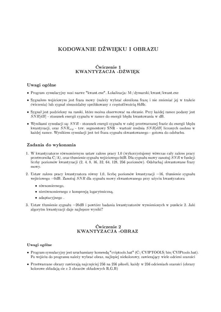 KODOWANIE DWIKU I OBRAZU wiczenie 1 KWANTYZACJA -DWIK Uwagi ogólne • Program symulacyjny nosi nazwe "kwant.exe". Lokalizacja: M:/dymarski/kwant/kwant.exe • Sygnaªem wej±ciowym jest fraza mowy (nale»y wybra¢ okre±lona fraz¦ i nie zmienia¢ jej w trakcie ¢wiczenia) lub sygnaª sinusoidalny spróbkowany z cz¦stotliwo±ci¡ 8kHz. • Sygnaª jest podzielony na ramki, które mo»na obserwowa¢ na ekranie. Przy ka»dej ramce podany jest SN R[dB] - stosunek energii sygnaªu w ramce do energii bª¦du kwantowania w dB. • Wynikami symulacji s¡: SN R - stosunek energii sygnaªu w caªej przetwarzanej frazie do energii bª¦du kwantyzacji, oraz SN Rseg - tzw. segmentowy SNR - warto±¢ ±rednia SN R[dB] liczonych osobno w ka»dej ramce. Wynikiem symulacji jest te» fraza sygnaªu skwantowanego - gotowa do odsªuchu. Zadania do wykonania 1. W kwantyzatorze równomiernym ustaw zakres pracy 1,0 (wykorzystujemy wówczas caªy zakres pracy przetwornika C/A), oraz tªumienie sygnaªu wej±ciowego 0dB. Dla sygnaªu mowy zanotuj SN R w funkcji liczby poziomów kwantyzacji (2, 4, 8, 16, 32, 64, 128, 256 poziomów). Odsªuchaj skwantowane frazy mowy. 2. Ustaw zakres pracy kwantyzatora równy 1,0, liczb¦ poziomów kwantyzacji =16, tªumienie sygnaªu wej±ciowego =0dB. Zanotuj SN R dla sygnaªu mowy skwantowanego przy u»yciu kwantyzatora • równomiernego, • nierównomiernego z kompresj¡ logarytmiczn¡, • adaptacyjnego . 3. Ustaw tªumienie sygnaªu =20dB i powtórz badania kwantyzatorów wymienionych w punkcie 2. Jaki algorytm kwantyzacji daje najlepsze wyniki? wiczenie 2 KWANTYZACJA -OBRAZ Uwagi ogólne • Program symulacyjny jest uruchamiany komend¡ "cviptools.bat" (C:/CVIPTOOLS/bin/CVIPtools.bat). Po wej±ciu do programu nale»y wybra¢ obraz, najlepiej niekolorowy, zawieraj¡cy wiele odcieni szaro±ci • Przetwarzane obrazy zawieraj¡ najcz¦±ciej 256 na 256 pikseli, ka»dy w 256 odcieniach szaro±ci (obrazy kolorowe skªadaj¡ sie z 3 obrazów skªadowych R,G,B) • Kwantyzacj¦ skalarn¡ mo»na wykona¢ zaznaczaj¡c obraz w gªównym oknie programu (prosz¦ sprawdzi¢, czy zaznaczono wªa±ciwy obraz!), nast¦pnie przechodz¡c do compression - preprocessing - gray level quantization. • Obraz skwantowany mo»na porówna¢ z oryginaªem. Nale»y wybra¢ utilities - misc - compare two images. Najlepiej wykorzysta¢ SNR (wynik jest w decybelach). Oczywi±cie skwantowany obraz nale»y te» obejrze¢. Zadanie do wykonania Przeprowad¹ kwantyzacj¦ wybranego obrazu ustawiaj¡c liczb¦ poziomów kwantyzacji =2, 4, 8, 16... Zako«cz cykl symulacji po otrzymaniu obrazu o dobrej jako±ci (prawie nie ró»ni¡cego si¦ od oryginaªu). Zanotuj warto±¢ SNR [dB] w funkcji rozdzielczo±ci (w bitach na piksel). Jaka rozdzielczo±¢ gwarantuje dobr¡ jako±¢ obrazu? wiczenie 3 KWANTYZACJA WEKTOROWA Uwagi ogólne • Lokalizacja programu M:/dymarski/vq/wektor.exe. • Badane s¡ kwantyzatory przetwarzaj¡ce wektory o wymiarach od 1 do 8 (gdy wymiar wektora =1, kwantowanie wektorowe przechodzi w kwantowanie skalarne) o sªowniku optymalizowanym dla przetwarzanej frazy. Projektowanie sªownika odbywa si¦ iteracyjnie, przy u»yciu algorytmu Lloyda lub LBG. • Program umo»liwia (w przypadku wybrania wektorów 2-wymiarowych) obserwacj¦ procesu projektowania sªownika kwantyzatora wektorowego. • Sygnaªem wej±ciowym jest fraza mowy. Sygnaª posiada próbki o warto±ciach nie wykraczaj¡cych poza < −1, +1 >. • Sygnaª jest podzielony na ramki, które mo»na obserwowa¢ na ekranie (w ramce mie±ci si¦ caªkowita liczba wektorów). Przy ka»dej ramce podawany jest SN R[dB] - stosunek energii sygnaªu w ramce do energii bª¦du kwantowania, wyra»ony w dB. • Wynikami symulacji s¡: SN R - stosunek energii sygnaªu w caªej przetwarzanej frazie do energii bª¦du kwantyzacji, oraz SN Rseg - tzw. segmentowy SNR - warto±¢ ±rednia SN R[dB] liczonych osobno w ka»dej ramce. Wynikiem symulacji jest te» fraza sygnaªu skwantowanego - gotowa do odsªuchu. Zadania do wykonania 1. Badanie algorytmów projektowania sªowników kwantyzatorów wektorowych Zaobserwuj przedstawiony na ekranie zbiór wektorów M = 2-wymiarowych pobranych z sygnaªu mowy. Co ±wiadczy o wyst¦powaniu korelacji s¡siednich próbek? Przeprowad¹ projektowanie sªownika licz¡cego 128 wektorów 2-wymiarowych. Sªownik pocz¡tkowy otrzymaj metod¡ losowania wektorów z frazy. Nast¦pnie zaprojektuj sªownik metod¡ LBG i porównaj wyniki. 2. Badanie jako±ci skwantowanego sygnaªu w funkcji wymiaru wektora Przeprowad¹ ró»nymi metodami kwantyzacj¦ frazy mowy z rozdzielczo±ci¡ b = 1bit /próbk¦ (8kbit/s). Wykorzystaj kwantyzator skalarny o 2 poziomach kwantyzacji (podstaw wymiar wektora =1), kwantyzator wektorów 2-wymiarowych (4 wektory w sªowniku), kwantyzator wektorów 3-wymiarowych (8 wektorów w sªowniku), itd a» do kwantowania wektorów 8-wymiarowych (256 wektorów w sªowniku). Wykre±l SNR w funkcji wymiaru wektora. Czym wyja±ni¢ przewag¦ kwantyzatorów wektorowych nad skalarnym? wiczenie 4 KODOWANIE MOWY W TELEFONII KOMÓRKOWEJ - GSM-AMR Uwagi ogólne • Lokalizacja programu M:/dymarski/celp/AMRCelp.exe. • Obsªug¦ programu wyja±ni prowadz¡cy Zadania do wykonania 1. Obserwacja sygnaªów w koderze GSM-AMR. Uruchom symulator AMR-CELP. Dla wybranej ramki mowy d¹wi¦cznej porównaj widmo sygnaªu wej±ciowego S(f) i charakterystyk¦ cz¦stotliwo±ciow¡ ltru syntezy H(f). Jaki jest zwi¡zek H(f) i S(f)? Zaobserwuj sygnaª pobudzaj¡cy u(n) i jego skªadniki: pobudzenie adaptacyjne v(n) i algebraiczne c(n). Jaka jest rola pobudzenia adaptacyjnego w kodowaniu mowy d¹wi¦cznej? 2. Badanie jako±ci sygnaªu mowy w funkcji przepªywno±ci kodera. Dla wybranej frazy mowy przeprowad¹ symulacje kodera AMR CELP wykorzystuj¡c dost¦pne przepªywno±ci binarne. Notuj SNR i SNRseg [dB] oraz odsªuchuj frazy poddane kompresji. Powy»ej jakiej przepªywno±ci jako±¢ mowy mo»na uzna¢ za wystarczaj¡c¡