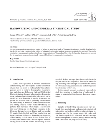 Problems of Forensic Sciences 2013, vol. 95, 620–626 Handwriting and gender: a statistical study Suneet Kumar1, Vaibhav Saran1, Bikram ashok Vaid2, ashok Kumar Gupta1 1 2 School of Forensic Science, SHIATS, Allahabad, India Laboratory of Govt Examiner of Questioned Documents, Shimla, India abstract an attempt was made to ascertain the gender of writers by a statistical study of characteristic elements found in their handwriting. in this work, the variation in the writing of a hundred males and a hundred females was statistically analysed. the results obtained are encouraging from the point of view of determination of the gender of the writer. By knowing the gender, the suspect list for a particular case can be shortened, which will facilitate the examination/investigation. Key words Handwriting; Gender; Statistical approach. Received 4 October 2012; accepted 25 April 2013 1. introduction Experts who specialize in forensic examination of handwriting have developed a number of methodologies that can assist in making better than chance guesses about a writer’s demographic characteristics, including sex. Huber and Hedrick [3] identified 21 discriminating elements in handwriting. Examining shape variants of each letter (called allographs) can be useful, but word formation is equally if not more important for analyses such as gendering a writer based on handwriting: in particular, word formation in cursive writing tends to “carry” more individuality and patterns than individual letter shapes. most research into handwriting and sex has been conducted in the uSa and Britain; however, Hamid and Loewenthal [2] studied both English and urdu handwriting and found consistent differences depending on the gender of handwriting in both cases, with a similar level of accuracy and identification. Western reports on handwriting have found that female handwriting is more rounded. Serious attempts have been made in the in the past to find sex dependent features in handwriting, including some attempts to determine the ability of both handwriting examiners and unskilled persons to determine a writer’s sex. in the present research an attempt was made to study the variation in handwriting of males and females, in order to facilitate forensic document examination. 2. sampling Samples of handwriting for comparison were collected from graduate and undergraduate students of universities and colleges, office workers, training institutions etc. For the present study, 100 males and 100 females aged 18–25, educated, and with average skill were requested to write a passage without letting them know about the purpose of the study. 621 Handwriting and gender: A statistical study 3. Methodology the handwriting samples were separately examined by the authors, who were unaware of the gender of the writer, focusing on the characteristic identifiers of masculine and feminine handwriting suggested by Briggs [1] along with other handwriting analysis features like the size of letters, the style of handwriting based on letter line formation, the spacing of lines and words, letter formation, the angle or slant of writing, the angle of the crossbar, the concavity and convexity of letters, counters, hooks and corners, “x” height, baseline, dotting of “i” etc. the frequency of such features was calculated using the z-test, taking the null hypothesis as “there is no significant difference in male and female handwriting”. according to the statistical z-test formula used: z p1 p2 p1 1 p1 p2 1 p2 n1 n2 p1 = X1/n1 where: p1 – proportion of male handwriting samples where the feature occurs; p2 – proportion of female handwriting samples where the feature occurs; X1, X2 – frequencies of feature in males and females respectively; n1, n2 – no. of samples of male and female handwriting respectively. Critical value: at 5% level of significance, the critical value of z = 1.96. 4. results data was obtained from a hundred males and hundred females and using the aforesaid equation, the parameters suggested by Briggs [3] and various other parameters were determined and tabulated in tables i and ii. a critical study of the tables reveals significant differences which differentiate masculine and feminine handwritings. Further, analysis of the data leads to rejection of the null hypothesis and points to significant differences in the writings of males and females. p2 = X2/n2 Fig. 1. Frequency distribution chart for male and female handwriting character variation. Problems of Forensic Sciences 2013, vol. 95, 620–626 622 S. Kumar, V. Saran, B. A. Vaid, A. K. Gupta taBLE i. StatiStiCaL VaLuE OF GEndEr idEntiFYinG FEaturES OF HandWritinG trait P1 P2 p̂ n1, n2 Z calculated dot of “ i” 0.15 0.48 0.315 100 5.030 Cramped formation of counter in “a” 0.43 0.25 0.66 100 5.29 Cramped formation of counter in “d” 0.31 0.17 0.24 100 2.32 Cramped formation of counter in “o” 0.20 0.05 0.125 100 3.21 Fullness of counter of “a” 0.23 0.48 0.355 100 3.69 Fullness of counter of “o” 0.15 0.36 0.255 100 3.40 Open counter for “a” 0.30 0.16 0.23 100 2.35 Hook at start of “c” 0.49 0.63 0.56 100 1.99 Hook at end of “c” 0.56 0.77 0.665 100 3.14 Hook at end of “d” 0.23 0.56 0.395 100 4.77 Hook at end of “e” 0.56 0.78 0.67 100 3.313 Hook at end of “h” 0.26 0.56 0.41 100 4.316 Hook at end of “n” 0.23 0.42 0.325 100 2.8 Hook at end of “u” 0.57 0.78 0.675 100 3.172 Loop formation in stem of letter “b” 0.02 0.10 0.06 100 2.38 Loop formation in stem of letter “l” 0.66 0.84 0.75 100 2.94 Loop formation in stem of letter “d” 0.35 0.65 0.05 100 4.24 Loop formation in stem of letter “h” 0.34 0.49 0.415 100 2.17 Flourish at start of letter “a” 0.02 0.10 0.06 100 2.38 Flourish at start of letter “c” 0.05 0.16 0.015 100 3.64 Flourish at start of letter “d” 0.00 0.06 0.03 100 2.48 Flourish at start of letter “o” 0.00 0.06 0.03 100 2.48 Flourish at start of letter “u” 0.00 0