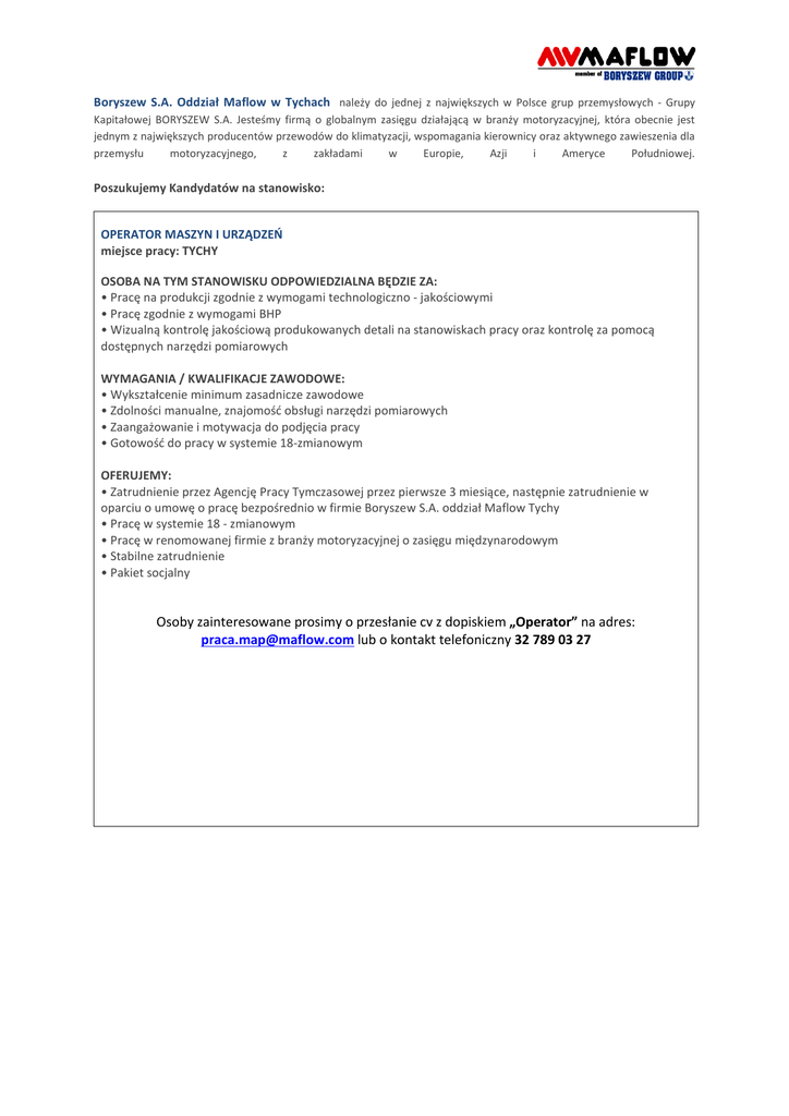 Boryszew S.A. Oddział Maflow w Tychach należy do jednej z największych w Polsce grup przemysłowych - Grupy Kapitałowej BORYSZEW S.A. Jesteśmy firmą o globalnym zasięgu działającą w branży motoryzacyjnej, która obecnie jest jednym z największych producentów przewodów do klimatyzacji, wspomagania kierownicy oraz aktywnego zawieszenia dla przemysłu motoryzacyjnego, z zakładami w Europie, Azji i Ameryce Południowej. Poszukujemy Kandydatów na stanowisko: OPERATOR MASZYN I URZĄDZEŃ miejsce pracy: TYCHY OSOBA NA TYM STANOWISKU ODPOWIEDZIALNA BĘDZIE ZA: • Pracę na produkcji zgodnie z wymogami technologiczno - jakościowymi • Pracę zgodnie z wymogami BHP • Wizualną kontrolę jakościową produkowanych detali na stanowiskach pracy oraz kontrolę za pomocą dostępnych narzędzi pomiarowych WYMAGANIA / KWALIFIKACJE ZAWODOWE: • Wykształcenie minimum zasadnicze zawodowe • Zdolności manualne, znajomość obsługi narzędzi pomiarowych • Zaangażowanie i motywacja do podjęcia pracy • Gotowość do pracy w systemie 18-zmianowym OFERUJEMY: • Zatrudnienie przez Agencję Pracy Tymczasowej przez pierwsze 3 miesiące, następnie zatrudnienie w oparciu o umowę o pracę bezpośrednio w firmie Boryszew S.A. oddział Maflow Tychy • Pracę w systemie 18 - zmianowym • Pracę w renomowanej firmie z branży motoryzacyjnej o zasięgu międzynarodowym • Stabilne zatrudnienie • Pakiet socjalny Osoby zainteresowane prosimy o przesłanie cv z dopiskiem „Operator” na adres: [email protected] lub o kontakt telefoniczny 32 789 03 27