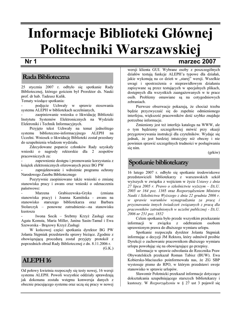 Informacje Biblioteki Głównej Politechniki Warszawskiej Nr 1 Rada Biblioteczna 25 stycznia 2007 r. odbyło się spotkanie Rady Bibliotecznej, którego gościem był Prorektor ds. Nauki prof. dr hab. Tadeusz Kulik. Tematy wiodące spotkania: podjęcie Uchwały w sprawie stosowania systemu ALEPH w bibliotekach uczelnianych, zaopiniowanie wniosku o likwidację Biblioteki Instytutu Systemów Elektronicznych na Wydziale Elektroniki i Technik Informacyjnych. Przyjęto tekst Uchwały na temat jednolitego systemu biblioteczno-informacyjnego ALEPH na Uczelni. Wniosek o likwidację Biblioteki został przesłany do uzupełnienia władzom wydziału. Zdecydowane poparcie członków Rady uzyskały wnioski o nagrody rektorskie dla 2 zespołów pracowniczych za: zapewnienie dostępu i promowanie korzystania z książek elektronicznych oferowanych przez BG PW zaprojektowanie i wdrożenie programu ochrony Narodowego Zasobu Bibliotecznego Pozytywnie zaopiniowano także wnioski o zmianę stanowiska pracy i awans oraz wnioski o odznaczenia państwowe: Marzena Grabiszewska-Gryka (zmiana stanowiska pracy) i Joanna Kamińska - awans na stanowisko starszego bibliotekarza oraz Barbara Stolarczyk – ponowne zatrudnienie na stanowisku kustosza Iwona Socik – Srebrny Krzyż Zasługi oraz Agata Komsta, Maria Miller, Janina Sasin-Tamul i Ewa Szeworska - Brązowy Krzyż Zasługi W końcowej części spotkania dyrektor BG PW Jolanta Stępniak przedstawiła sprawy bieżące. Zgodnie z obowiązującą procedurą został przyjęty protokół z poprzednich obrad Rady Bibliotecznej z dn. 8.11.2006 r. (G.K.) ALEPH 16 Od połowy kwietnia rozpoczęły się testy nowej, 16 wersji systemu ALEPH. Powoli wszystkie oddziały sprawdzają jak dokonana została wstępna konwersja danych z obecnie pracującego systemu oraz uczą się pracy w nowej marzec 2007 wersji klienta GUI. Wybrane osoby z poszczególnych działów testują funkcje ALEPH’a typowe dla działań, jakie wykonują na co dzień w „starej” wersji. Wszelkie uwagi i spostrzeżenia o nieprawidłowym działaniu zapisywane są przez testujących w specjalnych plikach, dostępnych dla wszystkich zaangażowanych w te prace osób. Problemy omawiane są na cotygodniowych zebraniach. Pierwsze obserwacje pokazują, że chociaż trzeba będzie przyzwyczaić się do zupełnie odmienionego interfejsu, większość pracowników dość szybko znajduje potrzebne informacje. Zmieniony jest też interfejs katalogu na WWW, ale o tym będziemy szczegółowiej mówić przy okazji przygotowywania instrukcji dla czytelników. Wydaje się jednak, że jest bardziej intuicyjny niż obecny i nie powinien sprawić szczególnych trudności w posługiwaniu się nim. (grkiw) Spotkanie bibliotekarzy 16 lutego 2007 r. odbyło się spotkanie środowiskowe przedstawicieli bibliotekarzy z warszawskich szkół wyższych w związku z wejściem w życie Ustawy z dnia 27 lipca 2005 r. Prawo o szkolnictwie wyższym – Dz.U. 2005 nr 164 poz. 1365 oraz Rozporządzeniem Ministra Nauki i Szkolnictwa Wyższego z dnia 22 grudnia 2006 r. w sprawie warunków wynagradzania za pracę i przyznawania innych świadczeń związanych z pracą dla pracowników zatrudnionych w uczelni publicznej - Dz.U. 2006 nr 251 poz. 1852 Celem spotkania było przede wszystkim przekazanie informacji w związku z odebraniem osobom uprawnionym prawa do dłuższego wymiaru urlopu. Spotkanie rozpoczęła dyrektor Jolanta Stępniak informując o decyzji JM Rektora, który odmówił prośbie Dyrekcji o zachowanie pracownikom dłuższego wymiaru urlopu powołując się na obowiązujące go przepisy. Informacje w sprawie odwołania do Rzecznika Praw Obywatelskich przekazał Roman Tabisz (BUW). Ewa Kobierska-Maciuszko poinformowała nas, że ZG SBP wystosuje pismo do RPO, w którym przedstawi swoje stanowisko w sprawie urlopów. Sławomir Połotnicki przekazał informacje dotyczące dokształcania uzupełniającego starszych bibliotekarzy i kustoszy. W Rozporządzeniu w § 27 ust 3 pojawił się 2 > http://www.bg.pw.edu.pl/informacjeBGPW.html < zapis wymagający od osób zatrudnionych na stanowiskach kustosza bibliotecznego i starszego bibliotekarza ukończenia podyplomowych studiów z zakresu bibliotekoznawstwa lub informacji naukowej. Osoby, które nie spełnią tego warunku po upływie 5 lat zostaną pozbawione stanowisk. Zapis ten jest kolejnym przykładem naruszenia przez ustawodawcę konstytucyjnej zasady państwa prawa oraz zasady nie działania prawa wstecz. Zdaniem mówcy środowisko powinno dążyć do tego, aby Minister Szkolnictwa Wyższego zlikwidował krzywdzący zapis przy najbliższej nowelizacji Rozporządzenia. Druga część spotkania została poświęcona pracom nad tworzeniem petycji do Rzecznika Praw Obywatelskich w sprawie projektu dotyczącego uwzględnienia zmian w nowelizacji Ustawy „Prawo o szkolnictwie wyższym”. Ustalenia: 1) Roman Tabisz zamieści informacje na stronie dyskusyjnej EBIB dotyczące działań mających na celu odzyskanie przywilejów danych bibliotekarzom szkół wyższych z dniem wejścia w życie Ustawy z 1990 roku i o zawiązaniu się Grupy Inicjatywnej reprezentującej środowisko bibliotekarzy oraz prześle do BG PW pismo w sprawie urlopów, które bibliotekarze z BUW przekazali Rektorowi UW. 2) Zostanie napisane pismo w sprawie projektu Prawa o szkolnictwie wyższym do Zarządu Głównego SBP, do RPO, KRASP, Krajowej Rady Nauki, KSN. 3) Bibliotekarze wraz ze Związkami Zawodowymi umówią się na spotkanie z Rektorem PW i przedstawią swoją prośbę. 4) Odbędzie się spotkanie z posłanką Julią Piterą, na którym przedstawiona będzie sytuacja bibliotekarzy pracujących w uczelniach wyższych. (V.F.) Biblioteka Wydziału Chemicznego 27 lutego 2007 r. odbyło się uroczyste otwarcie wyremontowanych pomieszczeń Biblioteki Wydziału Chemicznego, w którym udział wzięli: Dziekan i Prodziekani Wydziału Chemicznego, Członkowie Rady Wydziału, Dyrekcja Biblioteki Głównej oraz pracow
