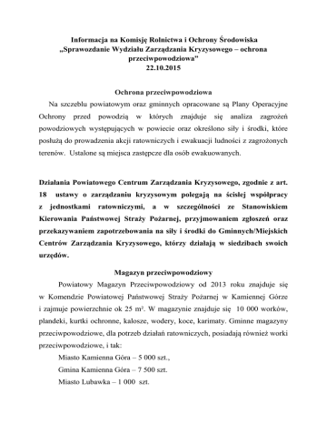 Informacja na Komisję Rolnictwa i Ochrony Środowiska „Sprawozdanie Wydziału Zarządzania Kryzysowego – ochrona przeciwpowodziowa” 22.10.2015 Ochrona przeciwpowodziowa Na szczeblu powiatowym oraz gminnych opracowane są Plany Operacyjne Ochrony przed powodzią w których znajduje się analiza zagrożeń powodziowych występujących w powiecie oraz określono siły i środki, które posłużą do prowadzenia akcji ratowniczych i ewakuacji ludności z zagrożonych terenów. Ustalone są miejsca zastępcze dla osób ewakuowanych. Działania Powiatowego Centrum Zarządzania Kryzysowego, zgodnie z art. 18 ustawy o zarządzaniu kryzysowym polegają na ścisłej współpracy z jednostkami ratowniczymi, a w szczególności ze Stanowiskiem Kierowania Państwowej Straży Pożarnej, przyjmowaniem zgłoszeń oraz przekazywaniem zapotrzebowania na siły i środki do Gminnych/Miejskich Centrów Zarządzania Kryzysowego, którzy działają w siedzibach swoich urzędów. Magazyn przeciwpowodziowy Powiatowy Magazyn Przeciwpowodziowy od 2013 roku znajduje się w Komendzie Powiatowej Państwowej Straży Pożarnej w Kamiennej Górze i zajmuje powierzchnie ok 25 m². W magazynie znajduje się 10 000 worków, plandeki, kurtki ochronne, kalosze, wodery, koce, karimaty. Gminne magazyny przeciwpowodziowe, dla potrzeb działań ratowniczych, posiadają również worki przeciwpowodziowe, i tak: Miasto Kamienna Góra – 5 000 szt., Gmina Kamienna Góra – 7 500 szt. Miasto Lubawka – 1 000 szt. Gmina Marciszów – 3 200 szt. Ponadto straż pożarna posiada w swoich magazynach około 22 tysięcy worków. Łącznie około 48 700 worków. Urzędy gmin podpisały umowy na dostawę piasku dla potrzeb akcji ratowniczych praktycznie w nieograniczonych ilościach. Ustawa o Zarządzaniu Kryzysowym zobowiązuje do zabezpieczenia w budżetach gmin i powiatu rezerwy pieniężnej na potrzeby działań Kryzysowych, dzięki temu środki na koszty akcji są również dostępne. Lokalizacja na terenie powiatu zbiorników retencyjnych suchych i mokrych (Bukówka i Krzeszów), pozwala na znaczne ograniczanie zagrożenia powodziowego. Łącznie w zbiornikach można zgromadzić około 10 ml. m sześciennych wody powodziowej. Brak zdarzeń powodziowych w 2015 r. Susza 2015 W związku z występującymi długotrwałymi wysokimi temperaturami oraz brakiem opadów deszczu w wielu miejscowościach powiatu wystąpiły zakłócenia w dostawach wody: Przedwojów, Pisarzowice, Szczepanów, Chełmsko Śląskie, Bukówka, Paczyn, Pastewnik, Pustelnik. Woda do poszczególnych miejscowości była na bieżąco dostarczana przez jednostki Ochotniczych Straży Pożarnych. Komisje ds. suszy 1. Miasto Kamienna Góra Zarządzeniem Nr 445 z dnia 03.09.2015r Wojewoda Dolnośląski powołał Komisję Gminną do ustalenia, lustracji i określenia wysokości szkód w gospodarstwach rolnych z terenu miasta Kamiennej Góry spowodowanych suszą. Do Komisji Gminy Miejskiej Kamienna Góra wpłynęło 7 wniosków od rolników. W dniu 18.09.2015r. Komisja odbyła lustrację w terenie wszystkich szkód zgłoszonych we wnioskach i czego zostały sporządzone protokoły z oszacowania zakresu i wysokości szkód w gospodarstwach rolnych. Miejska Komisja do spraw szacowania szkód spowodowanych suszą w 2015r wysłała zbiorowe protokoły do Dolnośląskiego Urzędu Wojewódzkiego. 2. Urząd Gminy Kamienna Góra Urząd Gminy w Kamiennej Górze w związku ze zjawiskiem suszy na terenie gminy, w dniu 17.08.2015 roku wystąpił z wnioskiem do Wojewody Dolnośląskiego o powołanie stosownej komisji na terenie Gminy. Wojewoda wydał Zarządzenie Nr 380 z dnia 27 sierpnia 2015 roku o powołaniu komisji. Łącznie do Urzędu wpłynęły 84 wnioski rolników o przeprowadzenie szacunku strat, w tym 5 wniosków rolników posiadających siedzibę gospodarstwa w innej gminie (Gminy wg siedziby gospodarstwa sporządzają zbiorczy protokół strat). W następstwie przeprowadzonych szacunków ustalono: 38 gospodarstw poniosło straty powyżej 30 % w produkcji rolnej, a 41 gospodarstw odnotowało straty poniżej 30 % prowadzonej produkcji. Powyższe grupowanie gospodarstw wg. wysokości strat jest zgodne z wytycznymi dla komisji i ma znaczenie w udzielanej pomocy państwa tym gospodarstwom. 3. Urząd Gminy Marciszów Komisja d/s szacowania strat została powołana przez Wojewodę dnia 28 sierpnia 2015r, wpłynęło 39 wniosków o oszacowanie strat , w 20 wnioskach ustalono straty powyżej 30 %, właściciele tych gospodarstw mogli składać wnioski do ARiMR o dopłaty w kwocie 400 zł do 1 ha. O kredyt preferencyjny wyraziło zainteresowanie 17 gospodarstw. Dwa wniosku złożyli rolnicy posiadający grunty w innych gminach, sporządzono protokoły częściowe, które zostały oddane do rąk rolników, oraz 17 wniosków - w tych gospodarstwach ustalono straty poniżej 30%. Ci rolnicy nie mogą skorzystać z pomocy finansowej z ARiMR oraz z kredytu preferencyjnego, ale mogą się ubiegać o kredyt w ramach formy pomocy de minimis. Straty były szacowane w użytkach zielonych, ziemniakach, w zbożach - gryki i kukurydzy, bo tylko te uprawy i użytki zielone mogliśmy szacować - zgodnie z prowadzonym monitoringiem suszy przez instytut w Puławach. 4. Gmina Lubawka Komisja została powołana Zarządzeniem Wojewody Dolnośląskiego Nr 383 z dnia 27.08.2015 roku w składzie: Zofia Ditterla - UM Lubawka, Dominiska Zbrzyzna- DWODR we Wrocławiu, Lucyna Kociołek - DIR Wrocław; Ilość zgłoszonych wniosków: 60 szt. Ilość szacowanych gospodarstw 54 szt. Zakres wyszacowanych strat: strata powyżej 30% - 41 gospodarstw w powierzchni 933,71 ha Wartość straty łącznie: 2 398 242,45 zł z tego szkody w uprawach: 1 218 145,25 zł w zwierzętacg gospodarskich: 1 180 097,20 zł strata do 30% - 13 gospodarstw w powierzchni 187,67 ha Wartość straty łącznie: 224 173,26 zł z tego szkody w uprawach: 224 173,26 zł