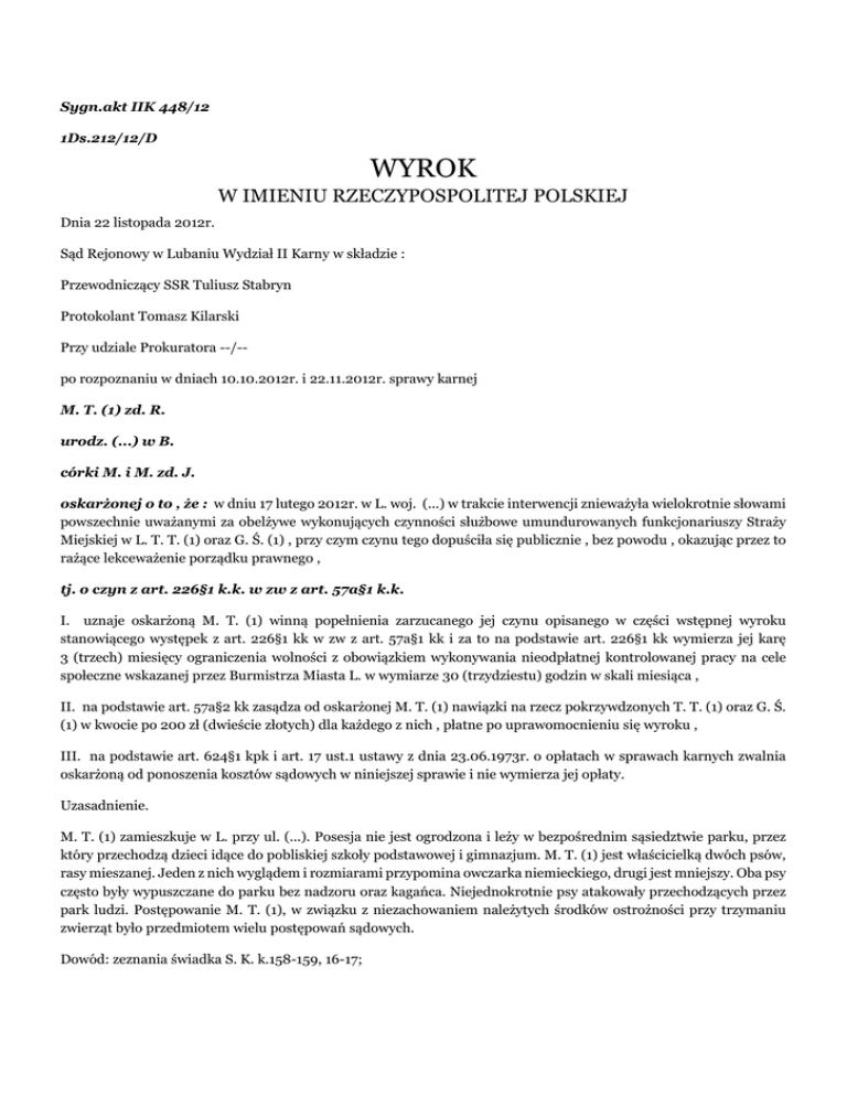 Sygn.akt IIK 448/12 1Ds.212/12/D WYROK W IMIENIU RZECZYPOSPOLITEJ POLSKIEJ Dnia 22 listopada 2012r. Sąd Rejonowy w Lubaniu Wydział II Karny w składzie : Przewodniczący SSR Tuliusz Stabryn Protokolant Tomasz Kilarski Przy udziale Prokuratora --/-po rozpoznaniu w dniach 10.10.2012r. i 22.11.2012r. sprawy karnej M. T. (1) zd. R. urodz. (...) w B. córki M. i M. zd. J. oskarżonej o to , że : w dniu 17 lutego 2012r. w L. woj. (...) w trakcie interwencji znieważyła wielokrotnie słowami powszechnie uważanymi za obelżywe wykonujących czynności służbowe umundurowanych funkcjonariuszy Straży Miejskiej w L. T. T. (1) oraz G. Ś. (1) , przy czym czynu tego dopuściła się publicznie , bez powodu , okazując przez to rażące lekceważenie porządku prawnego , tj. o czyn z art. 226§1 k.k. w zw z art. 57a§1 k.k. I. uznaje oskarżoną M. T. (1) winną popełnienia zarzucanego jej czynu opisanego w części wstępnej wyroku stanowiącego występek z art. 226§1 kk w zw z art. 57a§1 kk i za to na podstawie art. 226§1 kk wymierza jej karę 3 (trzech) miesięcy ograniczenia wolności z obowiązkiem wykonywania nieodpłatnej kontrolowanej pracy na cele społeczne wskazanej przez Burmistrza Miasta L. w wymiarze 30 (trzydziestu) godzin w skali miesiąca , II. na podstawie art. 57a§2 kk zasądza od oskarżonej M. T. (1) nawiązki na rzecz pokrzywdzonych T. T. (1) oraz G. Ś. (1) w kwocie po 200 zł (dwieście złotych) dla każdego z nich , płatne po uprawomocnieniu się wyroku , III. na podstawie art. 624§1 kpk i art. 17 ust.1 ustawy z dnia 23.06.1973r. o opłatach w sprawach karnych zwalnia oskarżoną od ponoszenia kosztów sądowych w niniejszej sprawie i nie wymierza jej opłaty. Uzasadnienie. M. T. (1) zamieszkuje w L. przy ul. (...). Posesja nie jest ogrodzona i leży w bezpośrednim sąsiedztwie parku, przez który przechodzą dzieci idące do pobliskiej szkoły podstawowej i gimnazjum. M. T. (1) jest właścicielką dwóch psów, rasy mieszanej. Jeden z nich wyglądem i rozmiarami przypomina owczarka niemieckiego, drugi jest mniejszy. Oba psy często były wypuszczane do parku bez nadzoru oraz kagańca. Niejednokrotnie psy atakowały przechodzących przez park ludzi. Postępowanie M. T. (1), w związku z niezachowaniem należytych środków ostrożności przy trzymaniu zwierząt było przedmiotem wielu postępowań sądowych. Dowód: zeznania świadka S. K. k.158-159, 16-17; zeznania świadka J. W. k. 159; zeznania świadka G. Ś. k. 159; zeznania świadka T. T. k.167; materiał fotograficzny k. 55; wykaz interwencji SM wobec oskarżonej M. T. k. 67-69. W dniu 17 lutego 2012 roku, około godziny 07.45, dwaj funkcjonariusze Straży Miejskiej w L., T. T. (1) oraz G. Ś. (1) udali się do garażu po pojazd służbowy. Garaż ten znajduje się w sąsiedztwie posesji zamieszkiwanej przez M. T. (1). Idąc przez park do S. Miejskich podbiegły dwa agresywne psy, które utrudniały im przejście. Funkcjonariusze użyli wobec nich gazu pieprzowego, co spowodowało, iż psy się wycofały. W tym czasie z posesji wyszła M. T. (1), która przywołała psy. Strażnicy Miejscy podeszli do niej przedstawiając się i wskazując przyczyny podjęcia interwencji. Słysząc to M. T. (1) zaczęła bez powodu używać słów wulgarnych. Mimo zwracania jej uwagi, aby przestała przeklinać w miejscu publicznym nie stosowała się do poleceń strażników, po czym zaczęła znieważać słowami wulgarnymi funkcjonariuszy Straży Miejskiej mówiąc do nich „odpierdolcie się”, „spierdalajcie chuje jebane”. Mimo ponownego pouczenia, iż swoim zachowaniem dopuszcza się przestępstwa, M. T. (1) nie zmieniła swojej postawy wobec interweniujących strażników, dalej kierując słowa wulgarne pod ich adresem. W tym czasie przez park przechodził dzieci udające się do szkoły. Dowód: zeznania świadka G. Ś. k. 159; zeznania świadka T. T. k.167; M. T. (1) była uprzednio karana sądownie. Dowód: odpisy wyroków k. 37,51, 61, 76, 78, 117-123; karta karna k. 124. Oskarżona M. T. (1) nie przyznała się do popełnienia zarzucanego jej czynu polegającego na wielokrotnym znieważeniu słowami wulgarnymi funkcjonariuszy Straży Miejskiej w osobach T. T. (1) i G. Ś. (1). W swoich wyjaśnieniach podkreślała, iż nie było jej tego dnia w kraju, a oskarżenia Straży Miejskiej są fałszywe i mają na celu wyłudzenie od niej pieniędzy. Przedstawiona przez oskarżoną wersja zdarzenia jest gołosłowna i nie znajduje żadnego odzwierciedlenia w zebranym materiale dowodowym. W ocenie Sądu wyjaśnienia oskarżonej nie zasługują na uwzględnienie odnośnie słuszności stawianego jej zarzutu. Przyjęta przez nią linia obrony jest lakoniczna i nie koreluje z ustaleniami poczynionymi przez Sąd. W tym stanie rzeczy Sąd odmówił przyznania walory wiarygodności jej wyjaśnieniom. Ustalenia faktyczne Sąd oparł głównie na zeznaniach świadków T. T. (1) i G. Ś. (1). Choć obaj w przedmiotowej sprawie mieli jednocześnie statut pokrzywdzonych, trudno doszukać się w ich relacjach elementów mogących świadczyć o konfabulacji czy próbie manipulowania faktami. Obaj krótko i zwięźle przedstawili przebieg zaistniałego zdarzenia, ich wypowiedzi i postawa nie zawierały cech emocjonalnych, rzeczowo i precyzyjne wypowiadali się, co do zaistniałych faktów, nieuwypuklając i nieubarwiając żadnych okoliczności. Przedstawione przez świadków zeznania są spójne i logiczne, wzajemnie się uzupełniają, tworząc logiczną całość, a nadto korelują z pozostałym materiałem dowodowym, takim jak: zeznania świadków J. W. (2) i S. K. (2) oraz odpisami wyroków, materiałem fotograficznym czy wykazem interwencji Straży Miejskiej wobec oskarżonej. Mniejsze znaczenie dla przypisania oskarżonej sprawstwa zarzucanego jej czynu, mają zeznania siwaków J. W. (2) i S. K. (2), albowiem żaden z nich nie był bezpośrednim świadkiem zaistniałego zdarzenia, a ich wiedza o nim pochodzi od pokr