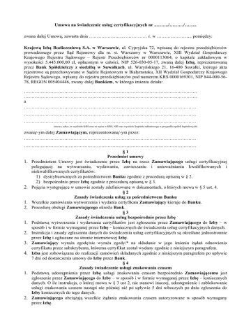 Umowa na świadczenie usług certyfikacyjnych nr ..……../………/…….. zwana dalej Umową, zawarta dnia …………………..…………… r. w ………………….. pomiędzy: Krajową Izbą Rozliczeniową S.A. w Warszawie, ul. Cypryjska 72, wpisaną do rejestru przedsiębiorców prowadzonego przez Sąd Rejonowy dla m. st. Warszawy w Warszawie, XIII Wydział Gospodarczy Krajowego Rejestru Sądowego – Rejestr Przedsiębiorców nr 0000113064, o kapitale zakładowym w wysokości 5.445.000,00 zł, opłaconym w całości, NIP 526-030-05-17, zwaną dalej Izbą, reprezentowaną przez Bank Spółdzielczy z siedzibą w Suwałkach, ul. Waryńskiego 21, 16-400 Suwałki, którego akta rejestrowe są przechowywane w Sądzie Rejonowym w Białymstoku, XII Wydział Gospodarczy Krajowego Rejestru Sądowego, wpisany do rejestru przedsiębiorców pod numerem KRS 0000169301, NIP 844-000-5678, REGON 005404446, zwany dalej Bankiem, w którego imieniu działa: ……………………………………………………………………………………….………… ……………………………………………………………………………………….………… a ………………………………………………………………………………………………… ………………………………………………………………………………………………… ………………………………………………………………………………………………… (nazwa, adres, nr wydziału KRS oraz nr wpisu w KRS, NIP oraz wysokość kapitału zakładowego w przypadku spółek kapitałowych) zwaną/-ym dalej Zamawiającym, reprezentowaną/-ym przez: ………………………………………………………………………………………………… ………………………………………………………………………………………………… §1 Przedmiot umowy 1. Przedmiotem Umowy jest świadczenie przez Izbę na rzecz Zamawiającego usługi certyfikacyjnej polegającej na wytwarzaniu, wydawaniu, zawieszaniu i unieważnianiu kwalifikowanych i niekwalifikowanych certyfikatów: 1) dystrybuowanych za pośrednictwem Banku zgodnie z procedurą opisaną w § 2. 2) bezpośrednio przez Izbę zgodnie z procedurą opisaną w § 3. 2. Pojęcia występujące w umowie zostały zdefiniowane w dokumentach, o których mowa w § 5 ust. 4. §2 Zasady świadczenia usług za pośrednictwem Banku 1. Wszelkie zamówienia wytworzenia i wydania certyfikatu Zamawiający kieruje do Banku. 2. Procedurę obsługi Zamawiającego określa Bank. §3 Zasady świadczenia usług bezpośrednio przez Izbę 1. Podstawą wytworzenia i wydawania certyfikatów jest zgłoszenie przez Zamawiającego do Izby – w sposób i w formie wymaganej przez Izbę – koniecznych do świadczenia usług certyfikacyjnych danych. 2. Instrukcja i zasady zgłaszania danych do świadczenia usług certyfikacyjnych są określane jednostronnie przez Izbę i ogłaszane na stronie internetowej Izby. 3. Zamawiający wyraża zgodę/nie wyraża zgody/* na składanie w jego imieniu żądań odnowienia certyfikatu przez subskrybenta, któremu certyfikat został wydany zgodnie z niniejszym paragrafem. 4. Izba jest zobowiązana do realizacji zamówień składanych zgodnie z niniejszym paragrafem po upływie 7 dni od dostarczenia umowy do Izby przez Bank. §4 Zasady świadczenie usługi znakowania czasem 1. Podstawą udostępnienia przez Izbę usługi znakowania czasem bezpośrednio Zamawiającemu jest zgłoszenie przez Zamawiającego do Izby – w sposób i w formie wymaganej przez Izbę – koniecznych danych. O ile instrukcja, o której mowa w § 3 ust 2, nie stanowi inaczej, udostępnienie i zablokowanie usługi znakowania czasem nastąpi nie później niż po upływie 5 dni roboczych po dniu zgłoszenia do Izby koniecznych do tego danych. 2. Zamawiającego obciążają wszelkie żądania znakowania czasem autoryzowane w sposób wymagany przez Izbę. 1. 2. 3. 4. 1. 2. 3. 4. 1. 2. 3. 4. 1. 2. §5 Zobowiązania Stron Izba zobowiązuje się do świadczenia usług certyfikacyjnych w sposób profesjonalny i na zasadach określonych w prawie i dokumentach, o których mowa w ust. 4. Zamawiający zobowiązuje się do należytego wykonywania swoich obowiązków, w szczególności z uwzględnieniem postanowień dokumentów, o których mowa w ust. 4. Odpowiedzialność Izby z tytułu świadczenia usług certyfikacyjnych oparta jest na zasadzie winy. Przy realizacji niniejszej Umowy znajdują zastosowanie publikowane na stronie internetowej Izby Polityka certyfikacji KIR S.A. dla certyfikatów kwalifikowanych, Polityka certyfikacji KIR S.A. dla certyfikatów niekwalifikowanych oraz Polityka certyfikacji KIR S.A. dla usługi znakowania czasem. §6 Płatności Zamawiający nie ponosi wobec Izby żadnych opłat z tytułu zamówień składanych zgodnie z § 2. Z tytułu zamówień, o których mowa w § 3 i 4, podstawą ustalenia wysokości płatności, terminu wystawienia faktury oraz wymagalności płatności jest każdorazowo cennik usług obowiązujący w dniu złożenia przez Zamawiającego zamówienia lub w dniu początku okresu rozliczeniowego w przypadku świadczenia usługi znakowania czasem.. Cennik usług jest publikowany na stronie internetowej Izby. Strony uznają, że dniem spełnienia świadczenia upoważniającym do wystawienia faktury przez Izbę, za wyjątkiem faktur za usługę znakowania czasem, jest dzień wytworzenia certyfikatu §7 Rozwiązanie i zmiana umowy Umowa może zostać rozwiązana przez każdą ze Stron z zachowaniem jednomiesięcznego okresu wypowiedzenia – ze skutkiem na koniec miesiąca kalendarzowego. Zmiany umowy wymagają zachowania formy pisemnej pod rygorem nieważności, z zastrzeżeniem ust. 3. Cennik usług, instrukcja, o której mowa w § 3 ust. 2, wzory formularzy związanych z wykonywaniem umowy oraz treść dokumentów, o których mowa w § 5 ust.