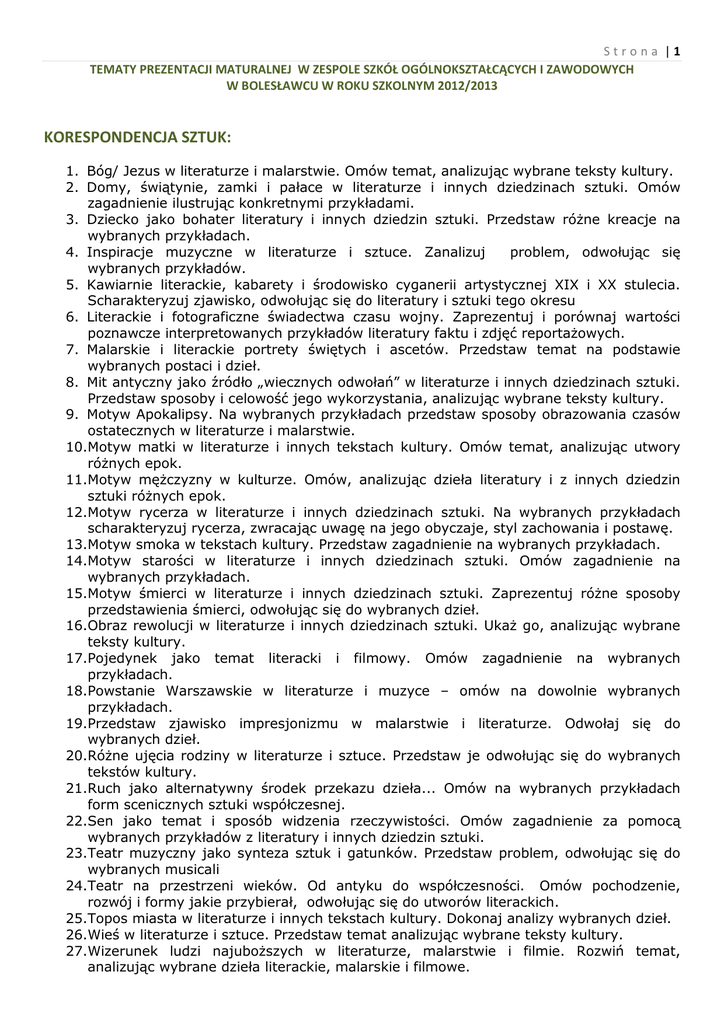 Strona |1 TEMATY PREZENTACJI MATURALNEJ W ZESPOLE SZKÓŁ OGÓLNOKSZTAŁCĄCYCH I ZAWODOWYCH W BOLESŁAWCU W ROKU SZKOLNYM 2012/2013 KORESPONDENCJA SZTUK: 1. Bóg/ Jezus w literaturze i malarstwie. Omów temat, analizując wybrane teksty kultury. 2. Domy, świątynie, zamki i pałace w literaturze i innych dziedzinach sztuki. Omów zagadnienie ilustrując konkretnymi przykładami. 3. Dziecko jako bohater literatury i innych dziedzin sztuki. Przedstaw różne kreacje na wybranych przykładach. 4. Inspiracje muzyczne w literaturze i sztuce. Zanalizuj problem, odwołując się wybranych przykładów. 5. Kawiarnie literackie, kabarety i środowisko cyganerii artystycznej XIX i XX stulecia. Scharakteryzuj zjawisko, odwołując się do literatury i sztuki tego okresu 6. Literackie i fotograficzne świadectwa czasu wojny. Zaprezentuj i porównaj wartości poznawcze interpretowanych przykładów literatury faktu i zdjęć reportażowych. 7. Malarskie i literackie portrety świętych i ascetów. Przedstaw temat na podstawie wybranych postaci i dzieł. 8. Mit antyczny jako źródło „wiecznych odwołań” w literaturze i innych dziedzinach sztuki. Przedstaw sposoby i celowość jego wykorzystania, analizując wybrane teksty kultury. 9. Motyw Apokalipsy. Na wybranych przykładach przedstaw sposoby obrazowania czasów ostatecznych w literaturze i malarstwie. 10.Motyw matki w literaturze i innych tekstach kultury. Omów temat, analizując utwory różnych epok. 11.Motyw mężczyzny w kulturze. Omów, analizując dzieła literatury i z innych dziedzin sztuki różnych epok. 12.Motyw rycerza w literaturze i innych dziedzinach sztuki. Na wybranych przykładach scharakteryzuj rycerza, zwracając uwagę na jego obyczaje, styl zachowania i postawę. 13.Motyw smoka w tekstach kultury. Przedstaw zagadnienie na wybranych przykładach. 14.Motyw starości w literaturze i innych dziedzinach sztuki. Omów zagadnienie na wybranych przykładach. 15.Motyw śmierci w literaturze i innych dziedzinach sztuki. Zaprezentuj różne sposoby przedstawienia śmierci, odwołując się do wybranych dzieł. 16.Obraz rewolucji w literaturze i innych dziedzinach sztuki. Ukaż go, analizując wybrane teksty kultury. 17.Pojedynek jako temat literacki i filmowy. Omów zagadnienie na wybranych przykładach. 18.Powstanie Warszawskie w literaturze i muzyce – omów na dowolnie wybranych przykładach. 19.Przedstaw zjawisko impresjonizmu w malarstwie i literaturze. Odwołaj się do wybranych dzieł. 20.Różne ujęcia rodziny w literaturze i sztuce. Przedstaw je odwołując się do wybranych tekstów kultury. 21.Ruch jako alternatywny środek przekazu dzieła... Omów na wybranych przykładach form scenicznych sztuki współczesnej. 22.Sen jako temat i sposób widzenia rzeczywistości. Omów zagadnienie za pomocą wybranych przykładów z literatury i innych dziedzin sztuki. 23.Teatr muzyczny jako synteza sztuk i gatunków. Przedstaw problem, odwołując się do wybranych musicali 24.Teatr na przestrzeni wieków. Od antyku do współczesności. Omów pochodzenie, rozwój i formy jakie przybierał, odwołując się do utworów literackich. 25.Topos miasta w literaturze i innych tekstach kultury. Dokonaj analizy wybranych dzieł. 26.Wieś w literaturze i sztuce. Przedstaw temat analizując wybrane teksty kultury. 27.Wizerunek ludzi najuboższych w literaturze, malarstwie i filmie. Rozwiń temat, analizując wybrane dzieła literackie, malarskie i filmowe. Strona |2 TEMATY PREZENTACJI MATURALNEJ W ZESPOLE SZKÓŁ OGÓLNOKSZTAŁCĄCYCH I ZAWODOWYCH W BOLESŁAWCU W ROKU SZKOLNYM 2012/2013 28.Wizerunek szatana w literaturze i innych dziedzinach sztuki. Porównaj sposoby przedstawiania tematu w dziełach z różnych epok. 29.Współczesna Manga i Anime jako teksty kultury. Wielość tematów, motywów i środków wyrazu. Omów zagadnienie na wybranych przykładach. 30.Żądza bogactwa i jej konsekwencje dla bohaterów literackich i filmowych. Zaprezentuj temat w odniesieniu do wybranych przykładów.