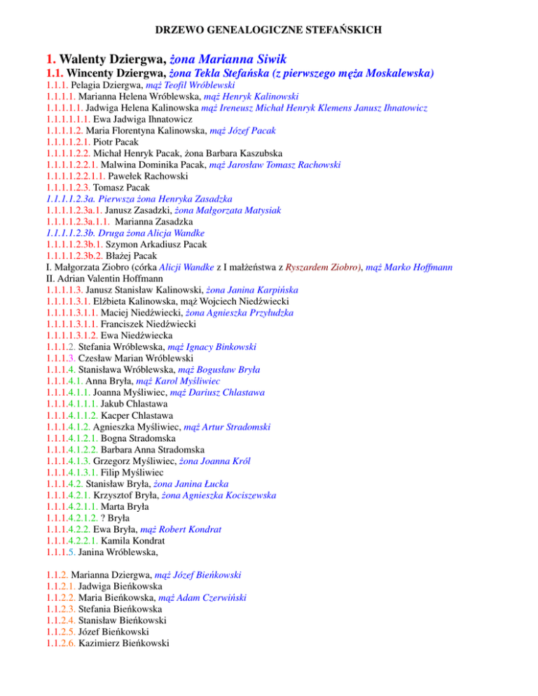 DRZEWO GENEALOGICZNE STEFAŃSKICH 1. Walenty Dziergwa, żona Marianna Siwik 1.1. Wincenty Dziergwa, żona Tekla Stefańska (z pierwszego męża Moskalewska) 1.1.1. Pelagia Dziergwa, mąż Teofil Wróblewski 1.1.1.1. Marianna Helena Wróblewska, mąż Henryk Kalinowski 1.1.1.1.1. Jadwiga Helena Kalinowska mąż Ireneusz Michał Henryk Klemens Janusz Ihnatowicz 1.1.1.1.1.1. Ewa Jadwiga Ihnatowicz 1.1.1.1.2. Maria Florentyna Kalinowska, mąż Józef Pacak 1.1.1.1.2.1. Piotr Pacak 1.1.1.1.2.2. Michał Henryk Pacak, żona Barbara Kaszubska 1.1.1.1.2.2.1. Malwina Dominika Pacak, mąż Jarosław Tomasz Rachowski 1.1.1.1.2.2.1.1. Pawełek Rachowski 1.1.1.1.2.3. Tomasz Pacak 1.1.1.1.2.3a. Pierwsza żona Henryka Zasadzka 1.1.1.1.2.3a.1. Janusz Zasadzki, żona Małgorzata Matysiak 1.1.1.1.2.3a.1.1. Marianna Zasadzka 1.1.1.1.2.3b. Druga żona Alicja Wandke 1.1.1.1.2.3b.1. Szymon Arkadiusz Pacak 1.1.1.1.2.3b.2. Błażej Pacak I. Małgorzata Ziobro (córka Alicji Wandke z I małżeństwa z Ryszardem Ziobro), mąż Marko Hoffmann II. Adrian Valentin Hoffmann 1.1.1.1.3. Janusz Stanisław Kalinowski, żona Janina Karpińska 1.1.1.1.3.1. Elżbieta Kalinowska, mąż Wojciech Niedźwiecki 1.1.1.1.3.1.1. Maciej Niedźwiecki, żona Agnieszka Przyłudzka 1.1.1.1.3.1.1. Franciszek Niedźwiecki 1.1.1.1.3.1.2. Ewa Niedźwiecka 1.1.1.2. Stefania Wróblewska, mąż Ignacy Binkowski 1.1.1.3. Czesław Marian Wróblewski 1.1.1.4. Stanisława Wróblewska, mąż Bogusław Bryła 1.1.1.4.1. Anna Bryła, mąż Karol Myśliwiec 1.1.1.4.1.1. Joanna Myśliwiec, mąż Dariusz Chlastawa 1.1.1.4.1.1.1. Jakub Chlastawa 1.1.1.4.1.1.2. Kacper Chlastawa 1.1.1.4.1.2. Agnieszka Myśliwiec, mąż Artur Stradomski 1.1.1.4.1.2.1. Bogna Stradomska 1.1.1.4.1.2.2. Barbara Anna Stradomska 1.1.1.4.1.3. Grzegorz Myśliwiec, żona Joanna Król 1.1.1.4.1.3.1. Filip Myśliwiec 1.1.1.4.2. Stanisław Bryła, żona Janina Łucka 1.1.1.4.2.1. Krzysztof Bryła, żona Agnieszka Kociszewska 1.1.1.4.2.1.1. Marta Bryła 1.1.1.4.2.1.2. ? Bryła 1.1.1.4.2.2. Ewa Bryła, mąż Robert Kondrat 1.1.1.4.2.2.1. Kamila Kondrat 1.1.1.5. Janina Wróblewska, 1.1.2. Marianna Dziergwa, mąż Józef Bieńkowski 1.1.2.1. Jadwiga Bieńkowska 1.1.2.2. Maria Bieńkowska, mąż Adam Czerwiński 1.1.2.3. Stefania Bieńkowska 1.1.2.4. Stanisław Bieńkowski 1.1.2.5. Józef Bieńkowski 1.1.2.6. Kazimierz Bieńkowski 1.1.3. Helena Dziergwa 1.1.4. Stefania Dziergwa, mąż Ludwik Andrzejewski 1.1.4.1. Stanisław Andrzejewski, żona Anna Bednarczyk 1.1.4.1.1. Ewa Andrzejewska, mąż Janusz Budzicki 1.1.4.1.1.1. Rafał Budzicki, żona Joanna Ziniewicz 1.1.4.1.1.1.1. Paweł Bruno Budzicki 1.1.4.1.1.1.2. Anna Budzicka 1.1.4.1.2. Andrzej Andrzejewski 1.1.4.2. Stefania Andrzejewska 1.1.4.3. Bolesław Andrzejewski 1.1.4.4. Edward Janusz Andrzejewski, żona Halina Kozaczuk 1.1.4.4.1. Anna Maria Andrzejewska, mąż Krzysztof Słoń 1.1.4.4.1.1. Jarosław Feliks Słoń, żona Beata Leńska 1.1.4.4.1.1a. Pierwsza żona Beata Leńska 1.1.4.4.1.1a.1. Joanna Karolina Słoń 1.1.4.4.1.1a.2. Piotr Emil Słoń 1.1.4.4.1.1a.3. Zuzanna Marika Słoń 1.1.4.4.1.1b. Drugi związek Lena Zwierzchowska 1.1.4.4.1.1b.1. Igor Zwierzchowski 1.1.4.4.1.2. Marek Słoń, żona Milena Drożniak 1.1.4.4.1.2.1. Marcin Lew Słoń 1.1.4.4.1.2.2. Mikołaj Ryś Słoń 1.1.4.4.1.3. Kaja Monika Słoń 1.1.4.4.1.3a. Pierwszy mąż Piotr Napoleon Kann 1.1.4.4.1.3a.1. Kristian Piotr Kann 1.1.4.4.1.3a.2. Krzysztof Marek Kann 1.1.4.4.1.3a.3. Jan Bolesław Kann 1.1.4.4.1.3b. Drugi związek Ryszard Korczak 1.1.4.4.1.3b.1. Dominika Anna Korczak 1.1.4.4.1.4. Aleksander Grzegorz Słoń 1.1.4.4.1.5. Maria Karina Słoń, mąż Miłowit (Kołtun) Boguszewicz 1.1.4.4.1.5.1. Zofia Antonina Boguszewicz 1.1.4.4.1.5.2. Stanisław August Boguszewicz 1.1.4.4.1.5.3. Tadeusz Jan Boguszewicz 1.1.4.4.2. Katarzyna Andrzejewska, mąż Tadeusz Wojdylak 1.1.4.4.2.1. Andrzej Wojdylak, żona Izabela Wrotniak 1.1.4.4.2.1.1. Oriana Julia Wojdylak 1.1.4.4.2.2. Magda Wojdylak, mąż Dariusz Młynarczyk 1.1.4.4.2.2.1. Agata Młynarczyk 1.1.4.4.2.2.2. Szymon Młynarczyk 1.1.4.4.3. Marcin Andrzejewski, żona Anna Kamińska 1.1.4.4.3.1. Paulina Andrzejewska, mąż Bartłomiej Durda 1.1.4.4.3.1.1. Małgorzata Durda 1.1.4.4.3.1.2. Antonina Durda 1.1.4.4.3.2. Łukasz Andrzejewski 1.1.5. Leonarda Dziergwa, mąż Teofil Bieńkowski 1.1.5.1. Kazimierz Bieńkowski, żona Nela Szczygielska 1.1.5.1.1. Janusz Bieńkowski 1.1.5.1.2. Wanda Bieńkowska, mąż ? Gabryś 1.1.5.1.3. Barbara Bieńkowska 1.1.5.1.4. Jadwiga Bieńkowska, mąż ? Dziewulski 1.1.5.2. Józef Bieńkowski, żona Nancy ? 1.1.5.1.1. Elizabeth Bieńkowska, mąż ? ? 1.1.5.1.1.1. Mikołaj ? 1.1.5.1.1.2. Helen ? 1.1.5.1.1.3. Claire ? 1.1.5.1.2. Mary Bieńkowska 1.1.5.3. Halina Bieńkowska 1.1.5.4. Stanisław Bieńkowski 1.1.5.5. Jadwiga Bieńkowska 1.1.5.5a. Pierwszy mąż Beniamin Lisiecki 1.1.5.5a.1. Anna Lisiecka, mąż Cloude Lechevalier 1.1.5.5a.1.1. Wanda Lechevalier 1.1.5.5b. Drugi mąż Włodzimierz Bazylewicz 1.1.5.5b.1. Andrzej Bazylewicz, żona Halina Lenartowska 1.1.5.5b.1.1. Anna Bazylewicz 1.1.5.5b.1.2. Danuta Bazylewicz 1.1.5.6. Mieczysław Bieńkowski, żona Irena Wilczyńska 1.1.5.6.1. Anna Bieńkowska 1.1.5.6.2. Grzegorz Bieńkowski, żona Barbara ? 1.1.5.6.2.1. Piotr Bieńkowski 1.1.5.6.3. Barbara Bieńkowska 1.1.6. Waleria Dziergwa Dzieci Tekli Stefańskiej (1.1.) i jej pierwszego męża Teofila Moskalewskiego I. Tomasz Jan Moskalewski II. Stanisława Moskalewska, mąż Władysław Cent II.I. Tomasz Cent II.II. Stanisław Cent III. Józefa Moskalewska, mąż ? Piotrowski IV. Teofil Moskalewski, żona Maria Zielińska IV.I. Stanisława Moskalewska IV.II. Henryk Moskalewski IV.III. Irena Moskalewska 1.2. Hipolit Dziergwa, żona Marianna Aleksandra Leporowska 1.2.1. Władysława Dziergwa 1.2.2. Feliks Dziergwa, żona Anna Sienkiewicz 1.2.2.1. Maria Dziergwa, mąż Michael Batrak 1.2.2.1.1. Maria Helena Batrak, mąż Franciszek Larroque 1.2.2.1.1. Filip Larroque 1.2.2.1.2. Jan Michel Batr