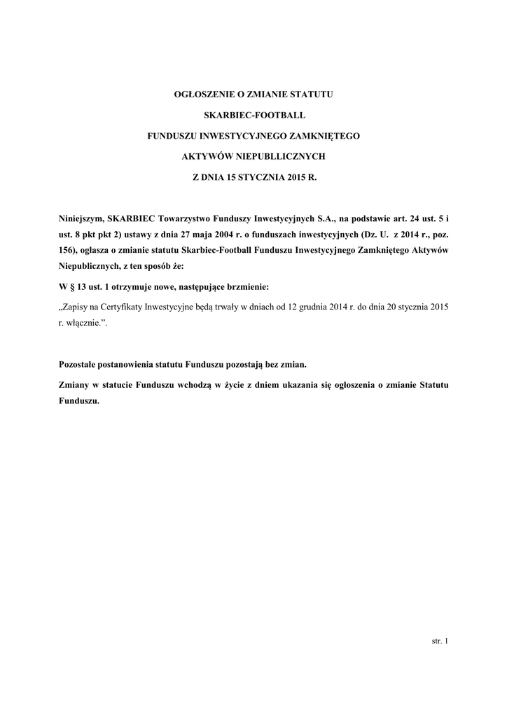 OGŁOSZENIE O ZMIANIE STATUTU SKARBIEC-FOOTBALL FUNDUSZU INWESTYCYJNEGO ZAMKNIĘTEGO AKTYWÓW NIEPUBLLICZNYCH Z DNIA 15 STYCZNIA 2015 R. Niniejszym, SKARBIEC Towarzystwo Funduszy Inwestycyjnych S.A., na podstawie art. 24 ust. 5 i ust. 8 pkt pkt 2) ustawy z dnia 27 maja 2004 r. o funduszach inwestycyjnych (Dz. U. z 2014 r., poz. 156), ogłasza o zmianie statutu Skarbiec-Football Funduszu Inwestycyjnego Zamkniętego Aktywów Niepublicznych, z ten sposób że: W § 13 ust. 1 otrzymuje nowe, następujące brzmienie: „Zapisy na Certyfikaty Inwestycyjne będą trwały w dniach od 12 grudnia 2014 r. do dnia 20 stycznia 2015 r. włącznie.”. Pozostałe postanowienia statutu Funduszu pozostają bez zmian. Zmiany w statucie Funduszu wchodzą w życie z dniem ukazania się ogłoszenia o zmianie Statutu Funduszu. str. 1