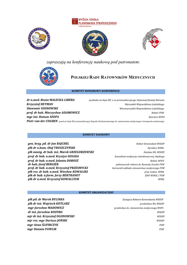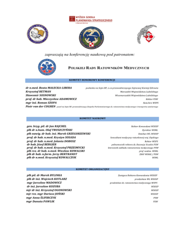 zapraszają na konferencję naukową pod patronatem: POLSKIEJ RADY RATOWNIKÓW MEDYCZNYCH KOMITET HONOROWY KONFERENCJI dr n.med. Beata MAŁECKA-LIBERA posłanka na Sejm RP, z-ca przewodniczącego Sejmowej Komisji Zdrowia Krzysztof HETMAN Marszałek Województwa Lubelskiego Sławomir SOSNOWSKI Wicemarszałek Województwa Lubelskiego prof. dr hab. Mieczysław ADAMOWICZ Rektor PSW mgr inż. Roman SZOPA Kanclerz WSPS Piotr van der COGHEN poseł na Sejm RP, przewodniczący Zespołu Parlamentarnego ds. ratownictwa medycznego i transportu sanitarnego KOMITET NAUKOWY gen. bryg. pil. dr Jan RAJCHEL płk dr n.hum. Olaf TRUSZCZYŃSKI płk nawig. dr hab. inż. Marek GRZEGORZEWSKI prof. dr hab. n.med. Krystyn SOSADA prof. dr hab. n.med. Jolanta DOBOSZ dr hab. Józef BERGIER prof. dr hab. n.med. Krzysztof PRZESMYCKI płk rez. dr hab. n.med. Wiesław KOWALSKI płk dr hab. n.farm. Jerzy BERTRANDT płk dr n.med. Krzysztof KOWALCZUK Rektor-Komendant WSOSP Dyrektor WIML Dziekan WL WSOSP konsultant medycyny ratunkowej woj. śląskiego Rektor WSPS pełnomocnik rektora ds. Rozwoju Uczelni PSW kierownik zakładu ratownictwa medycznego PSW prof. nadzw. WIML ZHiF WIHiE / PSW WIML KOMITET ORGANIZACYJNY płk pil. dr Marek BYLINKA płk dr inż. Wojciech KOTLARZ mgr Jarosław MADOWICZ dr inż. Jarosław KOZUBA mjr dr inż. Krzysztof OGONOWSKI mjr rez. mgr Dariusz JOŃSKI mgr Anna ŚLIFIRCZYK mgr Danuta PAWLIK Zastępca Rektora-Komendanta WSOSP prodziekan WL WSOSP prodziekan ds. ratownictwa medycznego WSPS WSOSP WSOSP WSOSP PSW PSW PROGRAM KONFERENCJI 17 kwietnia 2012r. (wtorek) Seminarium I PANEL I – Doświadczenia użycia procedury MEDEVAC 900 Otwarcie konferencji gen. bryg. pil. dr Jan RAJCHEL, 10 min Rektor-Komendant WSOSP Dęblin 910 Ratownictwo medyczne w zmieniającym się systemie ochrony zdrowia. prof. dr hab. n.med., dr h.c. Piotr KSIĄŻEK Prodziekan Wydziału Pielęgniarstwa i Nauk o Zdrowiu UM w Lublinie 15 min 925 WCKMed. Zadania i kierunki rozwoju. Doświadczenia Medevac z PKW. płk lek. Zbigniew ASZKIELANIEC, Komendant Wojskowego Centrum Kształcenia Medycznego w Łodzi 20 min 945 System szkolenia ratowników medycznych w zakresie ewakuacji lotniczej. mjr Szczepan WIĘCKOWSKI, Wojskowy Instytut Medycyny Lotniczej w Warszawie 15 min 1000 „BLACK HAWK” doświadczony w ratowaniu ludzkich istnień. Polskie Zakłady Lotnicze Sp. z o.o. - PZL Mielec, spółka zależna Sikorsky Aircraft Corporation 15 min 1015 AW149: najnowsze rozwiązanie stworzone w oparciu o doświadczenie AW i PZL-Świdnik w zakresie śmigłowców MEDEVAC/CASEVAC/SAR. Mieczysław MAJEWSKI Wytwórnia Sprzętu Komunikacyjnego „PZL-Świdnik” S.A., spółka z grupy AgustaWestland - Prezes Zarządu 15 min 1030 Doświadczenia INAIR jako operatora SAR i MEDEVAC. p. Jaine Arguee GIPERNAUG, 15 min INAIR 1045 Status prawny ratownika medycznego w Siłach Zbrojnych RP. mgr Barbara ADAMKIEWICZ – HEROK, Wydziału Prawa i Administracji Uniwersytetu Śląskiego w Katowicach; mgr Jarosław MADOWICZ, Wyższa Szkoła Planowania Strategicznego w Dąbrowie Górniczej 15 min 1100 Przerwa kawowa 15 min 1115 Prezentacja namiotu DRASH oraz ambulansów. 20 min 1200 Pokazy sprzętu ratownictwa medycznego, m.in.: Wozu Ewakuacji Medycznej KTO Rosomak z WCKMed; Śmigłowca W3-AE „Sokół” z PJEM 25; BKPow oraz samolotu CASA C-295 Medevac z 8. BLTr; Zintegrowany pokaz dynamiczny Combat Life Saving z udziałem Wozu Ewakuacji Medycznej i śmigłowca W3-AE „Sokół”; Śmigłowca AW149; Śmigłowca S-70i BLACK HAWK; Konferencja prasowa 120 min 1400 Obiad PANEL II – Szkolenie (kształcenie) pilotów i personelu medycznego w zakresie procedur medycznych i ewakuacji 1530 System zabezpieczenia szkolenia na symulatorach lotniczych. mgr inż. Marcin STROJEK, Wojskowy Instytut Medycyny Lotniczej w Warszawie 15 min 1545 Urazy i doświadczenia podczas awaryjnego opuszczania samolotu. dr nauk med. Krzysztof KOWALCZUK, Wojskowy Instytut Medycyny Lotniczej w Warszawie 15 min 1600 Aspekty geoprzestrzenne funkcjonowania lotniczego ratownictwa medycznego w systemie bezpieczeństwa kraju. dr Andrzej ŁASZCZUK, Państwowa Szkoła Wyższa im. Papieża Jana Pawła II w Białej Podlaskiej 15 min 1615 Wpływ transportu drogą powietrzną na stan zdrowia ewakuowanego pacjenta. dr K. ULBRYCH 15 min 1630 Szkolenie podchorążych WSOSP w zakresie udzielania pomocy medycznej na polu walki. ppor. lek. Kamila SAWKO, rat.med. Grzegorz BIAŁOMYZY, WSOSP Dęblin 15 min 1645 Wybrane aspekty przetrwania i ratownictwa w sytuacji awaryjnego lądowania statku powietrznego w wodzie. dr Paweł RÓŻAŃSKI 1,2 , mgr Michał SROKA3 1 AWF im. Józefa Piłsudskiego, Wydział WF i Sportu Biała Podlaska 2 Uniwersytet Marii Curie-Skłodowskiej Lublin 3 Państwowa Szkoła Wyższa im. Papieża Jana Pawła II Biała Podlaska 15 min 1700 Symulacja medyczna – nowoczesne narzędzie szkolenia personelu medycznego w zakresie procedur medycznych i ewakuacji medycznej. mgr K. ZIELIŃSKA 15 min 1715 Szkolenie personelu latającego w zakresie pierwszej pomocy przedmedycznej. mjr mgr inż. Rafał LEWKOWICZ, Wojskowy Instytut Medycyny Lotniczej w Warszawie 15 min 1900 Kolacja integracyjna w Sali Kolumnowej Pałacu Jabłonowskich w Dęblinie 18 kwietnia 2012r. (środa) Seminarium II PANEL III – Perspektywy zastosowania procedury ewakuacji w dziedzinach służb bezpieczeństwa państwa z uwzględnieniem zdarzeń masowych 900 Analiza działań ratowników medycznych podczas symulowanego zdarzenia pn.„Kibol” – VII międzynarodowe mistrzostwa w ratownictwie medycznym „Szczyrk 2012”. mgr Jarosław MADOWICZ, mgr Barbara ADAMKIEWICZ – HEROK, Wyższa Szkoła Planowania Strategicznego w Dąbrowie Górniczej; lic. Wojciech WALIGÓRA, Bielskie Pogotowie Ratunkowe 15 min 915 Organizacja i fazy dekontaminacji w Wojskowej Służbie Zdrowia. płk dr Artur ZDROJEWSKI, Komendant Centrum Reagowania Epidemiologicznego SZ RP 30 min 945 Rekomendowane procedury ratownictwa taktycznego w siłach zbrojnych NATO. Marc