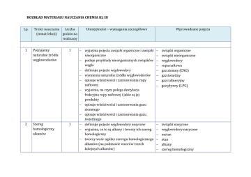 ROZKŁAD MATERIAŁU NAUCZANIA CHEMIA KL III Lp. Treści nauczania Liczba (temat lekcji) godzin na realizację 1 Poznajemy naturalne źródła węglowodorów 1 2 Szereg homologiczny alkanów 1 Umiejętności – wymagania szczegółowe wyjaśnia pojęcia związki organiczne i związki nieorganiczne podaje przykłady nieorganicznych związków węgla definiuje pojęcie węglowodory wymienia naturalne źródła węglowodorów opisuje właściwości i zastosowania ropy naftowej wyjaśnia, na czym polega destylacja frakcyjna ropy naftowej i jakie są jej produkty opisuje właściwości i zastosowania gazu ziemnego opisuje właściwości i zastosowania gazu świetlnego definiuje pojęcie węglowodory nasycone wyjaśnia, co to są alkany i tworzy ich szereg homologiczny tworzy wzór ogólny szeregu homologicznego alkanów (na podstawie wzorów trzech kolejnych alkanów) Wprowadzane pojęcia związki organiczne związki nieorganiczne węglowodory ropa naftowa gaz ziemny (CNG) gaz świetlny gaz rafineryjny gaz płynny (LPG) związki nasycone węglowodory nasycone metan etan alkany szereg homologiczny 3 Metan i etan 1 4 Właściwości i zastosowanie 1 układa wzór sumaryczny alkanu o podanej liczbie atomów węgla zapisuje wzory strukturalne i półstrukturalne alkanów wyjaśnia, na czym polega izomeria łańcuchowa i podaje przykłady izomerów przedstawia budowę cząsteczek związków chemicznych za pomocą modeli czaszowych i pręcikowo-kulkowych podaje miejsca występowania metanu opisuje właściwości fizyczne i chemiczne (reakcje spalania) metanu i etanu definiuje pojęcie spalania wyjaśnia, jaka jest różnica między spalaniem całkowitym a niecałkowitym zapisuje równania reakcji spalania całkowitego i niecałkowitego metanu oraz etanu planuje doświadczenie umożliwiające zbadanie rodzajów produktów spalania metanu wymienia zastosowania metanu i etanu wyjaśnia pojęcia: gaz błotny, mieszanina wybuchowa, czad wyjaśnia zależność między długością łańcucha węglowego a stanem skupienia, izomeria łańcuchowa izomer model pręcikowo--kulkowy cząsteczki spalanie całkowite spalanie niecałkowite gaz błotny mieszanina wybuchowa czad benzyna kraking 3 alkanów 5,6 Szeregi homologiczne alkenów i alkinów 2 7 ,8 Eten i etyn 2 lotnością i palnością alkanów zapisuje równania reakcji spalania całkowitego i niecałkowitego alkanów określa właściwości i zastosowania produktów destylacji ropy naftowej projektuje i opisuje doświadczenie badające właściwości benzyny podaje przykłady zastosowań alkanów wyjaśnia pojęcie kraking wyjaśnia pojęcie katalizator definiuje pojęcie węglowodory nienasycone wyjaśnia budowę cząsteczek alkenów oraz alkinów i na tej podstawie klasyfikuje je jako węglowodory nienasycone tworzy szeregi homologiczne alkenów i alkinów podaje wzory ogólne szeregów homologicznych alkenów i alkinów podaje zasady tworzenia nazw alkenów i alkinów na podstawie nazw alkanów zapisuje wzory strukturalne i półstrukturalne alkenów i alkinów wyjaśnia pojęcie izomeria położeniowa projektuje doświadczenia, w których wyniku można otrzymać eten lub etyn zapisuje wzory sumaryczny i strukturalny katalizator związki nienasycone węglowodory nienasycone alkeny eten (etylen) alkiny etyn (acetylen) wiązanie wielokrotne izomeria położeniowa reakcja przyłączania (addycji) reakcja substytucji reakcja polimeryzacji 9 Właściwości alkenów i alkinów 1 oraz podaje nazwę zwyczajową węglika wapnia opisuje właściwości (spalanie, przyłączanie bromu i wodoru) etenu i etynu zapisuje równania reakcji spalania całkowitego i niecałkowitego etenu i etynu projektuje doświadczenie umożliwiające odróżnienie węglowodorów nasyconych od nienasyconych zapisuje równania reakcji przyłączania bromu, chlorowodoru i wodoru do etenu i etynu opisuje zastosowania etenu i etynu wyjaśnia pojęcie reakcja substytucji wyjaśnia, na czym polega reakcja polimeryzacji zapisuje równanie reakcji polimeryzacji etenu opisuje właściwości i zastosowania polietylenu definiuje pojęcia: polimer, monomer, katalizator wyjaśnia, na czym polega piroliza metanu określa właściwości alkenów i alkinów wyjaśnia, jaką rolę w przyrodzie odgrywają węglowodory nienasycone polimer monomer katalizator polietylen karbid (węglik wapnia) piroliza metanu 5 10 Tworzywa sztuczne 1 11 Podsumowanie wiadomości o węglowodorach Sprawdzian wiadomości z działu Węgiel i jego związki z wodorem 1 12 charakteryzuje tworzywa sztuczne wymienia rodzaje polimerów (naturalne, sztuczne i syntetyczne) wyjaśnia pojęcia: tworzywa biodegradowalne, wulkanizacja podaje właściwości i zastosowania wybranych tworzyw sztucznych tworzywa sztuczne polimery naturalne, sztuczne i syntetyczne tworzywa biodegradowalne wulkanizacja 1 WĘGIEL I JEGO ZWIĄZKI Z WODOREM SZCZEGÓŁOWE WYMAGANIA NA POSZCZEGÓLNE OCENY Ocena dopuszczająca [1] 1 Uczeń: • zna podział chemii na organiczną i nieorganiczną • określa, czym zajmuje się chemia organiczna Ocena dostateczna [1 + 2] 2 Uczeń: • wymienia właściwości diamentu i grafitu • potrafi wykryć obecność węgla w związkach organicznych Ocena dobra [1 + 2 + 3] 3 Uczeń: • podaje różnice w budowie diamentu i grafitu • potrafi wykryć obecność węgla i wodoru w związkach Ocena bardzo dobra [1 + 2 + 3 + 4] 4 Uczeń: • wie, jakie są konsekwencje budowy wewnętrznej grafitu i diamentu • podaje informacje na temat • wie, co to jest alotropia • wymienia odmiany alotropowe węgla • wie, co to są węglowodory • wie, co to jest metan • podaje wzory sumaryczny i strukturalny metanu • wymienia właściwości metanu • wie, na czym polega spalanie całkowite i niecałkowite • definiuje szereg homologiczny • podaje skład gazu ziemnego • wie, jakie są zastosowania gazu ziemnego • wyjaśnia, że z gazem ziemnym należy obchodzić się ostrożnie, bo z powietrzem tworzy mieszaninę wybuchową 