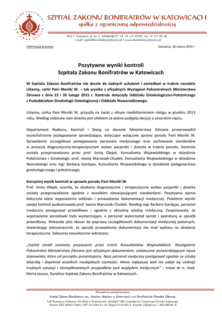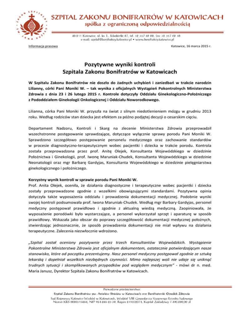 Informacja prasowa Katowice, 16 marca 2015 r. Pozytywne wyniki kontroli Szpitala Zakonu Bonifratrów w Katowicach W Szpitalu Zakonu Bonifratrów nie doszło do żadnych uchybień i zaniedbań w trakcie narodzin Lilianny, córki Pani Moniki W. – tak wynika z oficjalnych Wystąpień Pokontrolnych Ministerstwa Zdrowia z dnia 23 i 26 lutego 2015 r. Kontrole dotyczyły Oddziału Ginekologiczno-Położniczego z Pododdziałem Ginekologii Onkologicznej i Oddziału Noworodkowego. Lilianna, córka Pani Moniki W. przyszła na świat z silnym niedotlenieniem mózgu w grudniu 2013 roku. Według rodziców stan dziecka jest efektem za późno podjętej decyzji o cesarskim cięciu. Departament Nadzoru, Kontroli i Skarg na zlecenie Ministerstwa Zdrowia przeprowadził wszechstronne postępowanie sprawdzające, dotyczące wyłącznie sprawy porodu Pani Moniki W. Sprawdzono szczegółowo postępowanie personelu medycznego oraz zachowanie standardów w procesie diagnostyczno-terapeutycznym wobec pacjentki i dziecka w trakcie porodu. Kontrola została przeprowadzona przez prof. Anitę Olejek, Konsultanta Wojewódzkiego w dziedzinie Położnictwa i Ginekologii, prof. Iwonę Maruniak-Chudek, Konsultanta Wojewódzkiego w dziedzinie Neonatologii oraz mgr Barbarę Gardyjas, Konsultanta Wojewódzkiego w dziedzinie pielęgniarstwa ginekologicznego i położniczego. Korzystny wynik kontroli w sprawie porodu Pani Moniki W. Prof. Anita Olejek, oceniła, że działania diagnostyczne i terapeutyczne wobec pacjentki i dziecka zostały przeprowadzone zgodnie z wszelkimi obowiązującymi standardami. Pozytywna opinia dotyczyła także wyposażenia oddziału i prowadzenia dokumentacji medycznej. Podobnie wyniki swojej kontroli podsumowała prof. Iwona Maruniak-Chudek. Według mgr Barbary Gardyjas, personel medyczny postępował prawidłowo i zgodnie z aktualną wiedzą medyczną. Zaopiniowała, że wyposażenie porodówki było wystarczające, a personel wykorzystał sprzęt i aparaturę w sposób prawidłowy. Wskazała jako obszar do poprawy szczegółowość dokumentacji medycznej położnych, stwierdzając jednoznacznie, że sposób prowadzenia dokumentacji nie miał wpływu na działania terapeutyczne. Zalecenia niezwłocznie wdrożono. „Szpital został oceniony pozytywnie przez trzech Konsultantów Wojewódzkich. Wystąpienie Pokontrolne Ministerstwa Zdrowia jest oficjalnym dokumentem, ostatecznie potwierdzającym nasze stanowisko, które od początku prezentujemy. Nasz personel medyczny postępował zgodnie ze sztuką lekarską i dopełniał wszelkich niezbędnych czynności. Mimo najlepszej woli nie udaje się uniknąć trudnych sytuacji i skomplikowanych przypadków pod względem medycznym” - mówi dr n. med. Maria Janusz, Dyrektor Szpitala Zakonu Bonifratrów w Katowicach. Szpital Zakonu Bonifratrów w Katowicach bez uchybień w ogólnopolskiej kontroli oddziałów ginekologiczno-położniczych Niezależna kontrola została także przeprowadzona pod kierunkiem Departamentu Matki i Dziecka Ministerstwa Zdrowia. Szpital Zakonu Bonifratrów w Katowicach znalazł się na liście placówek medycznych wytypowanych do ogólnopolskiej kontroli w związku z informacjami o rzekomych nieprawidłowościach w oddziałach położniczych. Kontrola dotyczyła okresu od 1 lipca 2013 r. do 31 grudnia 2013 r. i obejmowała ocenę postępowania medycznego u wybranej grupy noworodków. Skontrolowano dziesięć przypadków, w tym ponownie narodziny Lilianny, córki Pani Moniki W. Zarówno prof. Anita Olejek, Konsultant Wojewódzki w Dziedzinie Położnictwa i Ginekologii, jak i prof. Iwona Maruniak-Chudek, Konsultant Wojewódzki w dziedzinie Neonatologii przeprowadzające kontrolę, nie stwierdziły uchybień w postępowaniu medycznym ani zmian w dokumentacji medycznej u wybranej grupy noworodków. „Dostaliśmy obiektywne dowody na to, że mamy profesjonalny zespół i wszelkie procedury są zachowywane. Potwierdziła to kolejna kontrola zlecona przez Ministerstwo Zdrowia, która była przeprowadzona według jednolitych zasad we wszystkich szpitalach ginekologiczno-położniczych w Polsce" – mówi dr n. med. Maria Janusz, Dyrektor Szpitala Bonifratrów w Katowicach. - „Konsultanci, którzy na polecenie Ministerstwa sprawdzali nasz szpital nie dopatrzyli się zaniedbań i winy po stronie personelu medycznego. Otrzymane dokumenty stanowią w naszej opinii zamknięcie sprawy i są ostatecznym rozstrzygnięciem z punktu widzenia medycznego” - podsumowuje Dyrektor Szpitala Zakonu Bonifratrów w Katowicach. Kontakt dla mediów: Damian Stępień Rzecznik Prasowy tel. kom. + 48 664 318 080 e-mail: [email protected]