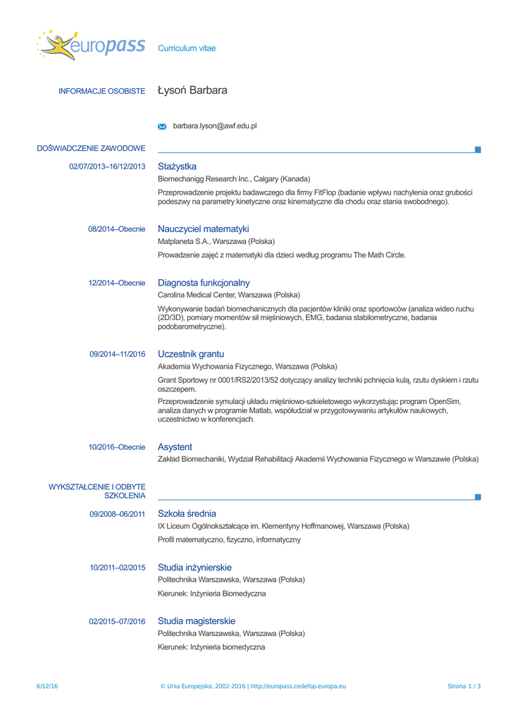 Curriculum vitae INFORMACJE OSOBISTE Łysoń Barbara [email protected] DOŚWIADCZENIE ZAWODOWE 02/07/2013–16/12/2013 Stażystka Biomechanigg Research Inc., Calgary (Kanada) Przeprowadzenie projektu badawczego dla firmy FitFlop (badanie wpływu nachylenia oraz grubości podeszwy na parametry kinetyczne oraz kinematyczne dla chodu oraz stania swobodnego). 08/2014–Obecnie Nauczyciel matematyki Matplaneta S.A., Warszawa (Polska) Prowadzenie zajęć z matematyki dla dzieci według programu The Math Circle. 12/2014–Obecnie Diagnosta funkcjonalny Carolina Medical Center, Warszawa (Polska) Wykonywanie badań biomechanicznych dla pacjentów kliniki oraz sportowców (analiza wideo ruchu (2D/3D), pomiary momentów sił mięśniowych, EMG, badania stabilometryczne, badania podobarometryczne). 09/2014–11/2016 Uczestnik grantu Akademia Wychowania Fizycznego, Warszawa (Polska) Grant Sportowy nr 0001/RS2/2013/52 dotyczący analizy techniki pchnięcia kulą, rzutu dyskiem i rzutu oszczepem. Przeprowadzenie symulacji układu mięśniowo-szkieletowego wykorzystując program OpenSim, analiza danych w programie Matlab, współudział w przygotowywaniu artykułów naukowych, uczestnictwo w konferencjach. 10/2016–Obecnie Asystent Zakład Biomechaniki, Wydział Rehabilitacji Akademii Wychowania Fizycznego w Warszawie (Polska) WYKSZTAŁCENIE I ODBYTE SZKOLENIA 09/2008–06/2011 Szkoła średnia IX Liceum Ogólnokształcące im. Klementyny Hoffmanowej, Warszawa (Polska) Profil matematyczno, fizyczno, informatyczny 10/2011–02/2015 Studia inżynierskie Politechnika Warszawska, Warszawa (Polska) Kierunek: Inżynieria Biomedyczna 02/2015–07/2016 Studia magisterskie Politechnika Warszawska, Warszawa (Polska) Kierunek: Inżynieria biomedyczna 6/12/16 © Unia Europejska, 2002-2016 | http://europass.cedefop.europa.eu Strona 1 / 3 Curriculum vitae 09/2016–Obecnie Łysoń Barbara Studia doktoranckie Politechnika Warszawska, Warszawa (Polska) Dyscyplina: biocybernetyka i inżynieria biomedyczna 08/2015 Certyfikat: Cambridge English Level 2 Certificate in ESOL International (Advanced) 07/2011 Certyfikat: ÖSD B2 Mittelstufe Deutsch UMIEJĘTNOŚCI Język ojczysty polski Inne języki ROZUMIENIE MÓWIENIE PISANIE Słuchanie Czytanie Porozumiewanie się Samodzielne wypowiadanie się niemiecki C1 B2 C1 B2 B2 angielski C1 C1 C1 C1 C1 Poziomy: A1 i A2: podstawowy - B1 i B2: średni - C1 i C2: zaawansowany Europejski system opisu kształcenia językowego Umiejętności zawodowe Wykorzystanie systemów oraz urządzeń do analizy ruchu Modelowanie układu mięśniowo- szkieletowego Analiza danych w środowisku Matlab Umiejętności cyfrowe SAMOOCENA Przetwarzanie informacji Komunikacja Tworzenie treści Bezpieczeństwo Rozwiązywanie problemów Poziom biegłości Poziom biegłości Poziom biegłości Poziom biegłości Poziom biegłości Umiejętności cyfrowe - Tabela samooceny MS-Office Matlab OpenSim SimiMotion Cortex (Motion Analysis) Autodesk Inventor Podstawy programowania w C++, Java Inne umiejętności - Ratownik WOPR (2010) -Szkolenie lodowe (2011) -Licencja nurkowa PADI OWD (2011) -Wychowawca kolonijny (2011) - Kurs pierwszej pomocy BLS/AED (2010) -ISSA Inshore Skipper (2010) 6/12/16 © Unia Europejska, 2002-2016 | http://europass.cedefop.europa.eu Strona 2 / 3 Curriculum vitae Łysoń Barbara INFORMACJE DODATKOWE Udział w konferencjach: ▪ XII Konferencja Naukowa "Majówka Młodych Biomechaników" im. prof. Dagmary Tejszerskiej (810.05.2015) ▪ Sympozjum Biomechaniki Sportu i Rehabilitacji (17-18.09.2015) ▪ XI Sympozjum "Analiza ruchu - teoria i praktyka w zastosowaniach klinicznych" (04.03.2016) ▪ Uczestnictwo w Seminarium Biomechaniki prof. Andrzeja Wita (2014-2016) ▪ Konferencja "Biomechanics 2016" (5-7.09.2016) ▪ Konferencja "Motor Control 2016" (14-16.09.2016) Publikacje i materiały konferencyjne: B. Łysoń, M. Kwacz, M. Błażkiewicz, and A. Wit, "Symulacja sił mięśniowych w kończynach dolnych podczas pchnięcia kulą," Atualne Probl. Biomech., vol. 9, pp. 73–78, 2015. M. Błażkiewicz, B. Łysoń, A. Chmielewski, and A. Wit, "Transfer of Mechanical energy during shot put," J. Hum. Kinet., 2016. B. Łysoń, M. Błażkiewicz, M. Kwacz, and A. Wit, "Simulation of the shot put of variously skilled athletes," in Biomechanics 2016, 2016. B. Łysoń, M. Błażkiewicz, M. Kwacz, and A. Wit, "Muscle forces of lower extremities in glide shot put technique," in Motor Control 2016, 2016. Plenzler M. , Lyson B., Lukaszenko A., Zielinska A., Straszewski D., Smigielski R., Popieluch M. "Evaluation of possible relationship between muscle torques of flexors and extensors of the knee joint and the pelvis mobility in frontal plane while running" in 17th ESSKA Congress, 2016. /plakat/ 6/12/16 © Unia Europejska, 2002-2016 | http://europass.cedefop.europa.eu Strona 3 / 3