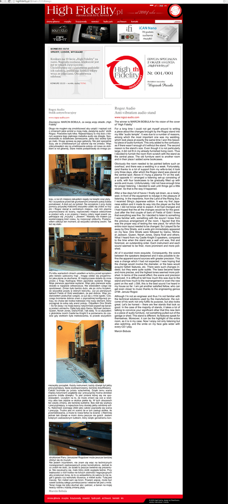 Rogoz Audio Anti-vibration audio stand www.rogoz-audio.com Zwycięzca: MARCIN BOBULA, za swoją wizję okładki „High Fidelity” The winner is MARCIN BOBULA for his vision of the cover of “High Fidelity” Długo nie mogłem się zmobilizować aby usiąść i napisać coś o zmianach jakie wniósł w moją małą „świątynię audio” stolik Rogoz. Powodów było kilka. Najważniejszy to mój ślub z którym wygrana tego pięknego mebelka audio się zbiegła. Spowodowało to dodatkowe zamieszanie, jakby bez stolika było go mało. Drugą sprawą są jego gabaryty. Nie jest specjalnie duży, ale w umeblowanym już salonie się nie zmieści. Więc zdecydowałem się na umeblowanie pokoju od nowa ze stolikiem w roli głównej. Stare meble powędrowały do innego po- For a long time I could not get myself around to writing a piece about the changes brought by the Rogoz stand into my little “audio temple”. It was due to a number of reasons, among which the most important one was my wedding, which took place at exactly the same time I won this beautiful piece of audio furniture. This only added to the confusion, as if there wasn’t enough of it without the stand. The second reason is the stand’s size. Even though it is not particularly large, it did not fit in my already furnished living room. Thus I decided to furnish the room from scratch with the stand as the central piece. The old furniture went to another room and in their place I added some bookcases. Obviously the room needed to be painted before such an overhaul, and there was a wedding in a week. Fortunately, (and thanks to a lot of support from my wife-to-be) it took only three days, after which the Rogoz stand was placed at the central spot. Above it I hung a plasma TV on the wall, and opposite it I arranged a listening set-up consisting of a sofa, with four bookcases to be gradually filled up with words and music. Unfortunately, I did not have enough time for proper listening. I decided to wait until things got a little slower. So that is the way it happened. koju, a na ich miejsce zakupiłem regały na książki oraz płyty. No i oczywiście przed tak gruntownymi zmianami pokój trzeba pomalować. A ślub już za tydzień. Na szczęście (i przy dużej pomocy przyszłej małżonki) wszystko udało się zrobić w trzy dni i Rogoz stanął w centralnym miejscu, nad nim plazma przymocowana do ściany, naprzeciwko miejsce odsłuchowe w postaci sofy, a po prawicy i lewicy cztery regał powoli zapełniające się „muzyką” i „słowem”. Niestety nie miałem już wystarczającą ilość czasu, by rozpocząć odsłuchy. Postanowiłem odłożyć ten moment, aż wszystko odrobinę zwolni. Tak też się stało. Po kilku wariackich dniach usiadłem w końcu przed sprzętem jako świeżo upieczony mąż , mogąc oddać się przyjemności jaka płynie ze słuchania. W międzyczasie dotarło do mnie prosto z Kraju Kwitnącej Wiśni japońskie wydanie Stinga. Moje pierwsze japońskie wydanie. Więc jako pierwsze wylądowało w napędzie odtwarzacza. Nie wiedziałem czego się spodziewać. Zmian było bardzo dużo, ale po cichu liczyłem, że wszystkie poszły w dobrym kierunku. Już po pierwszych taktach Fields of Gold wiedziałem, że jest dobrze. Więc postanowiłem posłuchać czegoś, co już się u mnie ograło. Coś, czego brzmienie dobrze znam z poprzedniej konfiguracji pokoju, bo chyba tak trzeba traktować mój nowy element, który pociągnął za sobą cały aranż pokoju. Odpaliłem Dire Straits – So far away i na mojej twarzy natychmiast pojawił się banan w postaci uśmiechu. Dalej były płyty Garou, Michael Jackson, Queen, Norah Jones, Diana Krall, i tak dalej. To co słyszałem z głośników moich Castle’ów Knight 5 w porównaniu do czasów gdy stolikiem była meblościanka, to przede wszystkim After a few days full of havoc I finally sat down, as a newlywed, in front of the equipment to indulge in the pleasure of listening. In the meantime, from the Land of the Rising Sun, I received Sting’s Japanese edition. It was my first Japanese edition and it made its way into the player as the first one. I did not know what to expect. A lot had changed and I had hoped that the all the changes would be for the good. Just after the first couple of bars of Fields of Gold I knew that everything was fine. So I decided to listen to something I was familiar with, something with the sound I knew from the previous arrangement of the room. I figured that this was the proper way of testing the new piece, for which the entire room layout needed to be changed. So I played So far away by Dire Straits, and a wide grin immediately appeared on my face. Dire Straits were followed by Garou, Michael Jackson, Queen, Norah Jones, Diana Krall and others. What I heard from my Castle Knight 5 speakers, compared to the time when the stand was a wall unit was, first and foremost, an outstanding order. Each instrument and each sound seemed to be finer, more prominent and more polished. All of it sounded more exquisite. Consequently, the scene between the speakers deepened and it was possible to define the apparent sound sources with greater precision. This was a change which I had not expected. I was hoping that the change would involve the diameter, or the bass would acquire hellish features, etc. There were such changes indeed, but they were quite subtle. The bass became faster and more precise, and the highest tones seemed more polished. In terms of the overall effect, the scene and precision improved. It is difficult to tell how much this was due to the stand and how much to the rearrangement or even the new paint on the wall :) Still, this is the best sound I’ve heard in my house so far. I am yet another satisfied fellow, who can get even closer to music thanks to the engineering genius of Mr. Janusz Rogoż. Although I’m not an engineer and thus I’m not familiar with the technical solutions used by the manufacturer, the outco