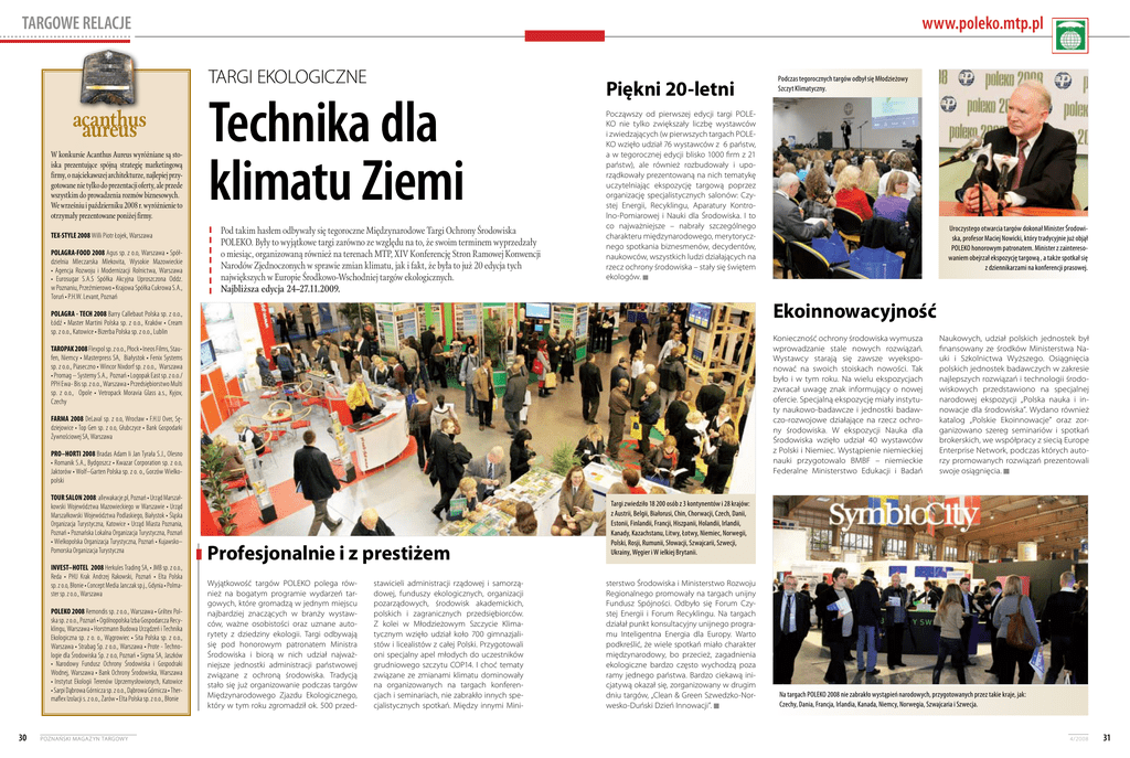 TARGOWE RELACJE www.poleko.mtp.pl TARGI ekologiczne acanthus aureus W konkursie Acanthus Aureus wyróżniane są stoiska prezentujące spójną strategię marketingową firmy, o najciekawszej architekturze, najlepiej przygotowane nie tylko do prezentacji oferty, ale przede wszystkim do prowadzenia rozmów biznesowych. We wrześniu i październiku 2008 r. wyróżnienie to otrzymały prezentowane poniżej firmy. TEX-STYLE 2008 Willi Piotr Łojek, Warszawa POLAGRA-FOOD 2008 Agus sp. z o.o, Warszawa • Spółdzielnia Mleczarska Mlekovita, Wysokie Mazowieckie • Agencja Rozwoju i Modernizacji Rolnictwa, Warszawa • Eurosugar S.A.S Spółka Akcyjna Uproszczona Oddz. w Poznaniu, Przeźmierowo • Krajowa Spółka Cukrowa S.A., Toruń • P.H.W. Levant, Poznań Technika dla klimatu Ziemi Pod takim hasłem odbywały się tegoroczne Międzynarodowe Targi Ochrony Środowiska POLEKO. Były to wyjątkowe targi zarówno ze względu na to, że swoim terminem wyprzedzały o miesiąc, organizowaną również na terenach MTP, XIV Konferencję Stron Ramowej Konwencji Narodów Zjednoczonych w sprawie zmian klimatu, jak i fakt, że była to już 20 edycja tych największych w Europie Środkowo-Wschodniej targów ekologicznych. Najbliższa edycja 24–27.11.2009. Piękni 20-letni Począwszy od pierwszej edycji targi POLEKO nie tylko zwiększały liczbę wystawców i zwiedzających (w pierwszych targach POLEKO wzięło udział 76 wystawców z 6 państw, a w tegorocznej edycji blisko 1000 firm z 21 państw), ale również rozbudowały i uporządkowały prezentowaną na nich tematykę uczytelniając ekspozycję targową poprzez organizację specjalistycznych salonów: Czystej Energii, Recyklingu, Aparatury Kontrolno-Pomiarowej i Nauki dla Środowiska. I to co najważniejsze – nabrały szczególnego charakteru międzynarodowego, merytorycznego spotkania biznesmenów, decydentów, naukowców, wszystkich ludzi działających na rzecz ochrony środowiska – stały się świętem ekologów. Konieczność ochrony środowiska wymusza wprowadzanie stale nowych rozwiązań. Wystawcy starają się zawsze wyeksponować na swoich stoiskach nowości. Tak było i w tym roku. Na wielu ekspozycjach zwracał uwagę znak informujący o nowej ofercie. Specjalną ekspozycję miały instytuty naukowo-badawcze i jednostki badawczo-rozwojowe działające na rzecz ochrony środowiska. W ekspozycji Nauka dla Środowiska wzięło udział 40 wystawców z Polski i Niemiec. Wystąpienie niemieckiej nauki przygotowalo BMBF – niemieckie Federalne Ministerstwo Edukacji i Badań TAROPAK 2008 Flexpol sp. z o.o., Płock • Ineos Films, Staufen, Niemcy • Masterpress SA, Białystok • Fenix Systems sp. z o.o., Piaseczno • Wincor Nixdorf sp. z o.o., Warszawa • Promag – Systemy S.A., Poznań • Logopak East sp. z o.o./ PPH Ewa- Bis sp. z o.o., Warszawa • Przedsiębiorstwo Multi sp. z o.o., Opole • Vetropack Moravia Glass a.s., Kyjov, Czechy FARMA 2008 DeLaval sp. z o.o, Wrocław • F.H.U Over, Sędziejowice • Top Gen sp. z o.o, Głubczyce • Bank Gospodarki Żywnościowej SA, Warszawa PRO–HORTI 2008 Bradas Adam Ii Jan Tyrała S.J., Olesno • Romanik S.A., Bydgoszcz • Kwazar Corporation sp. z o.o, Jaktorów • Wolf–Garten Polska sp. z o. o., Gorzów Wielkopolski INVEST–HOTEL 2008 Herkules Trading SA, • JMB sp. z o.o., Reda • PHU Krak Andrzej Rakowski, Poznań • Elta Polska sp. z o.o, Błonie • Concept Media Janczak sp.j., Gdynia • Polmaster sp. z o.o., Warszawa POLEKO 2008 Remondis sp. z o.o., Warszawa • Griltex Polska sp. z o.o., Poznań • Ogólnopolska Izba Gospodarcza Recyklingu, Warszawa • Horstmann Budowa Urządzeń i Technika Ekologiczna sp. z o. o., Wągrowiec • Sita Polska sp. z o.o., Warszawa • Strabag Sp. z o.o., Warszawa • Prote - Technologie dla Środowiska Sp. z o.o, Poznań • Sigma SA, Jaszków • Narodowy Fundusz Ochrony Środowiska i Gospodraki Wodnej, Warszawa • Bank Ochrony Środowiska, Warszawa • Instytut Ekologii Terenów Uprzemysłowionych, Katowice • Sarpi Dąbrowa Górnicza sp. z o.o., Dąbrowa Górnicza • Thermaflex Izolacji s. z o.o., Żarów • Elta Polska sp. z o.o., Błonie 30 POZNAŃSKI MAGAZYN TARGOW Y Uroczystego otwarcia targów dokonał Minister Środowiska, profesor Maciej Nowicki, który tradycyjnie już objął POLEKO honorowym patronatem. Minister z zainteresowaniem obejrzał ekspozycję targową , a także spotkał się z dziennikarzami na konferencji prasowej. Ekoinnowacyjność POLAGRA - TECH 2008 Barry Callebaut Polska sp. z o.o., Łódź • Master Martini Polska sp. z o.o., Kraków • Cream sp. z o.o., Katowice • Bizerba Polska sp. z o.o., Lublin TOUR SALON 2008: allewakacje.pl, Poznań • Urząd Marszałkowski Województwa Mazowieckiego w Warszawie • Urząd Marszałkowski Województwa Podlaskiego, Białystok • Śląska Organizacja Turystyczna, Katowice • Urząd Miasta Poznania, Poznań • Poznańska Lokalna Organizacja Turystyczna, Poznań • Wielkopolska Organizacja Turystyczna, Poznań • Kujawsko– Pomorska Organizacja Turystyczna Podczas tegorocznych targów odbył się Młodzieżowy Szczyt Klimatyczny. Profesjonalnie i z prestiżem Wyjątkowość targów POLEKO polega również na bogatym programie wydarzeń targowych, które gromadzą w jednym miejscu najbardziej znaczących w branży wystawców, ważne osobistości oraz uznane autorytety z dziedziny ekologii. Targi odbywają się pod honorowym patronatem Ministra Środowiska i biorą w nich udział najważniejsze jednostki administracji państwowej związane z ochroną środowiska. Tradycją stało się już organizowanie podczas targów Międzynarodowego Zjazdu Ekologicznego, który w tym roku zgromadził ok. 500 przed- stawicieli administracji rządowej i samorządowej, funduszy ekologicznych, organizacji pozarządowych, środowisk akademickich, polskich i zagranicznych przedsiębiorców. Z kolei w Młodzieżowym Szczycie Klimatycznym wzięło udział koło 700 gimn