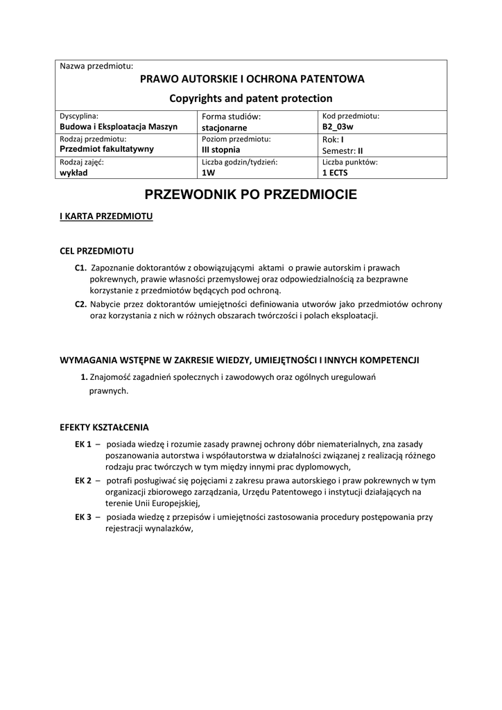 Nazwa przedmiotu: PRAWO AUTORSKIE I OCHRONA PATENTOWA Copyrights and patent protection Dyscyplina: Budowa i Eksploatacja Maszyn Forma studiów: stacjonarne Kod przedmiotu: Rodzaj przedmiotu: Przedmiot fakultatywny Poziom przedmiotu: III stopnia B2_03w Rok: I Semestr: II Rodzaj zajęć: Liczba godzin/tydzień: Liczba punktów: wykład 1W 1 ECTS PRZEWODNIK PO PRZEDMIOCIE I KARTA PRZEDMIOTU CEL PRZEDMIOTU C1. Zapoznanie doktorantów z obowiązującymi aktami o prawie autorskim i prawach pokrewnych, prawie własności przemysłowej oraz odpowiedzialnością za bezprawne korzystanie z przedmiotów będących pod ochroną. C2. Nabycie przez doktorantów umiejętności definiowania utworów jako przedmiotów ochrony oraz korzystania z nich w różnych obszarach twórczości i polach eksploatacji. WYMAGANIA WSTĘPNE W ZAKRESIE WIEDZY, UMIEJĘTNOŚCI I INNYCH KOMPETENCJI 1. Znajomość zagadnień społecznych i zawodowych oraz ogólnych uregulowań prawnych. EFEKTY KSZTAŁCENIA EK 1 – posiada wiedzę i rozumie zasady prawnej ochrony dóbr niematerialnych, zna zasady poszanowania autorstwa i współautorstwa w działalności związanej z realizacją różnego rodzaju prac twórczych w tym między innymi prac dyplomowych, EK 2 – potrafi posługiwać się pojęciami z zakresu prawa autorskiego i praw pokrewnych w tym organizacji zbiorowego zarządzania, Urzędu Patentowego i instytucji działających na terenie Unii Europejskiej, EK 3 – posiada wiedzę z przepisów i umiejętności zastosowania procedury postępowania przy rejestracji wynalazków, TREŚCI PROGRAMOWE Liczba godzin Forma zajęć – WYKŁADY W 1 – Prawo autorskie jako kategoria własności intelektualnej 1 1 2 W 2 – Autorskie prawa osobiste, majątkowe i ich treść W 3 – Przedmiot prawa autorskiego w działalności wyższych uczelni (plagiat) W 4 – Ochrona praw autorskich i praw pokrewnych W 5 – Własność przemysłowa – podstawy prawne, pojęcie wynalazku i ich rodzaje W 6 – Patentu – jego treść i zakres W 7 – Patent europejski W 8 – Wzory przemysłowe i użytkowe W 9 – Ochrona wzorów przemysłowych W 10 – Znak towarowy, usługowy, topografia układów scalonych– natura prawna, funkcje zdolność rejestrowa W 11 – Transfer technologii 1 1 2 1 1 1 1 1 1 W 12 – Domeny internetowe W 13 – Orzecznictwo 1 NARZĘDZIA DYDAKTYCZNE 1. – wykład z wykorzystaniem prezentacji multimedialnych SPOSOBY OCENY ( F – FORMUJĄCA, P – PODSUMOWUJĄCA) F1. – obecność na zajęciach seminaryjnych - aktywność P2. – ocena opanowania materiału będącego przedmiotem wykładu – pisemny test OBCIĄŻENIE PRACĄ DOKTORANTA Forma aktywności Godziny kontaktowe z prowadzącym Średnia liczba godzin na zrealizowanie aktywności 15W → 15h Godziny konsultacji z prowadzącym 5h Zapoznanie się ze wskazaną literaturą, przygotowanie do 10h seminariów, wykonanie zadań domowych Suma SUMARYCZNA LICZBA PUNKTÓW ECTS DLA PRZEDMIOTU ∑ 30 h 1 ECTS 2 LITERATURA PODSTAWOWA I UZUPEŁNIAJĄCA 1. Ustawa z dnia 4 lutego 1994 r. o prawie autorskim i prawach pokrewnych (Dz.U.1994.24.83) 2. Ustawa z dnia 30 czerwca 2000 r. Prawo własności przemysłowej ( Dz.U. z 2003.119.117) 3. Ustawa z dnia 27 lipca 2001 r. o ochronie baz danych (Dz.U.2001.128.1402) 4. Ustawa z dnia 16 kwietnia 1993 r. o zwalczaniu nieuczciwej konkurencji (Dz.U.z 2003.153.1503). 5. Cieciura M.: Wybrane problemy społeczne i zawodowe informatyki. Wyd. VIZJA PRESSIT, Sp. z o. o., Warszawa, 2009 6. Hetman J.: Podstawy prawa własności intelektualnej. Warszawa, 2008 7. Michniewicz G.: Ochrona własności intelektualnej. Wyd. C.H. BECK, 2010 8. Dereń A. M.: Własność intelektualna i przemysłowa. Oficyna Wydawnicza PWSN, Nysa 2007 9. Kotarba W.: Ochrona wiedzy w Polsce. Wyd. Orgmasz, Warszawa 2005 10. Prawo wynalazcze a twórczość techniczna. Praca zbiorowa pod red. W. Kotarby 11. Kotarba W.: Ochrona własności przemysłowej w gospodarce polskiej w dostosowaniu do wymogów Unii Europejskiej i Światowej Organizacji Handlu, Warszawa 2000 12. Nowicka A.: Prawno-autorska i patentowa ochrona programów komputerowych, W-wa 1995 13. Sas K., Woźniak J.: Przewodnik z Zakresu Własności Intelektualnej. Publikacja opracowana na podstawie projektu „Chroń swoją wiedzę – wsparcie ochrony własności intelektualnej przedsiębiorców Polski Wschodniej”, Rzeszów, 2011 PROWADZĄCY PRZEDMIOT ( IMIĘ, NAZWISKO, ADRES E-MAIL) dr inż. Włodzimierz Baranowski baranowski @ipp.pcz.pl MACIERZ REALIZACJI EFEKTÓW KSZTAŁCENIA Efekt kształcenia EK1 EK2, EK3 Odniesienie danego efektu do efektów zdefiniowanych dla całego programu (PEK) K_W07, KW_08, KW_09, K_K03 K_U12, K_U13 K_K03 Cele przedmiotu Treści programowe Narzędzia dydaktyczne Sposób oceny C1, C2 W1-5, W12-13, 1 P1, P2 C1, C2 W6-13 1 P2, F1 II. FORMY OCENY - SZCZEGÓŁY Na pierwszych zajęciach prowadzący przedstawia skalę ocen i sposób weryfikacji efektów kształcenia na studiach III stopnia. 3