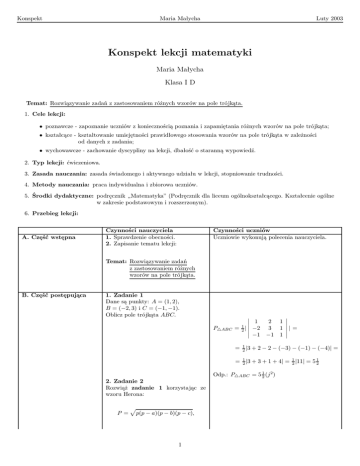 Konspekt Maria Małycha Luty 2003 Konspekt lekcji matematyki Maria Małycha Klasa I D Temat: Rozwiązywanie zadań z zastosowaniem różnych wzorów na pole trójkąta. 1. Cele lekcji: • poznawcze - zapoznanie uczniów z koniecznością poznania i zapamiętania różnych wzorów na pole trójkąta; • kształcące - kształtowanie umiejętności prawidłowego stosowania wzorów na pole trójkąta w zależności od danych z zadania; • wychowawcze - zachowanie dyscypliny na lekcji, dbałość o staranną wypowiedź. 2. Typ lekcji: ćwiczeniowa. 3. Zasada nauczania: zasada świadomego i aktywnego udziału w lekcji, stopniowanie trudności. 4. Metody nauczania: praca indywidualna i zbiorowa uczniów. 5. Środki dydaktyczne: podręcznik „Matematyka” (Podręcznik dla liceum ogólnokształcącego. Kształcenie ogólne w zakresie podstawowym i rozszerzonym). 6. Przebieg lekcji: A. Część wstępna Czynności nauczyciela 1. Sprawdzenie obecności. 2. Zapisanie tematu lekcji: Czynności uczniów Uczniowie wykonują polecenia nauczyciela. Temat: Rozwiązywanie zadań z zastosowaniem różnych wzorów na pole trójkąta. B. Część postępująca 1. Zadanie 1 Dane są punkty: A = (1, 2), B = (−2, 3) i C = (−1, −1). Oblicz pole trójkąta ABC. P△ABC 1 1 = 2 | −2 −1 2 1 3 1 | = −1 1 = 12 |3 + 2 − 2 − (−3) − (−1) − (−4)| = = 21 |3 + 3 + 1 + 4| = 12 |11| = 5 21 2. Zadanie 2 Rozwiąż zadanie 1 korzystając ze wzoru Herona: P = p p(p − a)(p − b)(p − c), 1 Odp.: P△ABC = 5 21 (j 2 ) Konspekt Maria Małycha gdzie p = Luty 2003 a+b+c . 2 POWTÓRZENIE: |BC| = p (xC − xB )2 + (yC − yB )2 a = |BC| = = p √ √ (−1 + 2)2 + (−4)2 = 1 + 16 = 17 b = |AC| = = p (−1 − 1)2 + (−1 − 2)2 = p √ √ (−2)2 + (−3)2 = 4 + 9 = 13 c = |BA| = = p (−1 − (−2))2 + (−1 − 3)2 = p (1 − (−2))2 + (2 − 3)2 = p √ √ (1 + 2)2 + (−1)2 = 32 + 1 = 10 p= √ √ √ 17+ 13+ 10 2 p−a= = p−b= = p−c= = P = √ √ √ 17+ 13+ 10 2 − √ 17 = √ √ √ √ 17+ 13+ 10−2 17 2 √ √ √ 17+ 13+ 10 2 − √ √ 17+ 13+ 10 2 − √ √ √ 13+ 10− 17 2 √ 13 = √ √ √ √ 17+ 13+ 10−2 13 2 √ = = √ √ √ 17+ 10− 13 2 √ 10 = √ √ √ √ 17+ 13+ 10−2 10 2 = √ √ √ 17+ 13− 10 2 √ √ √ √ √ 17+ 13+ 10 · 13+ 210− 17 · 2 q√ √ √ √ √ √ 17+ 10− 13 · 17+ 213− 10 · 2 q√ UWAGA: Powyższe rozwiązanie wyjaśnia jak ważny jest wybór właściwego wzoru na pole trójkąta. 3. Zadanie 1/246 Oblicz pole trójkąta równobocznego, gdy: √ a) długość boku jest równa 3 2, b) wysokość jest równa 4, c) obwód jest równy 39. a) √ DANE: a = 3 2 - długość boku trójkąta równobocznego SZUKANE: P - pole trójkąta równobocznego ROZWIĄZANIE: Korzystając ze √ wzoru na pole trójkąta równobocznego: P = 43 a2 mamy: P = √ 3 4 (3 √ 2 2) = √ √ 3 4 ·9·2 = √ 9 3 2 Odp.: P = 9 2 3 (j 2 ) b) DANE: h - wysokość trójkąta równobocznego 2 Konspekt Maria Małycha Luty 2003 SZUKANE: P - pole trójkąta równobocznego ZAŁOŻENIE: a > 0, gdzie a - długość boku trójkąta równobocznego ROZWIĄZANIE: Z twierdzenia Pitagorasa mamy: 2 1 2a + h 2 = a2 h2 = a2 − 41 a2 h2 = 34 a2 a2 = 34 h2 a = √23 h ∨ a = − √23 h a>0 a= √ 2 3 3 h Ponieważ h = 4 więc: a= √ 2 3 3 ·4= √ 8 3 3 P = 12 ah P = 1 2 · √ 8 3 3 ·4= √ 16 3 3 √ Odp.: P = 163 3 (j 2 ) c) DANE: O = 39 - obwód trójkąta równobocznego SZUKANE: P - pole trójkąta równobocznego ROZWIĄZANIE: a= O 3 a= 39 3 P = = 13 √ 3 2 4 13 Odp.: P = C. Część podsumowująca D. Praca domowa Każde zadanie można rozwiązać różnymi sposobami, jednak wybieramy najkrótsze i najprostsze rozwiązanie korzystając z odpowiedniego wzoru na pole trójkąta. Zadania 2, 3, 4 /247 3 = √ 169 3 4 √ 169 3 2 4 (j )
