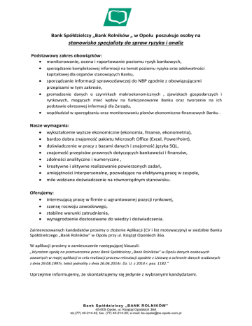 Bank Spółdzielczy „Bank Rolników „ w Opolu poszukuje osoby na stanowisko specjalisty do spraw ryzyka i analiz Podstawowy zakres obowiązków: monitorowanie, ocena i raportowanie poziomu ryzyk bankowych, sporządzanie kompleksowej informacji na temat poziomu ryzyka oraz adekwatności kapitałowej dla organów stanowiących Banku, sporządzanie informacji sprawozdawczej do NBP zgodnie z obowiązującymi przepisami w tym zakresie, gromadzenie danych o czynnikach makroekonomicznych , zjawiskach gospodarczych i rynkowych, mogących mieć wpływ na funkcjonowanie Banku oraz tworzenie na ich podstawie okresowej informacji dla Zarządu, współudział w sporządzaniu oraz monitorowaniu planów ekonomiczno-finansowych Banku . Nasze wymagania: wykształcenie wyższe ekonomiczne (ekonomia, finanse, ekonometria), bardzo dobra znajomość pakietu Microsoft Office (Excel, PowerPoint), doświadczenie w pracy z bazami danych i znajomość języka SQL, znajomość przepisów prawnych dotyczących bankowości i finansów, zdolności analityczne i numeryczne , kreatywne i aktywne realizowanie powierzonych zadań, umiejętności interpersonalne, pozwalające na efektywną pracę w zespole, mile widziane doświadczenie na równorzędnym stanowisku. Oferujemy: interesującą pracę w firmie o ugruntowanej pozycji rynkowej, szansę rozwoju zawodowego, stabilne warunki zatrudnienia, wynagrodzenie dostosowane do wiedzy i doświadczenia. Zainteresowanych kandydatów prosimy o złożenie Aplikacji (CV i list motywacyjny) w siedzibie Banku Spółdzielczego „Bank Rolników” w Opolu przy ul. Książąt Opolskich 36a. W aplikacji prosimy o zamieszczenie następującej klauzuli: „Wyrażam zgodę na przetwarzanie przez Bank Spółdzielczy „Bank Rolników” w Opolu danych osobowych zawartych w mojej aplikacji w celu realizacji procesu rekrutacji zgodnie z Ustawą o ochronie danych osobowych z dnia 29.08.1997r, tekst jednolity z dnia 26.06.2014r. Dz. U. z 2014 r. poz. 1182.” Uprzejmie informujemy, że skontaktujemy się jedynie z wybranymi kandydatami. Bank Spółdzielcz y „BANK ROLNIKÓW” 45-005 Opole, ul. Książąt Opolskich 36A tel.(77) 40-214-42, fax. (77) 40-214-20; e-mail: [email protected]