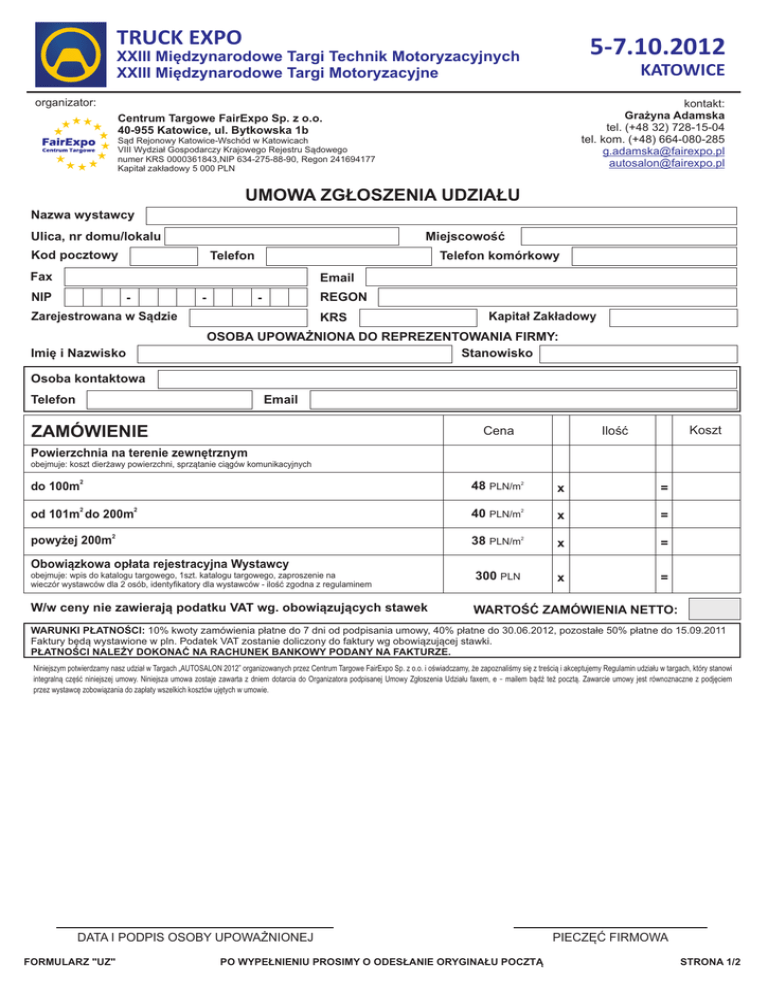 TRUCK EXPO 5-7.10.2012 XXIII Miêdzynarodowe Targi Technik Motoryzacyjnych XXIII Miêdzynarodowe Targi Motoryzacyjne KATOWICE organizator: kontakt: Gra¿yna Adamska tel. (+48 32) 728-15-04 tel. kom. (+48) 664-080-285 [email protected] [email protected] Centrum Targowe FairExpo Sp. z o.o. 40-955 Katowice, ul. Bytkowska 1b S¹d Rejonowy Katowice-Wschód w Katowicach VIII Wydzia³ Gospodarczy Krajowego Rejestru S¹dowego numer KRS 0000361843,NIP 634-275-88-90, Regon 241694177 Kapita³ zak³adowy 5 000 PLN UMOWA ZG£OSZENIA UDZIA£U Nazwa wystawcy Ulica, nr domu/lokalu Miejscowoœæ Kod pocztowy Telefon Telefon komórkowy Fax Email NIP - - REGON - Zarejestrowana w S¹dzie Imiê i Nazwisko KRS Kapita³ Zak³adowy OSOBA UPOWA¯NIONA DO REPREZENTOWANIA FIRMY: Stanowisko Osoba kontaktowa Email Telefon ZAMÓWIENIE Cena Koszt Iloœæ Powierzchnia na terenie zewnêtrznym obejmuje: koszt dier¿awy powierzchni, sprz¹tanie ci¹gów komunikacyjnych do 100m2 48 PLN/m 2 x = od 101m2 do 200m2 40 PLN/m 2 x = powy¿ej 200m2 38 PLN/m 2 x = x = Obowi¹zkowa op³ata rejestracyjna Wystawcy obejmuje: wpis do katalogu targowego, 1szt. katalogu targowego, zaproszenie na wieczór wystawców dla 2 osób, identyfikatory dla wystawców - iloœæ zgodna z regulaminem 300 PLN W/w ceny nie zawieraj¹ podatku VAT wg. obowi¹zuj¹cych stawek WARTOŒÆ ZAMÓWIENIA NETTO: WARUNKI P£ATNOŒCI: 10% kwoty zamówienia p³atne do 7 dni od podpisania umowy, 40% p³atne do 30.06.2012, pozosta³e 50% p³atne do 15.09.2011 Faktury bêd¹ wystawione w pln. Podatek VAT zostanie doliczony do faktury wg obowi¹zuj¹cej stawki. P£ATNOŒCI NALE¯Y DOKONAÆ NA RACHUNEK BANKOWY PODANY NA FAKTURZE. Niniejszym potwierdzamy nasz udziaù w Targach „AUTOSALON 2012” organizowanych przez Centrum Targowe FairExpo Sp. z o.o. i oúwiadczamy, ýe zapoznaliúmy siæ z treúcià i akceptujemy Regulamin udziaùu w targach, który stanowi integralnà czæúã niniejszej umowy. Niniejsza umowa zostaje zawarta z dniem dotarcia do Organizatora podpisanej Umowy Zgùoszenia Udziaùu faxem, e – mailem bàdê teý pocztà. Zawarcie umowy jest równoznaczne z podjæciem przez wystawcæ zobowiàzania do zapùaty wszelkich kosztów ujætych w umowie. DATA I PODPIS OSOBY UPOWA¯NIONEJ FORMULARZ "UZ" PO WYPE£NIENIU PROSIMY O ODES£ANIE ORYGINA£U POCZT¥ PIECZÊÆ FIRMOWA STRONA 1/2 TRUCK EXPO XXIII Miêdzynarodowe Targi Technik Motoryzacyjnych XXIII Miêdzynarodowe Targi Motoryzacyjne organizator: 5-7.10.2012 KATOWICE kontakt: Gra¿yna Adamska tel. (+48 32) 728-15-04 tel. kom. (+48) 664-080-285 [email protected] [email protected] Centrum Targowe FairExpo Sp. z o.o. 40-955 Katowice, ul. Bytkowska 1b S¹d Rejonowy Katowice-Wschód w Katowicach VIII Wydzia³ Gospodarczy Krajowego Rejestru S¹dowego numer KRS 0000361843,NIP 634-275-88-90, Regon 241694177 Kapita³ zak³adowy 5 000 PLN REGULAMIN UDZIA£U W TARGACH A. Postanowienia niniejszego Regulaminu Udzia³u w Targach stanowi¹ integraln¹ czeœæ Umowy Zg³oszenia Udzia³u w targach i obowi¹zuj¹ wszystkich uczestników targów i wystaw (dalej Wystawca) organizowanych przez Centrum Targowe FairExpo Sp. z o.o. z siedzib¹ w Katowicach (40-955), ul. Bytkowska 1 B wpisanej do Rejestru Przedsiêbiorców prowadzonego przez S¹d Rejonowy Katowice Wschód w Katowicach pod numerem KRS 0000361843 (dalej Organizator). Wszelkie zmiany Umowy Zg³oszenia Udzia³u, w tym Regulaminu, musz¹ byæ dokonywane w formie pisemnej i podpisane przez upowa¿nionego przedstawiciela Centrum Targowego FairExpo Sp. z o.o. (zwanego dalej Organizatorem), i osoby umocowane do reprezentowania Wystawcy. B. Warunkiem udzia³u w targach jest zawarcie miêdzy Wystawc¹ a Organizatorem „Umowy Zg³oszenia Udzia³u” oraz zap³ata ca³oœci wynagrodzenia wynikaj¹cego z Umowy Zg³oszenia Udzia³u. Osoby podpisuj¹ce „Umowê Zg³oszenia Udzia³u” oœwiadczaj¹ jednoczeœnie, ¿e posiadaj¹ umocowanie do reprezentowania Wystawcy , wynikaj¹ce z wpisu do w³aœciwego rejestru albo pe³nomocnictwa. Podpisany orygina³ Umowy Zg³oszenia Udzia³u winien zostaæ niezw³ocznie przes³any do Organizatora drog¹ pocztow¹. C. Organizator zobowi¹zuje siê do umieszczenia w widocznym miejscu Regulaminu Budynku i przepisów przeciwpo¿arowych. Wystawcy zobowi¹zani s¹ do zapoznania siê i przestrzegania zawartych w nich przepisów i postanowieñ. D. Prawa wystawcy, a w szczególnoœci prawo do najmu powierzchni nie mog¹ byæ cedowane przez Wystawcê na ¿adn¹ inn¹ firmê ani osobê bez zgody Organizatora i op³acenia stosownych op³at. Wystawca ponosi odpowiedzialnoœæ za wszelkie dzia³ania Wspó³wystawców, w tym szczególnie przestrzegania ww. przepisów obowi¹zuj¹cych w trakcie trwania imprezy. E. Firmy wykonuj¹ce zabudowê stoisk na terenie Fairexpo mog¹ œwiadczyæ us³ugi zabudowy wy³¹cznie po nabyciu licencji w³aœciciela obiektu - Fairexpo. Koszt licencji wynosi 20 z³/ m2 powierzchni zabudowywanej w pawilonie i na terenie otwartym. F. Wystawca ma prawo eksponowaæ i reklamowaæ swoje towary wy³¹cznie na wykupionym stoisku pod warunkiem, ¿e eksponaty nie zas³oni¹ s¹siednich ekspozycji ani nie zak³óc¹ normalnego toku pracy innych wystawców. Zakazuje siê u¿ywania urz¹dzeñ nag³aœniaj¹cych, dodatkowego oœwietlenia itp., które mog¹ zak³óciæ normalny tok pracy innych wystawców. G. Wystawca nie mo¿e organizowaæ ¿adnych akcji promocyjnych poza obrêbem swojego stoiska bez zgody Organizatora. Umieszczanie reklam poza obrêbem wykupionego stoiska jest p³atne dodatkowo. H. Wystawca jest zobowi¹zany do przebywania na stoisku w godzinach otwarcia wystawy i pos³ugiwania siê przy wejœciu i wyjœciu z hali wystawowej identyfikatorami wydanymi przez Organizatora. Na ka¿de 6 m2 powierzchni przypada 1 bezp³atny identyfikator. I. Wystawcy nie wolno demontowaæ stoiska i usuwaæ eksponatów w czasie trwania wystawy, tj. przed terminem jej oficjalnego zakoñczenia. Przez ca³y okres wystawy oraz w czasie instalowania 