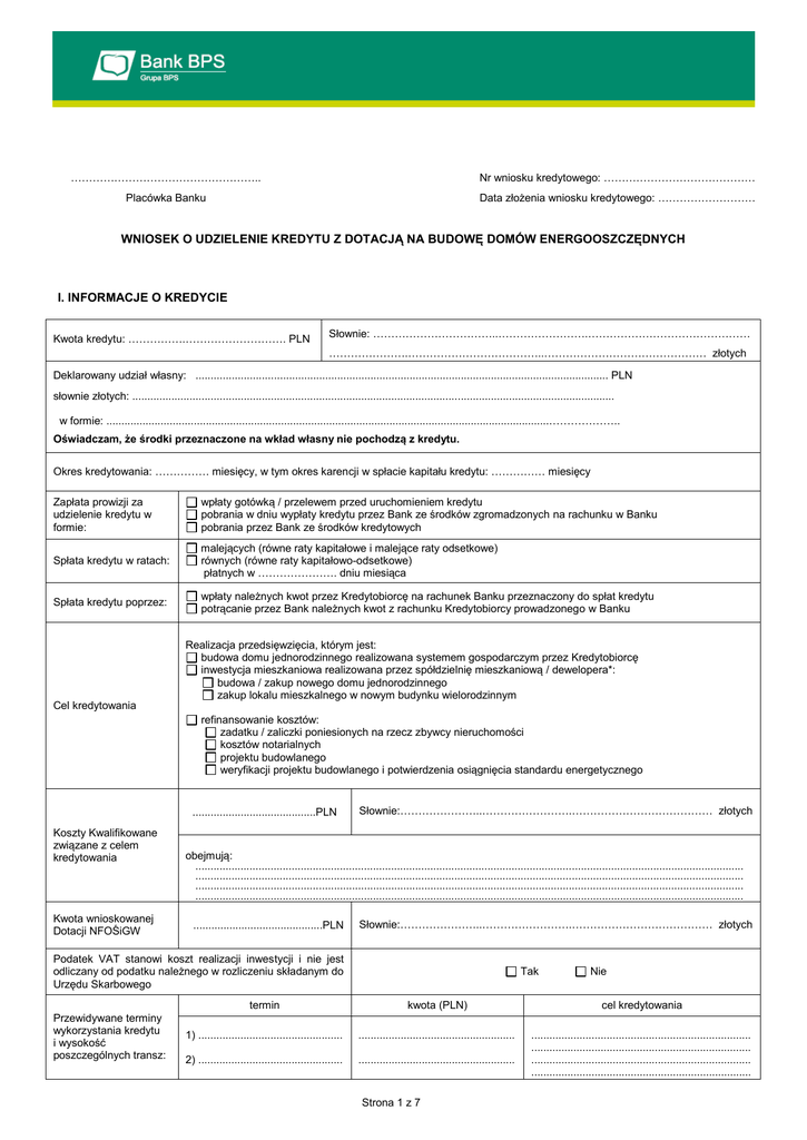 …………………………………………….. Nr wniosku kredytowego: …………………………………… Placówka Banku Data złożenia wniosku kredytowego: ……………………… WNIOSEK O UDZIELENIE KREDYTU Z DOTACJĄ NA BUDOWĘ DOMÓW ENERGOOSZCZĘDNYCH I. INFORMACJE O KREDYCIE Kwota kredytu: …………….………………………. PLN Słownie: ……………………………..…………………….……………………………………… ………………….………………………………..……………………………………… złotych Deklarowany udział własny: ......................................................................................................................................... PLN słownie złotych: ................................................................................................................................................................ w formie: ...................................................................................................................................................……………….. Oświadczam, że środki przeznaczone na wkład własny nie pochodzą z kredytu. Okres kredytowania: …………… miesięcy, w tym okres karencji w spłacie kapitału kredytu: …………… miesięcy Zapłata prowizji za udzielenie kredytu w formie: wpłaty gotówką / przelewem przed uruchomieniem kredytu pobrania w dniu wypłaty kredytu przez Bank ze środków zgromadzonych na rachunku w Banku pobrania przez Bank ze środków kredytowych Spłata kredytu w ratach: malejących (równe raty kapitałowe i malejące raty odsetkowe) równych (równe raty kapitałowo-odsetkowe) płatnych w …………………. dniu miesiąca Spłata kredytu poprzez: wpłaty należnych kwot przez Kredytobiorcę na rachunek Banku przeznaczony do spłat kredytu potrącanie przez Bank należnych kwot z rachunku Kredytobiorcy prowadzonego w Banku Realizacja przedsięwzięcia, którym jest: budowa domu jednorodzinnego realizowana systemem gospodarczym przez Kredytobiorcę inwestycja mieszkaniowa realizowana przez spółdzielnię mieszkaniową / dewelopera*: budowa / zakup nowego domu jednorodzinnego zakup lokalu mieszkalnego w nowym budynku wielorodzinnym Cel kredytowania refinansowanie kosztów: zadatku / zaliczki poniesionych na rzecz zbywcy nieruchomości kosztów notarialnych projektu budowlanego weryfikacji projektu budowlanego i potwierdzenia osiągnięcia standardu energetycznego .........................................PLN Koszty Kwalifikowane związane z celem kredytowania Kwota wnioskowanej Dotacji NFOŚiGW Słownie:…………………..…………………….………………………………… złotych obejmują: ...................................................................................................................................................................................... ...................................................................................................................................................................................... ...................................................................................................................................................................................... ...................................................................................................................................................................................... ...........................................PLN Słownie:…………………..…………………….………………………………… złotych Podatek VAT stanowi koszt realizacji inwestycji i nie jest odliczany od podatku należnego w rozliczeniu składanym do Urzędu Skarbowego Przewidywane terminy wykorzystania kredytu i wysokość poszczególnych transz: Tak Nie termin kwota (PLN) cel kredytowania 1) ................................................ .................................................... 2) ................................................ .................................................... ......................................................................... ......................................................................... ......................................................................... ......................................................................... Strona 1 z 7 3) ................................................ .................................................... 4) ................................................ .................................................... 5) ................................................ .................................................... ......................................................................... ......................................................................... ......................................................................... ......................................................................... ......................................................................... ......................................................................... Planowany termin zakończenia inwestycji Wartość nieruchomości będącej zabezpieczeniem kredytu: Słownie: ……………………………..…………………….……………………………………… …………….………………………. PLN Adres nieruchomości będącej zabezpieczeniem kredytu: Nabywany / posiadany tytuł prawny do nieruchomości ………………….………………………………..…………………………………………… złotych ………………….………………………………..………………………………………………………… prawo własności nieruchomości prawo własności domu jednorodzinnego i użytkowania wieczystego nieruchomości gruntowej ......................... mkw, w tym: Powierzchnia lokalu mie
