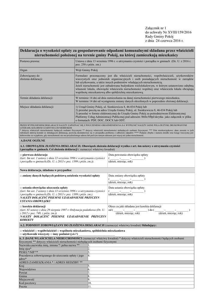 Załącznik nr 1 do uchwały Nr XVIII/159/2016 Rady Gminy Pokój z dnia 24 czerwca 2016 r. Deklaracja o wysokości opłaty za gospodarowanie odpadami komunalnymi składana przez właścicieli nieruchomości położonej na terenie gminy Pokój, na której zamieszkują mieszkańcy Postawa prawna: Ustawa z dnia 13 września 1996 r. o utrzymaniu czystości i porządku w gminach (Dz. U. z 2016 r. poz. 250 z późn. zm.) Organ Wójt Gminy Pokój Zobowiązany do złożenia deklaracji: Formularz przeznaczony jest dla właścicieli nieruchomości, współwłaścicieli, użytkowników wieczystych oraz jednostek organizacyjnych i osób posiadających nieruchomość w zarządzie lub użytkowaniu, a także innych podmiotów władających nieruchomością. Jeżeli nieruchomość jest zabudowana budynkiem wielolokalowym, w którym ustanowiono odrębną własność lokalu, obowiązki właściciela nieruchomości wspólnej oraz właściciela lokalu obciążają wspólnotę mieszkaniową albo spółdzielnię mieszkaniową. Termin składania deklaracji: W terminie 14 dni od dnia zamieszkania na danej nieruchomości pierwszego mieszkańca. W terminie 14 dni od wystąpienia zmiany danych określonych w poprzednio złożonej deklaracji. Miejsce składania deklaracji: 1) Urząd Gminy Pokój, ul. Sienkiewicza 8, 46-034 Pokój lub 2) przesłać pocztą na adres Urzędu Gminy Pokój, ul. Sienkiewicza 8, 46-034 Pokój lub 3) przesłać w formie elektronicznej do Urzędu Gminy Pokój za pośrednictwem Elektronicznej Platformy Usług Administracji Publicznej pod adresem /86frc5f0pl/skrytka jako załącznik w pliku o formatach: PDF, DOC, DOCX lub ODT. PRZED WYPEŁNIENIEM DEKLARACJI NALEŻY ZAPOZNAĆ SIĘ Z POUCZENIEM I OBJAŚNIENIEM NA S.4. WYPEŁNIĆ NALEŻY JASNE POLA DUŻYMI, DRUKOWANYMI LITERAMI, KOLOREM CZARNYM LUB NIEBIESKIM * dotyczy właścicieli nieruchomości będących osobami fizycznymi ** dotyczy właścicieli nieruchomości niebędących osobami fizycznymi *** Pole nieobowiązkowe: dane zawarte w tych rubrykach ułatwią kontakt ze składającym deklarację, pozwolą skontaktować się w przypadku problemu z odbiorem odpadów **** Podanie obrębu i numeru działki oraz księgi wieczystej jest dobrowolne za wyjątkiem, gdy nieruchomość nie ma przydzielonego adresu lub pod tym samym adresem jest więcej niż jedna nieruchomość. A.DANE OGÓLNE A.1. OBOWIĄZEK ZŁOŻENIA DEKLARACJI. Obowiązek złożenia deklaracji wynika z art. 6m ustawy o utrzymaniu czystości i porządku w gminach. Cel złożenia deklaracji ( zaznaczyć właściwy kwadrat) □ pierwsza deklaracja ((art. 6m ust. 1 ustawy z dnia 13 września 1996 r. o utrzymaniu czystości i porządku w gminach,(Dz. U. z 2013 r. poz. 1399 z późn, zm.)). Data powstania obowiązku opłaty ( ______ -______ - ________ ) (dzień, miesiąc, rok) Nowa deklaracja, składana w przypadku: □ zmiany danych będących podstawą ustalenia wysokości opłaty Data zmiany obowiązku opłaty ( ______ -______ - ________ ) (dzień, miesiąc, rok) □ ustania obowiązku uiszczania opłaty ((art. 6m ust. 2 ustawy z dnia 13 września 1996 r. o utrzymaniu czystości i porządku w gminach,(Dz. U. z 2013 r. poz. 1399 z późn. zm.). NALEŻY DOŁĄCZYĆ PISEMNE UZASADNIENIE PRZYCZYN USTANIA OBOWIĄZKU Data ustania obowiązku opłaty ( ______ -______ - ________ ) (dzień, miesiąc, rok) □ korekta deklaracji Okres za jaki składana jest korekta deklaracji ((art. 81 ustawy z dnia 29 sierpnia 1997 r. Ordynacja podatkowa (Dz. U. od ( ______ -______ - ________ ) do ( ______ -______ - ________ ) z 2012 r. poz. 749, z późn. zm.)) (dzień, miesiąc, rok) (dzień, miesiąc, rok) NALEŻY DOŁĄCZYĆ PISEMNE UZASADNIENIE PRZYCZYN KOREKTY A.2. PODMIOT ZOBOWIĄZANY DO ZŁOŻENIA DEKLARACJI (zaznaczyć właściwy kwadrat) Składający: □ właściciel □ współwłaściciel □ wspólnota mieszkaniowa, spółdzielnia mieszkaniowa □ użytkownik wieczysty □ inny podmiot (jaki?) _________________________ A. 3 .DANE WŁAŚCICIELA NIERUCHOMOŚCI (zaznaczyć właściwy kwadrat) * dotyczy właścicieli nieruchomości będących osobami fizycznymi ** dotyczy właścicieli nieruchomości niebędących osobami fizycznymi Nazwisko,nazwiska imię, imiona */ pełna nazwa ** 1. Imię ojca* 2. PESEL*/NIP ** 3. Pracodawca zobowiązanego do uiszczania opłaty i jego 4. adres* ADRES ZAMIESZKANIA * / ADRES SIEDZIBY ** Kraj 5. Województwo 6. Powiat 7. Gmina 8. Miejscowość 9. Kod pocztowy 10. Poczta 11. Ulica 12. Nr domu 13. Nr lokalu 14. Adres e-mail *** 15. Telefon stacjonarny (z numerem kierunkowym) *** 16. Telefon komórkowy *** 17. Osoby upoważnione do reprezentowania1): 18. podstawa umocowania Sposób reprezentacji: 2) 19. Osoby upoważnione do reprezentowania: 1) Należy wpisać imię i nazwisko, adres zamieszkania, nr telefonu oraz serię i nr dowodu osobistego osoby upoważnionej oraz podstawę umocowania tj. pełnomocnictwo, umowa spółki, KRS itp. Do deklaracji należy dołączyć dokument potwierdzający pełnomocnictwo. W przypadku pełnomocnictwa ogólnego lub szczególnego pełnomocnictwo powinno być udzielone na piśmie i złożone z niniejszą deklaracją w oryginale lub w formie uwierzytelnionego odpisu wraz z załączonym dowodem opłaty z uiszczoną opłatą skarbową (17,00 zł) zgodniez ustawą z dnia 16 listopada 2006 r. o opłacie skarbowej ( Dz. U. z 2014 r. poz. 1628, z późn. zm.) Na podstawie § 3 ust. 1 Rozporządzenia Ministra Finansów z dnia 28 września 2007 r. w sprawie zapłaty opłaty skarbowej (Dz. U. z 2007 r. Nr 187, poz. 1330) składający wniosek lub pełnomocnictwo albo dokonujący zgłoszenia zobowiązany jest dołączyć dowód zapłaty należnej opłaty skarbowej, zwany dalej „dowodem zapłaty”, albo uwierzytelnioną kopię dowodu zapłaty, nie później niż w ciągu 3 dni od chwili powstania obowiązku jej zapłaty. Dowód zapłaty może mieć formę wydruku potwierdzającego dokonanie operacji bankowej. 2) Należy wpisać czy pełnomocnicy mo