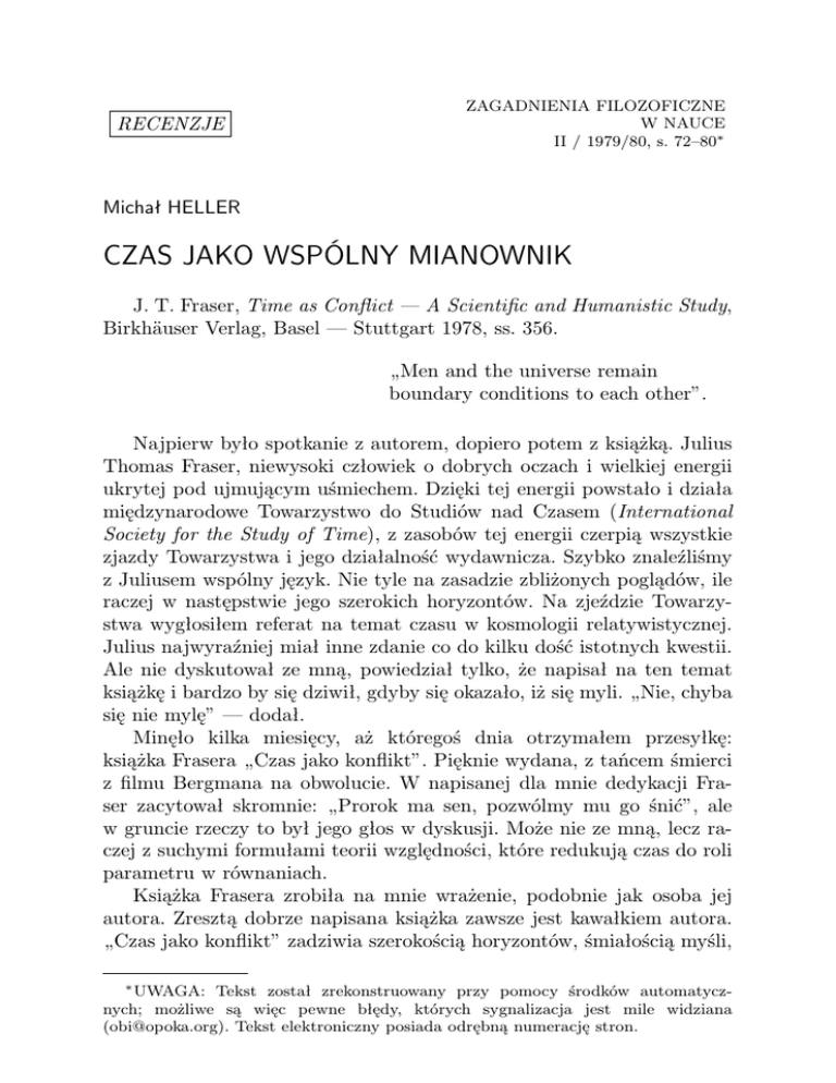 RECENZJE ZAGADNIENIA FILOZOFICZNE W NAUCE II / 1979/80, s. 72–80∗ Michał HELLER CZAS JAKO WSPÓLNY MIANOWNIK J. T. Fraser, Time as Conflict — A Scientific and Humanistic Study, Birkhäuser Verlag, Basel — Stuttgart 1978, ss. 356. „Men and the universe remain boundary conditions to each other”. Najpierw było spotkanie z autorem, dopiero potem z książką. Julius Thomas Fraser, niewysoki człowiek o dobrych oczach i wielkiej energii ukrytej pod ujmującym uśmiechem. Dzięki tej energii powstało i działa międzynarodowe Towarzystwo do Studiów nad Czasem (International Society for the Study of Time), z zasobów tej energii czerpią wszystkie zjazdy Towarzystwa i jego działalność wydawnicza. Szybko znaleźliśmy z Juliusem wspólny język. Nie tyle na zasadzie zbliżonych poglądów, ile raczej w następstwie jego szerokich horyzontów. Na zjeździe Towarzystwa wygłosiłem referat na temat czasu w kosmologii relatywistycznej. Julius najwyraźniej miał inne zdanie co do kilku dość istotnych kwestii. Ale nie dyskutował ze mną, powiedział tylko, że napisał na ten temat książkę i bardzo by się dziwił, gdyby się okazało, iż się myli. „Nie, chyba się nie mylę” — dodał. Minęło kilka miesięcy, aż któregoś dnia otrzymałem przesyłkę: książka Frasera „Czas jako konflikt”. Pięknie wydana, z tańcem śmierci z filmu Bergmana na obwolucie. W napisanej dla mnie dedykacji Fraser zacytował skromnie: „Prorok ma sen, pozwólmy mu go śnić”, ale w gruncie rzeczy to był jego głos w dyskusji. Może nie ze mną, lecz raczej z suchymi formułami teorii względności, które redukują czas do roli parametru w równaniach. Książka Frasera zrobiła na mnie wrażenie, podobnie jak osoba jej autora. Zresztą dobrze napisana książka zawsze jest kawałkiem autora. „Czas jako konflikt” zadziwia szerokością horyzontów, śmiałością myśli, ∗ UWAGA: Tekst został zrekonstruowany przy pomocy środków automatycznych; możliwe są więc pewne błędy, których sygnalizacja jest mile widziana ([email protected]). Tekst elektroniczny posiada odrębną numerację stron. 2 Michał HELLER niezwykłą erudycją, umiejętnością wyciągania daleko idących wniosków z niepozornych, wydawać by się mogło, obserwacji. Dla Frasera pojęcie czasu nie sprowadza się do następstwa zdarzeń czy „ukierunkowanej linii”, jest ono tak bogate, że osnuta wokół niego koncepcja nosi na sobie wyraźne piętno wielkiej filozoficznej syntezy: od zagadnień filozofii przyrody, kosmologii i biologii, poprzez problemy psychologii, teorii poznania, historii i socjologii, aż do dziedziny etyki i estetyki. Wizja świata zaproponowana przez Frasera dzieli z wszystkimi wielkimi syntezami ich korzyści i niedostatki. Korzyści są ewidentne: przede wszystkim zaspakajanie ludzkiej tęsknoty do wszechogarniania. Niedostatki też dobrze znane: tam gdzie brak danych, w miejscach, w których nauka pozostawia jeszcze białe plamy na mapie ludzkiego poznania — a zwykle są to miejsca o kluczowym znaczeniu dla całej syntezy — tam wyobraźnia, pracująca „w ramach systemu”, uzupełnia luki i rwące się ciągi rozumowań. Rodzi się podejrzenie: Czy, wobec ciągle bardzo cząstkowych odpowiedzi udzielanych przez nauki szczegółowe, nie za wcześnie dziś na Wielką Syntezę? I natychmiastowe pytanie–riposta: Czy zawsze nie będzie za wcześnie na Wielką Syntezę? Wielka Synteza w swej istocie jest wybieganiem naprzód. Ponieważ w niniejszym numerze został zamieszczony artykuł samego Frasera, syntetycznie przedstawiający jego wizję świata, mogę założyć, że Czytelnik zna ją przynajmniej w ogólnych zarysach. Dlatego też w dalszym ciągu ograniczę się jedynie do zwrócenia uwagi na metodologiczne tło koncepcji Frasera oraz wypunktuję najistotniejsze miejsca, co do których chciałbym kontynuować dyskusję z autorem. Książka zaczyna się od następującej deklaracji: „Teoria czasu jako konfliktu jest zbiorem zasad dotyczących naukowego i humanistycznego studium czasu. Obejmuje ona abstrakcyjny czas fizyki matematycznej, czas ujawniający się w życiu i w organicznej ewolucji, czas odgrywający rolę w zachowaniu człowieka, w zbiorowych działaniach, w świadomym doświadczeniu, i czas kształtujący twórczość literacką i artystyczną” (s. 13). Jaka metoda pracy doprowadziła do teorii o tak szerokim zakresie? Autor odpowiada zwięźle: „Ogólne zasady wydają się wyłaniać z tych obszarów naukowej i humanistycznej wiedzy, w których wizja musi dopełniać widzenie” (s. 14). Mamy więc do czynienia nie z teorią lecz z „wizją”. I dlatego wolę określenie zamieszczone na ostatnich stronicach książki, na których autor wyznaje, iż jego koncepcja „ jest próbą mierzenia granic człowieka wobec porządku rzeczy przy pomocy metod zaspokajających spekulatywną ciekawość” (s. 311). CZAS JAKO WSPÓLNY MIANOWNIK 3 Fraser z naciskiem podkreśla, że jego próba syntezy opiera się na wynikach nauki rozumianej w sposób post–einsteinowski, post–darwinowski i postfreudowski. Jest jednak rzeczą niemal a priori oczywistą, że autor dane współczesnej nauki podda dla swoich celów „ontologicznej obróbce”. Tak jest w istocie; zwłaszcza wyraźnie widać to w partiach książki dotyczących fizyki. Tego rodzaju ontologizowanie samo w sobie nie jest rzeczą złą, czasem jest rzeczą wręcz nieuniknioną, nie powinno ono jednak przesłaniać faktu, że w wielu wypadkach możliwe są różne interpretacje ontologiczne i że w zasadzie żadna z nich nie jest preferowana przez samą naukę. Po tych ogólnych uwagach przejdę do wypunktowania miejsc, co do których najbardziej żywo nie zgadzam się z autorem. 1. O ile dobrze zrozumiałem linię rozumowań Frasera (czynię to zastrzeżenie, gdyż myśl, o którą posądzam autora, jest dla mnie tak obca, iż trudno mi ją nawet komuś przypisywać), twierdzi on, że mat