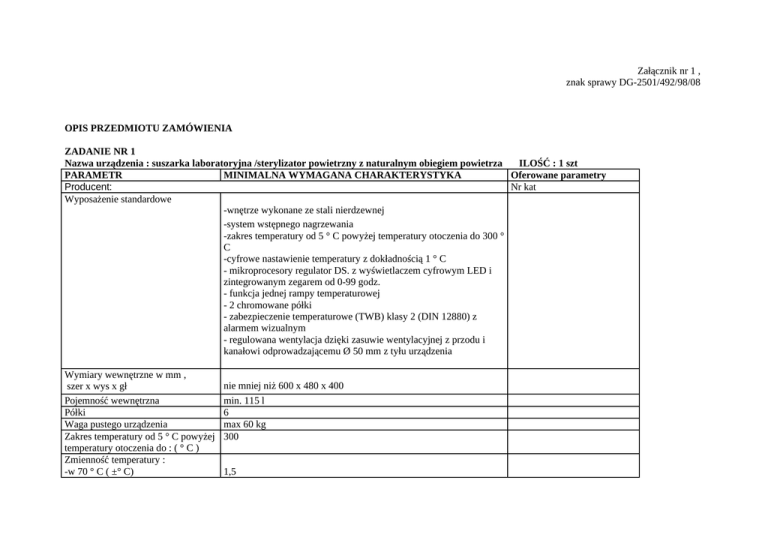 Załącznik nr 1 , znak sprawy DG-2501/492/98/08 OPIS PRZEDMIOTU ZAMÓWIENIA ZADANIE NR 1 Nazwa urządzenia : suszarka laboratoryjna /sterylizator powietrzny z naturalnym obiegiem powietrza ILOŚĆ : 1 szt PARAMETR MINIMALNA WYMAGANA CHARAKTERYSTYKA Oferowane parametry Producent: Nr kat Wyposażenie standardowe -wnętrze wykonane ze stali nierdzewnej -system wstępnego nagrzewania -zakres temperatury od 5 ° C powyżej temperatury otoczenia do 300 ° C -cyfrowe nastawienie temperatury z dokładnością 1 ° C - mikroprocesory regulator DS. z wyświetlaczem cyfrowym LED i zintegrowanym zegarem od 0-99 godz. - funkcja jednej rampy temperaturowej - 2 chromowane półki - zabezpieczenie temperaturowe (TWB) klasy 2 (DIN 12880) z alarmem wizualnym - regulowana wentylacja dzięki zasuwie wentylacyjnej z przodu i kanałowi odprowadzającemu Ø 50 mm z tyłu urządzenia Wymiary wewnętrzne w mm , szer x wys x gł Pojemność wewnętrzna Półki Waga pustego urządzenia Zakres temperatury od 5 ° C powyżej temperatury otoczenia do : ( ° C ) Zmienność temperatury : -w 70 ° C ( ±° C) nie mniej niż 600 x 480 x 400 min. 115 l 6 max 60 kg 300 1,5 - w 150 ° C ( ±° C) - w 300° C ( ±° C) 2,5 4,5 Czasowe odchylenie temperatury ( ≤±° ) Czas nagrzewania - do 70 ° C( min) - do 150 ° C( min) -do 250 ° C( min) Czas powrotu do nastawionej temperatury po otwarciu drzwi na 30 s - w 70 ° C( min) - w 150 ° C( min) - w 300 ° C( min) Wymiana powietrza -przy 70 ° C( x/h) -przy 150° C( x/h) - przy 300 ° C( x/h) Zasilanie Drzwi (ilość) Wyposażenie dodatkowe 0,3 15 29 66 2 9 14 Instrukcja obsługi Szkolenie 12 10 10 230 V 1 -blokada drzwi , uszczelnienie drzwi z Nitonu (odporność termiczna do 220 ° C ) - antypoślizgowe podkładki gumowe podnóżki ( 4 szt ) - drzwi z okienkiem inspekcyjnym i oświetleniem wewnętrznym ( 15 i 30 W ) - gniazda pomiarowe z silikonową zatyczką - certyfikat kalibracji producenta w języku polskim na miejscu po instalacji i uruchomieniu urządzenia w wymiarze czasu Gwarancja niezbędnym do opanowania obsługi co najmniej 1 rok gwarancji od daty uruchomienia czas reakcji serwisu – 48 godz. od momentu zgłoszenia awarii w okresie gwarancyjnym Wymagane świadczenie serwisu równiez po upływie okresu Inne wymagania gwarancji Dostawa urządzenia fabrycznie nowego wyprodukowanego w roku 2007/2008 ZADANIE nr 2 Nazwa urządzenia: Cieplarka laboratoryjna z chłodzeniem ILOŚĆ: 1 szt. PARAMETR MINIMALNA WYMAGANA CHARAKTERYSTYKA Producent: Nr kat Pojemność Zakres temperatury Przybliżone wymiary wewnętrzne (szer. x wys. x głęb.) Programowanie dowolnych wieloetapowych profili termicznych Nastawianie żądanej temperatury Dokładność nastaw Panel sterujący z wyświetlaczem temperatury wewnątrz komory Dodatkowe wewnętrzne szklane drzwi Komora wykonana ze stali nierdzewnej Obieg powietrza Odczyt profili temperatury z indywidualnych kart pamięci Minimalna wymagana gwarancja Około 110 litrów Od +5 do + 60ºC 700 x 5500 x 400 Tak Tak ± 0,1ºC Tak Tak Tak Wymuszony Tak 24 m-ce czas reakcji serwisu – 48 godz. od momentu zgłoszenia awarii w okresie gwarancyjnym Wymagane świadczenie serwisu równiez po upływie okresu gwarancji Dokumentacja techniczna Instrukcja obsługi w j. polskim Montaż oraz przeszkolenie z zakresu obsługi i konserwacji cieplarki Tak ZADANIE nr 3 Nazwa urządzenia: komora laminarna do PCR ILOŚĆ: 1 szt. PARAMETR MINIMALNA WYMAGANA CHARAKTERYSTYKA Producent: Wymiary Wys. 555 mm , szer. 690 mm , głęb. 515 mm ( ±0 mm ) Wymagania techniczne Lampa biała Konstrukcja metalowa , ściany z plexi typ ALTUGLAS EXŻ o grubości bocznej 4 mm ( ±0 mm ) , ściany przedniej 8 mm ( ±0 mm) o przeźroczystości 99.99 % i ochronie przed UV 99,99 % , platforma robocza ze stali nierdzewnej odpornej na działanie środków chemicznych O mocy 15 W bezogonowa i 15 W zwykła , czas pracy lampy do 8000 godz. , dezynfekcja całej powierzchni robczej komory w przeciągu 15-30 min Oświetlenie całego obszaru roboczego Timer Cyfrowy 0-24 godz. Dodatkowe wymagania Waga Lampa UV przepływowa , o przepływie powietrza 25 m 3 /godz. , wentylator i filtry przeciwpyłowe zamontowane w obudowie , która umożliwia pracę i podczas działania lampy , wyposażona w przewód zasilający 27 kg ( ± 0,5 kg ) Instrukcja obsługi w języku polskim Szkolenie na miejscu po instalacji i uruchomieniu urządzenia w wymiarze czasu Gwarancja niezbędnym do opanowania obsługi co najmniej 1 rok gwarancji od daty uruchomienia Lampa UV czas reakcji serwisu – 48 godz. od momentu zgłoszenia awarii w okresie gwarancyjnym Oferowane parametry Nr kat Wymagane świadczenie serwisu równiez po upływie okresu Inne wymagania gwarancji Dostawa urządzenia fabrycznie nowego wyprodukowanego w roku 2007/2008 Zadanie nr 4 Nazwa urządzenia : lepkościomierz Brookfield’a Parametr Producent: ogólna charakterystyka Sposób pomiaru MINIMALNA WYMAGANA CHARAKTERYSTYKA Nr kat − Lepkościomierz Brookfield z możliwością zastosowania przystawki do małych próbek i małych lepkości ( od 1,5 mPas) − możliwość wykonywania bez nadzoru oprogramowania komputerowego procedur pomiarowych w trakcie których przyrząd sam jest w stanie oczekiwać na odpowiedni stan termostatowania próbki i dopiero wtedy przeprowadzić samodzielnie kilkupunktowy pomiar − aparat bez potrzeby podłączania do komputera ma możliwość wykonania pomiaru lepkości po zadanym czasie lub czasu do osiągnięcia zadanej wartości lepkości − niezależny pomiar temperatury sondą − Odczyt ILOŚĆ: 1 szt. − − Zakres pomiarów − Wyposażenie − precyzyjny pomiar temperatury próbki przez sondę w cylindrycznym naczyniu pomiarowym ciągły odczyt lepkości i temperatury próbki. możliwość odczytu wyników na wyświetlaczu ciekłokrystaklicznym 15-1000000mPa.s, przy zastosowaniu naczynia do małych objętości i dedykowanego zestawu wrzecion min. 1,5-30000 mPa.s zestaw wrzecion do pomiarów względnych w dużych
