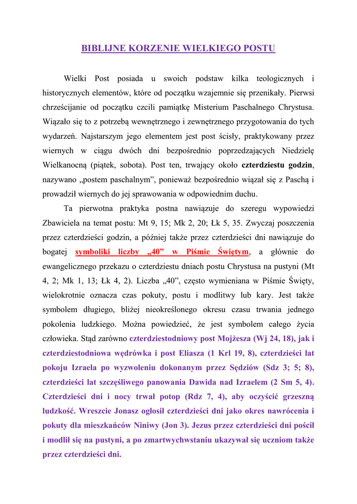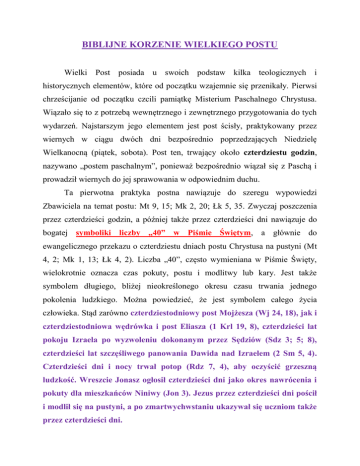 BIBLIJNE KORZENIE WIELKIEGO POSTU Wielki Post posiada u swoich podstaw kilka teologicznych i historycznych elementów, które od początku wzajemnie się przenikały. Pierwsi chrześcijanie od początku czcili pamiątkę Misterium Paschalnego Chrystusa. Wiązało się to z potrzebą wewnętrznego i zewnętrznego przygotowania do tych wydarzeń. Najstarszym jego elementem jest post ścisły, praktykowany przez wiernych w ciągu dwóch dni bezpośrednio poprzedzających Niedzielę Wielkanocną (piątek, sobota). Post ten, trwający około czterdziestu godzin, nazywano „postem paschalnym”, ponieważ bezpośrednio wiązał się z Paschą i prowadził wiernych do jej sprawowania w odpowiednim duchu. Ta pierwotna praktyka postna nawiązuje do szeregu wypowiedzi Zbawiciela na temat postu: Mt 9, 15; Mk 2, 20; Łk 5, 35. Zwyczaj poszczenia przez czterdzieści godzin, a później także przez czterdzieści dni nawiązuje do bogatej symboliki liczby „40” w Piśmie Świętym, a głównie do ewangelicznego przekazu o czterdziestu dniach postu Chrystusa na pustyni (Mt 4, 2; Mk 1, 13; Łk 4, 2). Liczba „40”, często wymieniana w Piśmie Święty, wielokrotnie oznacza czas pokuty, postu i modlitwy lub kary. Jest także symbolem długiego, bliżej nieokreślonego okresu czasu trwania jednego pokolenia ludzkiego. Można powiedzieć, że jest symbolem całego życia człowieka. Stąd zarówno czterdziestodniowy post Mojżesza (Wj 24, 18), jak i czterdziestodniowa wędrówka i post Eliasza (1 Krl 19, 8), czterdzieści lat pokoju Izraela po wyzwoleniu dokonanym przez Sędziów (Sdz 3; 5; 8), czterdzieści lat szczęśliwego panowania Dawida nad Izraelem (2 Sm 5, 4). Czterdzieści dni i nocy trwał potop (Rdz 7, 4), aby oczyścić grzeszną ludzkość. Wreszcie Jonasz ogłosił czterdzieści dni jako okres nawrócenia i pokuty dla mieszkańców Niniwy (Jon 3). Jezus przez czterdzieści dni pościł i modlił się na pustyni, a po zmartwychwstaniu ukazywał się uczniom także przez czterdzieści dni. Wolno wnioskować z powyższego, że chrześcijańska tematyka Wielkiego Postu bogaci się biblijną ideą „pustyni”, która powraca czy to w poście Mojżesza i Eliasza, czy w wędrówce Izraela do ziemi obiecanej, czy wreszcie w kuszeniu Jezusa. Pustynia oznacza próbę, ale także miejsce spotkania z Bogiem, miejsce Przymierza. Post kościelny jest więc w tym świetle również czasem próby, walki, modlitwy, ale jest także czasem spotkania z Bogiem, czasem uczestnictwa w walce Chrystusa. Wreszcie Jezus także zamyka tą symboliczną cyfrą „40” swoje przebywanie na ziemi, gdy po Zmartwychwstaniu „ukazywał się im przez czterdzieści dni i mówił o Królestwie Bożym” (Dz 1, 3). W połowie IV wieku Rzym za przykładem Kościoła Wschodniego, o czym świadczy list pasterski Atanazego z Aleksandrii, napisany z okazji Wielkanocy w 334 roku, wydłużył czas postu na okres czterdziestu dni. Wyraźnie o istnieniu tej praktyki pisał św. Hieronim w liście z 384 roku do swojej siostry Marceli. Poświadcza on także, że post obejmował całą społeczność chrześcijańską. Owe czterdzieści dni liczono począwszy od Wielkiego Czwartku wstecz, ponieważ piątek i sobotę przed Nocą Paschalną zaliczano już do obchodów samej uroczystości Paschy. Następnie odliczono z postu także niedziele. Były to dni, w które poszczenie nie obowiązywało. Po uzupełnieniu efektywnych dni postnych przesunięto początek Wielkiego Postu z niedzieli na Środę Popielcową. Jednak wciąż na pierwszy plan wysuwała się liczba „40”, jako charakterystyczna dla tego okresu bez względu na sposób liczenia czterdziestu dni. Podobny rozwój zauważamy na Wschodzie. Tam również dążono do postu trwającego czterdzieści dni. W związku z tym, że w soboty i niedziele nie poszczono, post obejmował aż osiem tygodni. W wyniku wcześniejszego rozpoczęcia postu w Kościele Wschodnim, także na Zachodzie wydłużono okres przygotowawczy o trzy niedziele tzw. przedpościa. Jednak post w tych tygodniach nie obowiązywał. Natomiast liturgia zachowała charakter pokutny poprzez brak hymnu Gloria, Te Deum i Alleluja. W Kościele starożytnym kształtował się i rozwijał okres przygotowania paschalnego. Z początkowego czterdziestogodzinnego postu paschalnego powoli powstawał czas czterdziestodniowego już Wielkiego Postu. Było to spowodowane nieustannym pogłębianiem wiadomości teologicznych. W wyniku studiowania Pisma Świętego dokonał się stopniowy proces czasowego rozwoju. Także czynniki takie jak przygotowanie kandydatów do sakramentu chrztu świętego, publiczna pokuta grzeszników, czy też liturgia stacyjna kształtowały późniejszy rozwój Wielkiego Postu. Dlatego też już w IV wieku są obecne w tym czasie wszystkie podstawowe treści tego okresu uwzględniające post, przygotowanie chrzcielne, pokutę jako drogę pojednania z Kościołem. Miało to prowadzić do należytego przygotowania się do Święta Paschy. ks. Dominik Krawczak