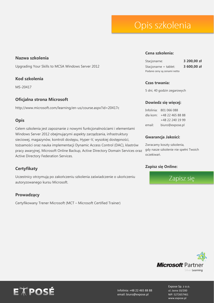 Cena szkolenia: Nazwa szkolenia Upgrading Your Skills to MCSA Windows Server 2012 Stacjonarne: 3 200,00 zł Stacjonarne + tablet: 3 600,00 zł Podane ceny są cenami netto Kod szkolenia Czas trwania: MS-20417 5 dni, 40 godzin zegarowych Oficjalna strona Microsoft Dowiedz się więcej: http://www.microsoft.com/learning/en-us/course.aspx?id=20417c Infolinia: 801 066 088 dla kom: +48 22 465 88 88 Opis +48 22 240 19 99 Celem szkolenia jest zapoznanie z nowymi funkcjonalnościami i elementami Windows Server 2012 obejmującymi aspekty zarządzania, infrastruktury sieciowej, magazynów, kontroli dostępu, Hyper-V, wysokiej dostępności, tożsamości oraz nauka implementacji Dynamic Access Control (DAC), klastrów email: [email protected] Gwarancja Jakości: Zwracamy koszty szkolenia, pracy awaryjnej, Microsoft Online Backup, Active Directory Domain Services oraz gdy nasze szkolenie nie spełni Twoich oczekiwań. Active Directory Federation Services. Zapisz się Online: Certyfikaty Uczestnicy otrzymują po zakończeniu szkolenia zaświadczenie o ukończeniu autoryzowanego kursu Microsoft. Prowadzący Certyfikowany Trener Microsoft (MCT – Microsoft Certified Trainer) Expose Sp. z o.o. Infolinia: +48 22 465 88 88 email: [email protected] ul. Jasna 10/200 NIP: 5272657461 www.expose.pl 1. Instalacja i konfiguracja serwerów opartych na systemie Windows Server 2012 instalacja Windows Server 2012 konfiguracja Windows Server 2012 konfiguracja zdalnego zarządzania dla serwerów Windows 2012. 2. Monitorowanie i utrzymanie Windows Server2012 monitorowanie Windows Server 2012 wdrożenie Windows Server Backup realizacja odzyskiwania serwerów i danych. 3. Zarządzanie Windows Server 2012 za pomocą Windows PowerShell 3.0 przegląd Windows PowerShell 3.0 korzystanie z Windows PowerShell 3.0 do zarządzania AD DS zarządzanie serwerami za pomocą Windows PowerShell 3.0. 4. Zarządzanie magazynem w systemie Windows Server 2012 nowe funkcje konfiguracja iSCSI konfiguracja przestrzeni magazynu w Windows Server 2012 konfiguracja BranchCache w Windows Server 2012. 5. Implementacja usług sieciowych implementacja rozszerzeń DHCP i DNS implementacja IP Address Management(IPAM) wprowadzenie do Network Access Protection implementacja Network Access Protection. 6. Implementacja DirectAccess wprowadzenie do DirectAccess konfiguracja komponentów DirectAccess. 7. Implementacja klastrów pracy bezawaryjnej wprowadzenie do klastrów pracy bezawaryjnej implementacja klastrów pracy bezawaryjnej konfiguracja aplikacji i usług wysoko dostępnych w ramach klastrów pracy bezawaryjnej utrzymanie klastrów pracy bezawaryjnej implementacja wielolokacyjnych klastrów pracy bezawaryjnej. 8. Wdrożenie Hyper-V konfiguracja serwerów Hyper-V konfiguracja magazynów Hyper-V konfiguracja sieci Hyper-V konfiguracja maszyn wirtualnych Hyper-V. 9. Wdrożenie klastrów pracy bezawaryjnej w Hyper-V wprowadzenie do zagadnień integracji Hyper-V z klastrami pracy bezawaryjnej implementacja maszyn wirtualnych Hyper-V w ramach klastrów pracy bezawaryjnej implementacja przenoszenia maszyn wirtualnych zarządzanie środowiskiem wirtualnym Hyper-V za pomocą System Center Virtual Machine Manager. 10. Implementacja Dynamic Access Control wprowadzenie do DAC Expose Sp. z o.o. Infolinia: +48 22 465 88 88 email: [email protected] ul. Jasna 10/200 NIP: 5272657461 www.expose.pl planowanie implementacji DAC konfiguracja DAC. 11. Implementacja Active Directory Domain Service wdrażanie kontrolerów domeny AD DS konfiguracja kontrolerów domeny AD DS implementacja kont usługowych implementacja zasad grupowych w AD DS utrzymanie AD DS. 12. Implementacja AD FS wprowadzenie do Active Directory Federation Services wdrażanie AD FS implementacja AD FS w organizacji wdrażanie AD FS w scenariuszach Business to Business. Expose Sp. z o.o. Infolinia: +48 22 465 88 88 email: [email protected] ul. Jasna 10/200 NIP: 5272657461 www.expose.pl