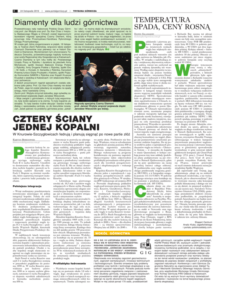 4 listopada 2016 | www.portalgorniczy.pl | trybuna górniCza Diamenty dla ludzi górnictwa Przewodniczący rady nadzorczej Polskiej Grupy Górniczej prof. Jan Wojtyła oraz prof. Qu Xian Chao z instytutu Badawczego Węgla w Chinach zostali tegorocznymi laureatami nagrody specjalnej Czarny Diament, którą przyznaje izba Przemysłowo-Handlowa rybnickiego okręgu Przemysłowego. W czasie gali, którą zorganizowano w piątek, 18 listopada, w teatrze Ziemi rybnickiej, wręczono także siedem Czarnych Diamentów oraz pierwszy raz w historii Diament w Diamencie. Wyróżnieniem tym uhonorowano tadeusza Donocika, przewodniczącego kapituły konkursu oraz szefa regionalnej izby Gospodarczej w Katowicach. Czarne Diamenty w tym roku trafiły do: Powiatowego Urzędu Pracy w rybniku i dyrektora tej placówki Anny michalczyk, spółki Doosan Babcock Energy Polska z rybnika, firmy Drogerie Polskie z rybnika, spółki Eko – m. Golik, J. Konsek, A. Serwotka z rybnika, Kancelarii Prawnej iurisco Edyta Przybyłek z Katowic, spółki Pojazdy Komunalne GAmoN z rybnika oraz Kopalń Kruszyw Kruszbet z siedzibą w Katowicach i ich właściciela mariusza Lachowicza. Z dwóch przyznanych nagród specjalnych została odebrana tylko jedna. Prof. Qu Xian Chao niestety nie dotarł do Polski. Jego lot został odwołany ze względu na opady śniegu, które nawiedziły Chiny. Zanim prof. Wojtyła otrzymał statuetkę, jego sylwetkę zaprezentował wojewoda śląski Jarosław Wieczorek. – moje związki z górnictwem, o których tutaj wspominano, były ściśle wpisane w tę ziemię. to były kopalnie Jastrzębia. to były bardzo trudne decyzje i bardzo trudny dialog z warszawską centralą, co do kierunków rozwiązań. Jeżeli patrzeć na problemy górnictwa przez „szkieł- ko i oko”, to można dojść do dramatycznych wniosków, że należy część zlikwidować, ale jeżeli spojrzeć na to przez pryzmat ludzkich losów, tradycji i tego, co będzie się działo w Polsce – bo nie ulega wątpliwości, że przez długi czas węgiel będzie podstawowym surowcem – to nie można rezygnować, to trzeba restrukturyzować, rewitalizować, budować nowe technologie, czyli to, co nazywa się innowacyjną gospodarką – mówił tuż po odebraniu nagrody prof. Jan Wojtyła. Md fot.: mACiEJ DoroSińSKi Nagrodę specjalną Czarny Diament prof. Janowi Wojtyle wręczył wojewoda śląski Jarosław Wieczorek (po lewej). Cztery śCiany jednej kopalni W Knurowie-Szczygłowicach fedrują i planują sięgnąć po nowe partie złóż Kajetan BerezowSKi [email protected] racowicie kończy br. załoga kopalni Knurów-szczygłowice. Kontynuowana jest przebudowa i modernizacja górniczego wyciągu szybowego szybu Foch II w ruchu Knurów. umożliwi to dostarczanie materiałów dla obydwu ruchów kopalni i pozwoli na likwidację szybów Krywałd oraz Foch I. drążone są również wyrobiska, które usprawnią transport materiałów i przewóz ludzi pomiędzy ruchami. p pełniejsza integracja – Wciąż realizujemy przedsięwzięcia inwestycyjne zmierzające do pełnej integracji kopalni. należy do nich również modernizacja zakładów przeróbki mechanicznej węgla. Zakładamy bowiem zwiększenie wydobycia. Te działania podejmowane są przy współudziale Funduszu restrukturyzacji przedsiębiorców. celem projektu jest osiągnięcie 80 proc. produkcji węgla koksującego w obydwu zakładach przeróbczych kopalni i rozpoczęcie produkcji węgla typu 35.1 w ruchu szczygłowice – podkreśla Wojciech Hajduk, kierownik działu przygotowania produkcji i Inwestycji. W najbliższych latach inwestycje skoncentrują się na udostępnieniu złóż, poprawie efektywności funkcjonowania kopalni i optymalnym przystosowaniu infrastruktury technicznej do potrzeb produkcji. chodzi o to, aby kopalnia mogła elastycznie reagować na ciągle zmieniające się zapotrzebowanie rynku na surowiec. szyb paweł w ruchu Knurów oraz szyb I w ruchu szczygłowice zostaną w przyszłości pogłębione do poziomu 1050 m. W ruchu Knurów przewidziana jest budowa poziomu 1050 m w rejonie szybów głównych, natomiast w ruchu szczygłowice drążenie wyrobisk szkieletowych w kierunku zachodnim poziomu 850 m. Inwestycje te pozwolą na udostępnienie w ruchu Knurów partii południowo-wschodniej pokładów węgla grupy rudzkiej, zalegających pomiędzy poziomami 850 m a 1050 m, zaś w ruchu szczygłowice – partii północno-zachodniej złoża. Kontynuowane będą też roboty związane z przebudową i modernizacją górniczego wyciągu szybowego szybu Foch II. ma on służyć dostarczaniu materiału dla obydwu ruchów kopalni. Zakończenie robót w tym szybie umożliwi rozpoczęcie likwidacji szybów Krywałd i Foch I w ruchu Knurów. – Likwidacja tego pierwszego uwolni ok. 10,3 mln t zasobów węgla zalegających w filarze szybu. ponadto znacznemu uproszczeniu ulegnie sieć wentylacyjna kopalni, nie wspominając już o obniżeniu kosztów związanych z utrzymaniem szybów. Kopalnia sukcesywnie prowadzi likwidację zbędnej infrastruktury zarówno na powierzchni, jak i na dole, wykorzystując do tego celu m.in. środki z funduszu likwidacji zakładów górniczych – wyjaśnia dalej Wojciech Hajduk. aktualnie kopalnia Knurów-szczygłowice zatrudnia 4469 osób, z czego 3389 pracuje na dole. To jednak nie wystarcza. Załogę własną wzmacniają firmy zewnętrzne. Każdego dnia na dół zjeżdża prawie 750 pracowników obcych. eksploatacja prowadzona jest czterema ścianami. Wydobycie kształtuje się na poziomie ok. 15 tys. t węgla na dobę. Zadania drążeniowe realizowane są ośmioma przodkami „własnymi” i pięcioma prowadzonymi przez firmy zewnętrzne. W br. wykonanych zostanie ok. 16 tys. m wyrobisk niezbędnych do utrzymania założonego poziomu produkcji węgla. profilaktyka fedrowania – Wydobycie roczne kopalni kształtuje się na poziomie około 3,8 mln t węgla. Jego zwiększenie do poziomu 4,1 mln t w latach następnych wymaga zintensyfik