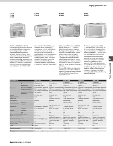 Pulpity Operatorskie HMI E1041 E1043 E1060 E1062 E1061 E1063 Modele E1012, E1022 i E1032 posiadają programowalne klawisze funkcyjne i oddzielną klawiaturę. Terminale pracujące wtrybie graficznym, mogą wyświetlać symbole, alarmy, wykresy i tekst w dowolnym rozmiarze. Receptury, teksty lub zmiany w sekwencji programu mogą być wprowadzane za pomocą przycisków. Dodatkowo model E1032 posiada wbudowany Ethernet-interfejs oraz możliwość komunikacji po sieci Profibus DP. Terminale E1041 i E1043 są wyposażone w ekran dotykowy TFT o przekątnej 3,5 cala (65536 kolorów lub 16 odcieni szarości). Receptury, tekst oraz zmiany są wprowadzane za pomocą klawiszy. Wielopoziomowe hasła zabezpieczają system przed nieautoryzowanym dostępem, natomiast szesnaście oddzielnych grup alarmów informuje użytkownika o wszystkich ważnych zdarzeniach. Wyświetlacz TFT terminala E1060 posida przekątną 5,7" i oferuje 65536 kolorów oraz 16 klawiszy funkcyjnych do operacji na ekranie. Wprowadzanie zmian czy danych wejściowych,może być wykonywane przy pomocy klawiszy. Zintegrowana ochrona hasłem zapobiega przed nieautoryzowanym dostępem, a 16 grup alarmów informuje na bieżąco i uaktualnia dane na temat wszystkich ważnych zdarzeń. Terminale operatorskie E1061 i E1063 mają takie same cechy, jak E1041 i E1043, ale oferują większy wyświetlacz dotykowy TFT z ekranem o przekątnej 5,7" (65536 kolorów lub 16-poziomów szarości). Terminal E1062 jest funkcjonalnie identyczny z modelem E1060, ale zamiast wyświetlacza kolorowego oferuje 16 odcieni szarości na wyświetlaczu TFT. Dane techniczne typ Wyświetlacz wymiary (mm) tekst (wierszy x znaków) wysokość znaków (mm) rozdzielczość wyświetlacza (w pikselach) Zasilanie Pojemność pamięci Pamięć flash Typ klawiatury Klawisze funkcyjne wewnętrzne zewnętrzne Wskaźniki LED szeregowe równoległe inne Gniazdo interfejsu dla dodatkowych kart Zegar czasu rzeczywistego Interfejsy Możliwość komunikacji w sieci Stopień ochrony IP (dla przedniego panelu) Akcesoria Wielopoziomowe hasła zabezpieczają system przed nieautoryzowanym dostępem, natomiast szesnaście oddzielnych grup alarmów informuje użytkownika o wszystkich ważnych zdarzeniach. Urządzenie jest wyposażone w dwa porty RS, port USB do podłączania myszy, klawiatury, drukarki i pamięci USB, a także wbudowany interfejs Ethernet. E1012/E1022 E1032 E1041/E1043 TFT kolorowy/ LCD jednobarwny LCD jednobarwny TFT odcienie szarości 89,6x17,9/90,2x24,0 135x36 75x54 (3,5") Definiowane przez użytkownika Definiowane przez użytkownika Definiowane przez użytkownika Definiowane przez użytkowDefiniowane przez użytkowDefiniowane przez użytkownika, czcionki systemu Windows nika, czcionki systemu Windows nika, czcionki systemu Windows E1060/E1062 TFT kolorowy/ TFT odcienie szarości 120x91 (5,7") Definiowane przez użytkownika Definiowane przez użytkownika, czcionki systemu Windows E1061/E1063 TFT kolorowy/ TFT odcienie szarości 145x110 (5,7") Definiowane przez użytkownika Definiowane przez użytkownika, czcionki systemu Windows 160x32/240x64 240x64 320x240 320x240 24 V DC (20–30 V) 512 kB — Membrana 6 — 24 V DC (20–30 V) 12 MB 32 MB (Intel Strata Flash) Membrana 8 — (8 zintegrowane w kla6 (zintegrowane w klawiszach) 16 wiszach) RS232C, RS422/RS485 RS232C, RS422/RS485 — — — USB 1 1 Zintegrowany Zintegrowany Ethernet TCP/IP, Modbus TCP, Ethernet (TCP/IP) (jako opcja) MPI (wszystko zintegrowane); Profibus DP (jako opcja) IP66 IP66 mm 155x114x40/155x155x41 202x187x63 kg 0,4/0,5 0,9 Nr kat. 202084/202085 169297 320x240 24 V DC (20–30 V) 12 MB 32 MB (Intel Strata Flash) Panel dotykowy Klawisze dotykowe — 24 V DC (20–30 V) 12 MB 32 MB (Intel Strata Flash) Membrana 16 — 16 (8 zintegrowane w kla1 (zasilanie włączone)) wiszach) RS232C, RS422/RS485 RS232C, RS422/RS485 — — USB USB 1 1 Zintegrowany Zintegrowany Ethernet TCP/IP, Modbus TCP, Ethernet TCP/IP, Modbus TCP, MPI (wszystko zintegrowane); MPI (wszystko zintegrowane); Profibus DP (jako opcja) Profibus DP (jako opcja) IP66 IP66 156x119x63 275x168x63 0,56 1,1 24 V DC (20–30 V) 12 MB 32 MB (Intel Strata Flash) Panel dotykowy Klawisze dotykowe — 169298/169299 216305/216307 Oprogramowanie (patrz str. 5), kable i adaptery interfejsów (patrz str. 101) 216254/216306 1 (zasilanie włączone) RS232C, RS422/RS485 — USB 1 Zintegrowany Ethernet TCP/IP, Modbus TCP, MPI (wszystko zintegrowane); Profibus DP (jako opcja) IP66 201x152x63 0,87 6 Pulpity Operatorskie HMI E1012 E1022 E1032