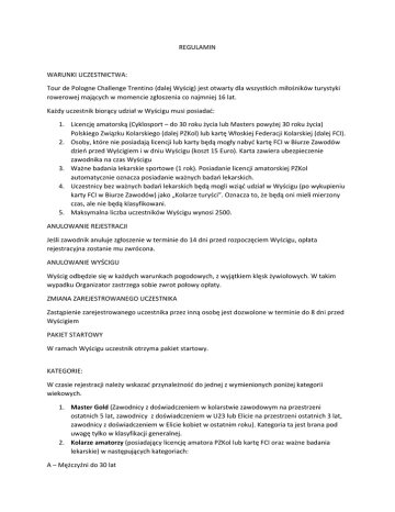 REGULAMIN WARUNKI UCZESTNICTWA: Tour de Pologne Challenge Trentino (dalej Wyścig) jest otwarty dla wszystkich miłośników turystyki rowerowej mających w momencie zgłoszenia co najmniej 16 lat. Każdy uczestnik biorący udział w Wyścigu musi posiadać: 1. Licencję amatorską (Cyklosport – do 30 roku życia lub Masters powyżej 30 roku życia) Polskiego Związku Kolarskiego (dalej PZKol) lub kartę Włoskiej Federacji Kolarskiej (dalej FCI). 2. Osoby, które nie posiadają licencji lub karty będą mogły nabyć kartę FCI w Biurze Zawodów dzień przed Wyścigiem i w dniu Wyścigu (koszt 15 Euro). Karta zawiera ubezpieczenie zawodnika na czas Wyścigu 3. Ważne badania lekarskie sportowe (1 rok). Posiadanie licencji amatorskiej PZKol automatycznie oznacza posiadanie ważnych badań lekarskich. 4. Uczestnicy bez ważnych badań lekarskich będą mogli wziąć udział w Wyścigu (po wykupieniu karty FCI w Biurze Zawodów) jako „Kolarze turyści”. Oznacza to, że będą oni mieli mierzony czas, ale nie będą klasyfikowani. 5. Maksymalna liczba uczestników Wyścigu wynosi 2500. ANULOWANIE REJESTRACJI Jeśli zawodnik anuluje zgłoszenie w terminie do 14 dni przed rozpoczęciem Wyścigu, opłata rejestracyjna zostanie mu zwrócona. ANULOWANIE WYŚCIGU Wyścig odbędzie się w każdych warunkach pogodowych, z wyjątkiem klęsk żywiołowych. W takim wypadku Organizator zastrzega sobie zwrot połowy opłaty. ZMIANA ZAREJESTROWANEGO UCZESTNIKA Zastąpienie zarejestrowanego uczestnika przez inną osobę jest dozwolone w terminie do 8 dni przed Wyścigiem PAKIET STARTOWY W ramach Wyścigu uczestnik otrzyma pakiet startowy. KATEGORIE: W czasie rejestracji należy wskazać przynależność do jednej z wymienionych poniżej kategorii wiekowych. 1. Master Gold (Zawodnicy z doświadczeniem w kolarstwie zawodowym na przestrzeni ostatnich 5 lat, zawodnicy z doświadczeniem w U23 lub Elicie na przestrzeni ostatnich 3 lat, zawodnicy z doświadczeniem w Elicie kobiet w ostatnim roku). Kategoria ta jest brana pod uwagę tylko w klasyfikacji generalnej. 2. Kolarze amatorzy (posiadający licencję amatora PZKol lub kartę FCI oraz ważne badania lekarskie) w następujących kategoriach: A – Mężczyźni do 30 lat B – Mężczyźni w wieku 31-36 lat C – Mężczyźni w wieku 37-42 lat D – Mężczyźni w wieku 43-49 lat E – Mężczyźni w wieku 50-57 lat F – Mężczyźni w wieku 58 lat i powyżej G – Kobiety do 39 lat H – Kobiety w wieku 40 lat i powyżej 3. Kolarze turyści (osoby, którzy wykupią kartę FCI w Biurze Zawodów, ale nie posiadają ważnych badań lekarskich). SEKTORY STARTOWE 1 – Goście i Master Gold 2 – Kolarze amatorzy 3 – Kolarze turyści KLASYFIKACJE 1. Klasyfikacja generalna 2. Klasyfikacja poszczególnych kategorii 3. Dla kolarzy turystów zostanie ogłoszona specjalna lista przybycia na metę z czasami osiągniętymi przez poszczególnych zawodników. Uczestnicy, którzy nie podadzą daty urodzenia na formularzu rejestracyjnym nie będą kwalifikowali się do klasyfikacji poszczególnych kategorii. POMIAR CZASU Pomiar czasu będzie prowadzony przez technologię MySDAM opartą na zastosowaniu chipów, które będzie można wypożyczyć w Biurze Zawodów. Kaucja za chip wynosi 10 Euro i zostanie zwrócona uczestnikowi, jeśli ten zwróci chip do Biura Zawodów w ciągu 15 minut od zakończenia Wyścigu. Brak lub niewłaściwie wykorzystanie chipa może spowodować brak uwzględnienia w klasyfikacji i brak oficjalnego czasu. TRASA Trasa Wyścigu zostanie oznaczona znakami określonymi przez Organizatora. ZABEZPIECZENIE MEDYCZNE Na trasie Wyścigu będą rozstawione ambulanse z personelem medycznym. KASKI Uczestnik może wziąć udział w Wyścigu tylko w kasku sztywnym spełniającym wymogi Unii Europejskiej. POJAZDY Jedynie pojazdy dopuszczone przez Organizatora mogą poruszać się po trasie wyścigu. DYSKWALIFIKACJA Uczestnik jadący z numerem innego uczestnika albo ten, który popełnia czyn uznany za szkodliwy przez Organizatora zostanie wykluczony z rywalizacji. Wszelkie wykroczenia sportowe i techniczne będą podlegały sankcji. POWRÓT NA MIEJSCE STARTU Po zakończeniu wyścigu będzie możliwy transfer na miejsce startu (koszt 20 Euro razem z rowerem). Usługa dostępna wyłącznie po wcześniejszej rezerwacji. ZASADY Samochody z napisem „Początek Wyścigu” i „Koniec Wyścigu” będą wyznaczały obszar, w którym uczestnicy Wyścigu mogą się swobodnie poruszać. Samochód z napisem „Koniec Wyścigu” będzie zamykał Wyścig z zachowaniem maksymalnego ustalonego czasu na przeprowadzenie Wyścigu. REGULAMIN: Organizatorzy zastrzegają sobie prawo do wprowadzania ewentualnych zmian przepisów w każdym momencie. Zmiany będą publikowane na oficjalnej stronie wydarzenia. Dla każdej pozycji, nie objętej tym regulaminem, będą stosowane normalne zasady FCI (z ewentualnymi zmianami). OGÓLNE ZASADY UCZESTNICTWA: Uczestnicząc, zawodnicy potwierdzają, że: 1. 2. 3. 4. 5. Przeczytali i zrozumieli wszystkie zasady. Spełniają wymagania określone przepisami. Rozumieją charakter imprezy i są w stanie fizycznym umożliwiającym udział w Wyścigu. Zobowiązują się do przestrzegania zasad i słuchania obsługi. Pozwalają na wykorzystanie ich danych przez pracowników organizatora imprezy zgodnie z DL 196, 30 czerwca 2003. 6. Wyrażają zgodę na korzystanie ze zdjęć, video i nagrań z ich udziałem do uzasadnionych celów, w tym reklamy. 7. Zwalniają Organizatora, partnerów, dostawców, pracowników, sponsorów i współpracowników z odpowiedzialności za konsekwencje wynikające z udziału w samej imprezie.