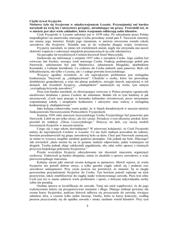 Ciężki żywot fryzjerów Niełatwo żyło się fryzjerom w międzywojennym Lesznie. Przynajmniej oni bardzo narzekali na swój los i nieżyciowe przepisy, utrudniające im pracę. Twierdzili też, że w mieście jest zbyt wiele zakładów, które wzajemnie odbierają sobie klientów. Cech Fryzjerski w Lesznie założono już w 1670 roku. Po odzyskaniu przez Polskę niepodległości na stanowisko starszego Cechu powołany został pan F. Nawrocik (niestety nie znamy jego imienia). Dzięki jego staraniom, w mieście utworzona została szkoła zawodowa dla fryzjerów. Działała ona aż do wybuchu drugiej wojny światowej. Fryzjerzy narzekali, że mimo ich wieloletnich starań, nigdy nie otrzymała ona nawet złotówki wsparcia z subwencji miejskich przeznaczonych na cele szkolnictwa. Na początku lat trzydziestych Cechem kierował Józef Marczyński. Zachowała się informacja z sierpnia 1937 roku o zarządzie Cechu. Jego szefem był wówczas Jan Szykny, noszący tytuł starszego Cechu. Funkcję podstarszego pełnił pan Nawrocik, sekretarzem był pan Machowicz, sekretarzem Mizgalski, skarbnikiem Kostański, a Lehman ławnikiem. Co ciekowe do Cechu należeli sami panowie. Było ich kilkudziesięciu, nie tylko z Leszna, ale i z całego powiatu leszczyńskiego. Wszyscy zgodnie twierdzili, że ich największym problemem jest nielegalna konkurencja. Nazywali ją „chałupnictwem”. Chodziło o osoby, które nie prowadząc działalności gospodarczej, a więc nie płacąc podatków, strzygły innych, najczęściej w ich domach. Jak twierdzili fryzjerzy, „chałupników” namnożyło się wielu, tym samym „wyrządzają krzywdę zawodowi.” Poza tym bardzo narzekali, że obowiązujące wówczas w Polsce przepisy ograniczały możliwości działania i prawa Cechów do minimum. Bolało ich to tym bardziej iż jak utrzymywali „Cech nasz pracuje w kierunku kulturalno oświatowym, przez utrzymanie wspomnianej szkoły i urządzanie konkursów i odczytów oraz walczy z nielegalną konkurencją tj. chałupnictwem.” Jako kolejną ciekawostkę warto podać, że w latach dwudziestych w naszym mieście funkcjonowało Stowarzyszenie Pomocników Fryzjerskich. Jesienią 1938 roku starszym leszczyńskiego Cechu Fryzjerskiego był ponownie pan Nawrocik. Lubił on nie tylko strzyc, ale też i pisać. Świadczy o tym obszerny artykuł, który przesłał do redakcji „Głosu Leszczyńskiego.” Dotyczy on doli, czy raczej niedoli ówczesnych fryzjerów w naszym mieście. Czego się z tego tekstu dowiadujemy? W pierwszej kolejności, że Cech Fryzjerski należy do największych Cechów w Lesznie. Co nie było żadnym powodem do radości, bowiem przedstawicieli tej grupy zawodowej było za dużo. Choć pan Nawrocik zaznaczał, że mimo to wszyscy mogliby zarabiać godziwe pieniądze. Tak jednak nie było. Dlaczego? Jak stwierdził „dużo można by na to pytanie znaleźć odpowiedzi, jedne ważniejsze od drugich. Trzeba jednak objąć całokształt zagadnienia, aby zdać sobie sprawę z istotnych przyczyn kiepskiego położenia fryzjerstwa.” Przede wszystkim fryzjerzy zdecydowanie nie doceniali znaczenia organizacji cechowej. Traktowali ją bardzo obojętnie, mimo że chodziło o sprawy zawodowe, a więc pierwszorzędnego znaczenia. Kolejny zarzut jaki stawiał swoim kolegom to partactwo. Mówił wprost, że wielu fryzjerów nie potrafi dobrze strzyc, a tylko garstka ciągle szkoli się i podnosi swe zawodowe umiejętności. Przy czym jeszcze raz powtórzył, że zmienić, by to mogła powszechna przynależność fryzjerów do Cechu. Ten bowiem potrafi wpłynąć na nich pozytywnie, także zmobilizować do ciągłej nauki wykonywanego zawodu. Poza tym silny Cech jest też w stanie załatwić wiele problemów i spraw, z którymi indywidualne osoby sobie nie poradzą. Osobna sprawa to kwalifikacje do zawodu. Tutaj nie miał wątpliwości, że do jego wykonywania należy się przygotowywać starannie i długo. Dlatego zniknąć powinny tak zwane kursy fryzjerskie, podczas których odbywa się przyuczenie do zawodu, trwające zaledwie dwa, a czasem tylko jeden miesiąc. Osoby, które te kursy kończyły, według prezesa przyczyniały się do upadku zawodu i utraty zaufania wśród klientów. Przy tym 1 było to nieuczciwe wobec fryzjerów, którzy rzetelnie uczyli się swego zawodu przez kilka lat. I sprawa, która zawsze wzbudza największe emocje, czyli pieniądze. Fryzjerzy w Lesznie nie potrafili ustalić jednego cennika, za świadczone usługi. Pan Nawrocik uważał, że taki cennik powinien obowiązywać w całym mieście i powiecie. Przy czym, by faktycznie udało się go ustalić, wszyscy powinni należeć do Cechu Fryzjerskiego. Jak napisał „uniknąć można by przez to wielu przykrych rzeczy, a ułatwiona w ten sposób praca dawać by mogła dużo lepsze i korzystniejsze pod względem materialnym rezultaty.” W ten sposób ponownie doszliśmy do wcześniejszego wątku, czyli przynależności do Cechu. Kończąc swe wywody pan Nawrocik jeszcze raz nawoływał wszystkich fryzjerów, by do niego przystąpili. Na koniec stwierdził „gdy ogół dużo zyska, zyska i jednostka.” Damian Szymczak Źródła: Głosy Leszczyńskie, numery: 178 z 1937 r., 222 z 1938 r., Księga adresowa miasta Leszna z 1930 r. 2