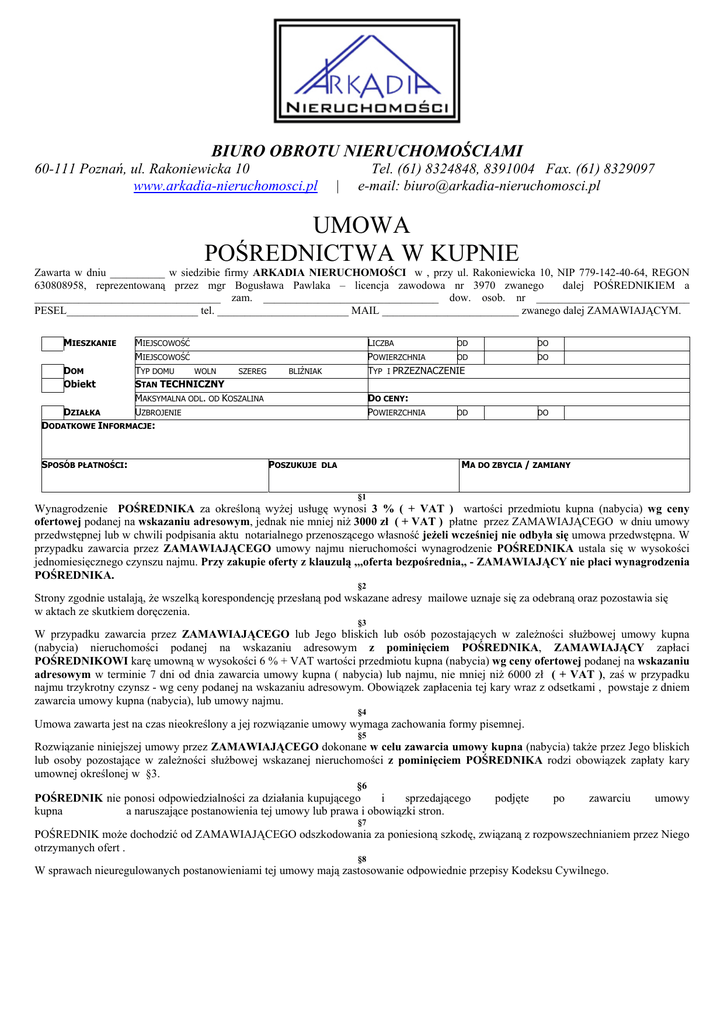 BIURO OBROTU NIERUCHOMOŚCIAMI 60-111 Poznań, ul. Rakoniewicka 10 www.arkadia-nieruchomosci.pl | Tel. (61) 8324848, 8391004 Fax. (61) 8329097 e-mail: [email protected] UMOWA POŚREDNICTWA W KUPNIE Zawarta w dniu __________ w siedzibie firmy ARKADIA NIERUCHOMOŚCI w , przy ul. Rakoniewicka 10, NIP 779-142-40-64, REGON 630808958, reprezentowaną przez mgr Bogusława Pawlaka – licencja zawodowa nr 3970 zwanego dalej POŚREDNIKIEM a __________________________________ zam. ________________________________ dow. osob. nr ____________________________ PESEL________________________ tel. ________________________ MAIL _________________________ zwanego dalej ZAMAWIAJĄCYM. MIESZKANIE MIEJSCOWOŚĆ MIEJSCOWOŚĆ DOM TYP DOMU WOLN SZEREG Obiekt STAN TECHNICZNY MAKSYMALNA ODL. OD KOSZALINA DZIAŁKA UZBROJENIE DODATKOWE INFORMACJE: SPOSÓB PŁATNOŚCI: LICZBA OD POWIERZCHNIA OD TYP I PRZEZNACZENIE BLIŹNIAK DO CENY: POWIERZCHNIA POSZUKUJE DLA DO DO OD DO MA DO ZBYCIA / ZAMIANY §1 Wynagrodzenie POŚREDNIKA za określoną wyżej usługę wynosi 3 % ( + VAT ) wartości przedmiotu kupna (nabycia) wg ceny ofertowej podanej na wskazaniu adresowym, jednak nie mniej niż 3000 zł ( + VAT ) płatne przez ZAMAWIAJĄCEGO w dniu umowy przedwstępnej lub w chwili podpisania aktu notarialnego przenoszącego własność jeżeli wcześniej nie odbyła się umowa przedwstępna. W przypadku zawarcia przez ZAMAWIAJĄCEGO umowy najmu nieruchomości wynagrodzenie POŚREDNIKA ustala się w wysokości jednomiesięcznego czynszu najmu. Przy zakupie oferty z klauzulą ,,,oferta bezpośrednia,, - ZAMAWIAJĄCY nie płaci wynagrodzenia POŚREDNIKA. §2 Strony zgodnie ustalają, że wszelką korespondencję przesłaną pod wskazane adresy mailowe uznaje się za odebraną oraz pozostawia się w aktach ze skutkiem doręczenia. §3 W przypadku zawarcia przez ZAMAWIAJĄCEGO lub Jego bliskich lub osób pozostających w zależności służbowej umowy kupna (nabycia) nieruchomości podanej na wskazaniu adresowym z pominięciem POŚREDNIKA, ZAMAWIAJĄCY zapłaci POŚREDNIKOWI karę umowną w wysokości 6 % + VAT wartości przedmiotu kupna (nabycia) wg ceny ofertowej podanej na wskazaniu adresowym w terminie 7 dni od dnia zawarcia umowy kupna ( nabycia) lub najmu, nie mniej niż 6000 zł ( + VAT ), zaś w przypadku najmu trzykrotny czynsz - wg ceny podanej na wskazaniu adresowym. Obowiązek zapłacenia tej kary wraz z odsetkami , powstaje z dniem zawarcia umowy kupna (nabycia), lub umowy najmu. §4 Umowa zawarta jest na czas nieokreślony a jej rozwiązanie umowy wymaga zachowania formy pisemnej. §5 Rozwiązanie niniejszej umowy przez ZAMAWIAJĄCEGO dokonane w celu zawarcia umowy kupna (nabycia) także przez Jego bliskich lub osoby pozostające w zależności służbowej wskazanej nieruchomości z pominięciem POŚREDNIKA rodzi obowiązek zapłaty kary umownej określonej w §3. §6 POŚREDNIK nie ponosi odpowiedzialności za działania kupującego i sprzedającego kupna a naruszające postanowienia tej umowy lub prawa i obowiązki stron. podjęte po zawarciu umowy §7 POŚREDNIK może dochodzić od ZAMAWIAJĄCEGO odszkodowania za poniesioną szkodę, związaną z rozpowszechnianiem przez Niego otrzymanych ofert . §8 W sprawach nieuregulowanych postanowieniami tej umowy mają zastosowanie odpowiednie przepisy Kodeksu Cywilnego. §9 ZAMAWIAJĄCY oświadcza, że zapoznał się z treścią umowy oraz wyraża zgodę na przetwarzanie swoich danych osobowych niezbędnych do realizacji umowy i zgodnie z Ustawą z dnia 29. 08. 97 roku o ochronie danych osobowych. §10 Pośrednik oświadcza iż zgodnie z art. 181 ust. 3 ustawy o gospodarce nieruchomościami jest ubezpieczony od odpowiedzialności cywilnej za szkody, które mogą wyniknąć w związku z wykonywaniem czynności pośrednictwa. __________________________ ZAMAWIAJĄCY – czytelny podpis ______________________ POŚREDNIK